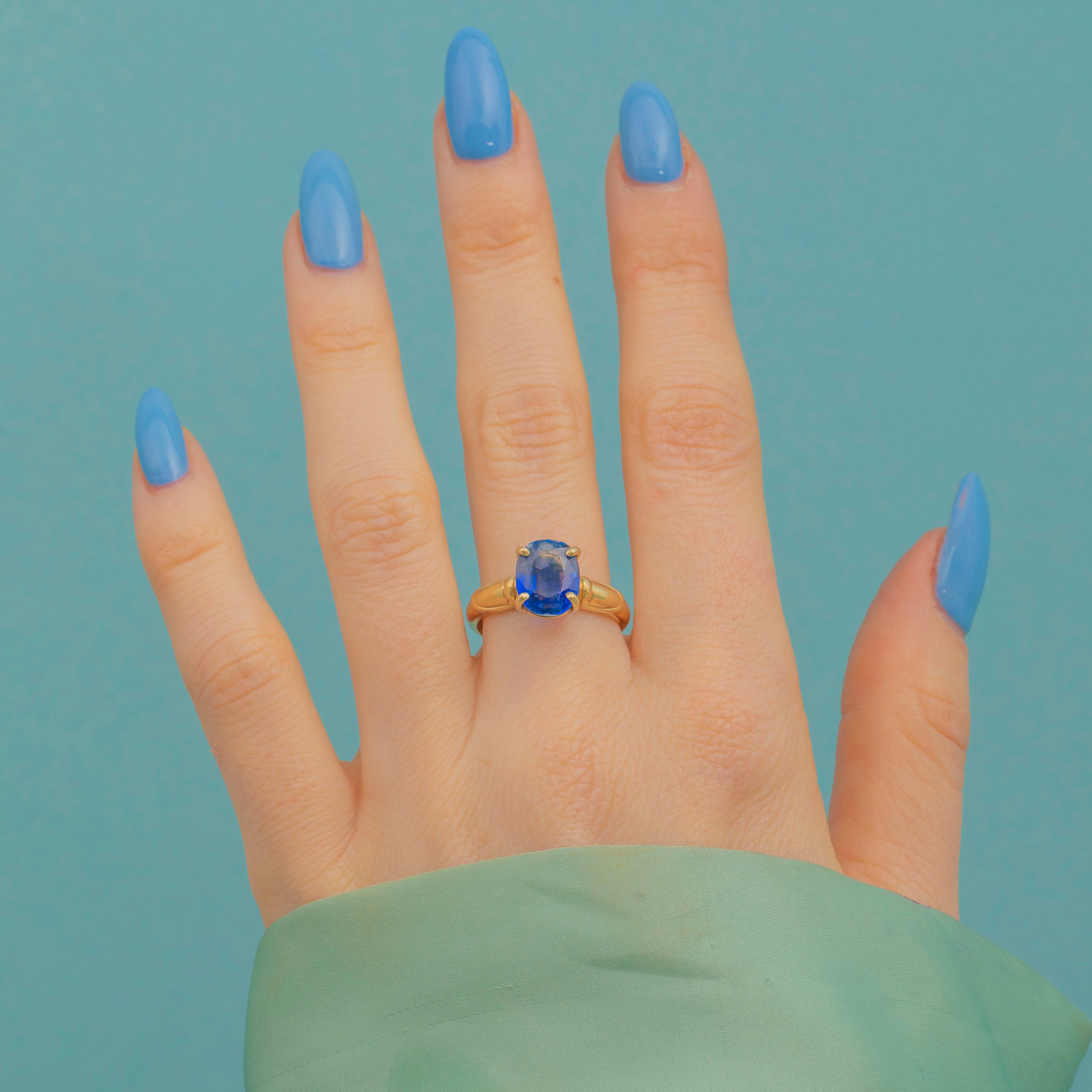 This impressive 9ct Gold natural Sapphire solitaire ring will instantly bring the wow factor to your hand! The vibrant 2.50ct Sapphire is natural, with no signs of heat treatment, and glimmers with eye-catching cerulean-blue hues from its crisp-cut facets.