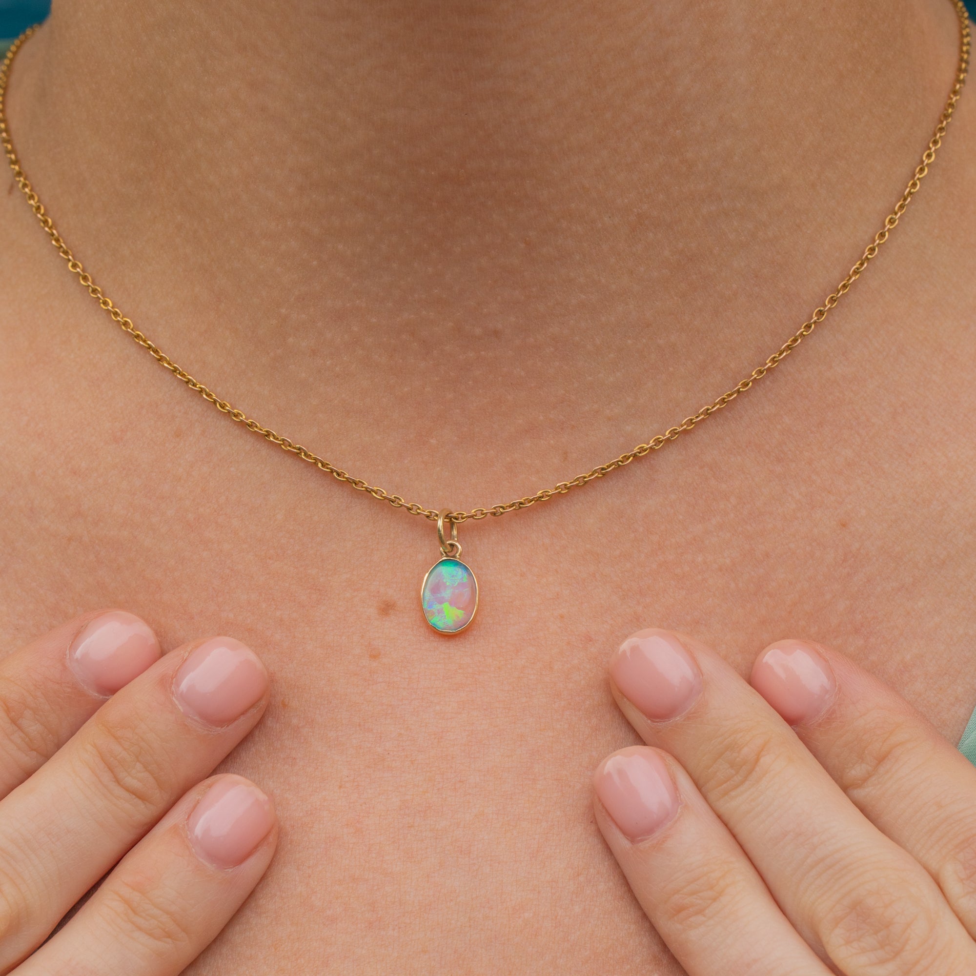 Add a touch of elegance to your jewellery collection with this 9ct Gold bezel-set Opal charm! Crafted with precision and care, this Art Deco pendant features a mesmerising Opal delicately nestled within a buttery 9ct Gold bezel setting. The Opal exhibits a mesmerising array of iridescent hues, shimmering with flashes of vibrant blues, green and orange, encapsulating the essence of ethereal beauty.