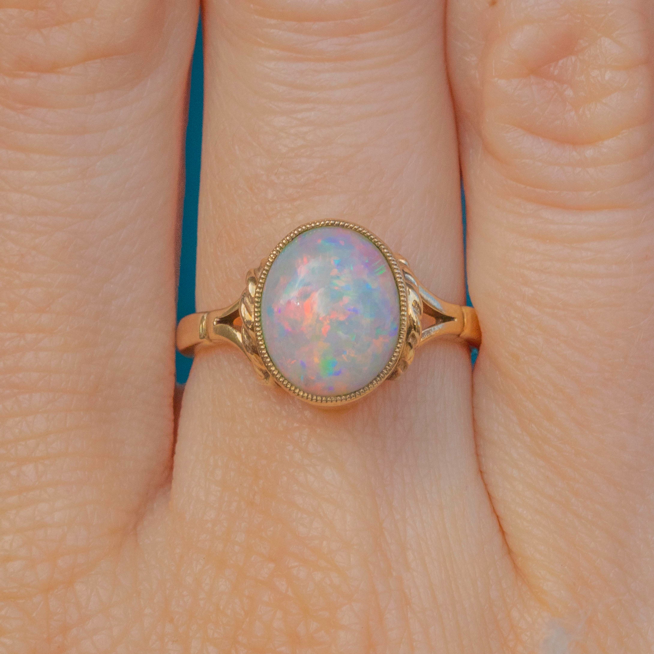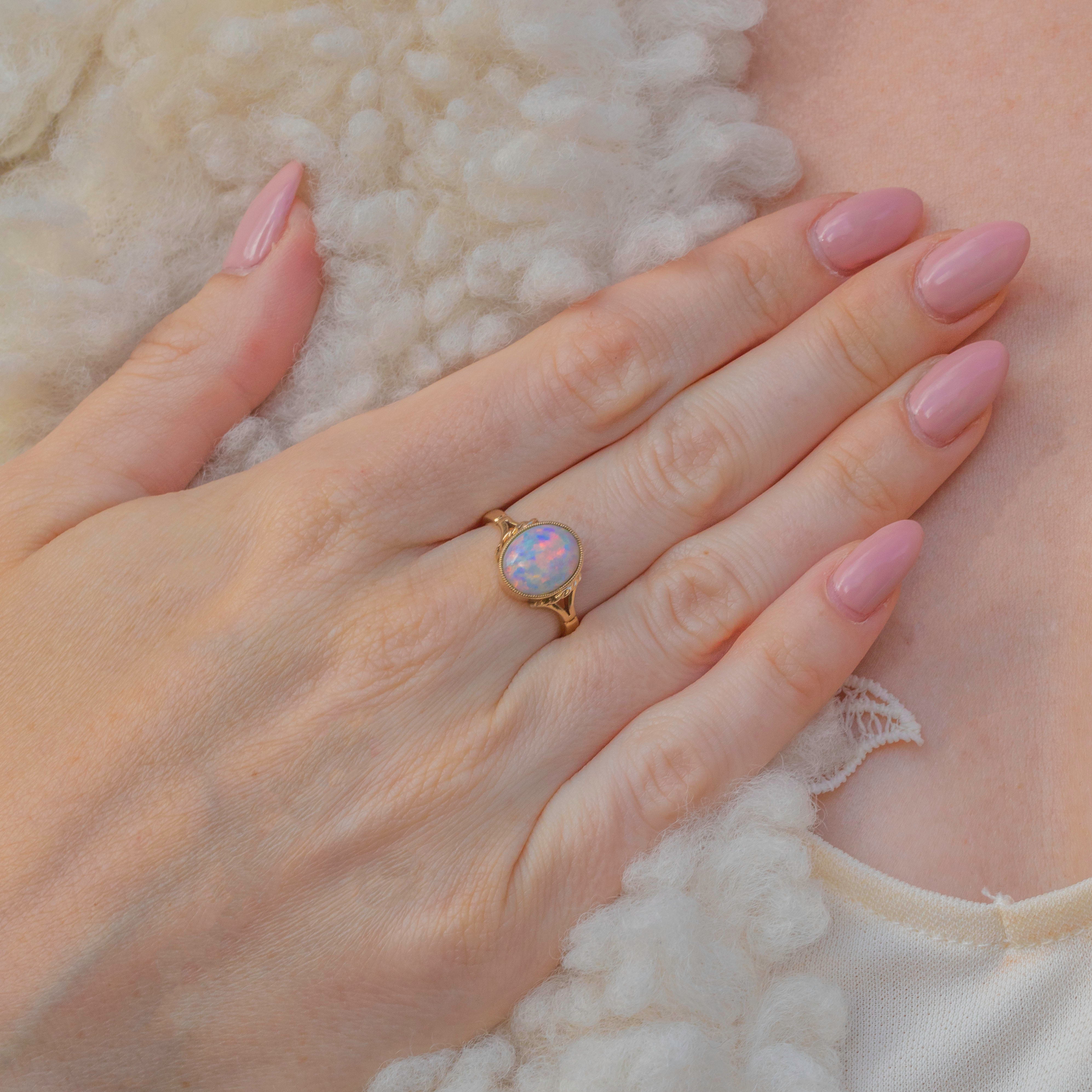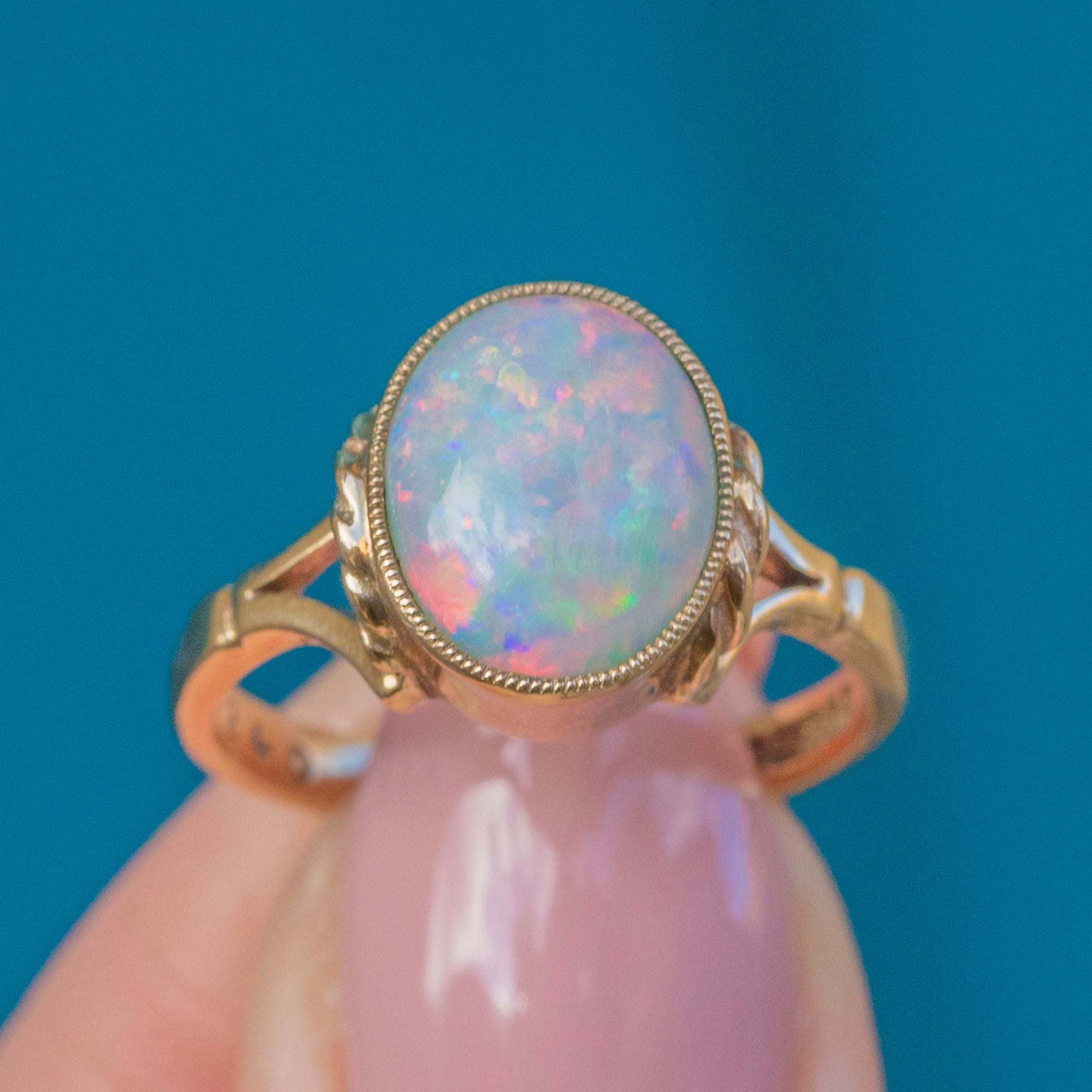 EXCELLENT. This 9ct Gold Opal cabochon ring is in excellent condition! The Opal is secure within its setting, smooth to the touch and provides a wonderful display of hues. The ring band is well formed, with the rope detailing securely soldered to the bezel setting. With a full set of hallmarks, we can accurately date this vintage Opal ring to 1961, and her beauty can be adored just as much today as when she was first made!