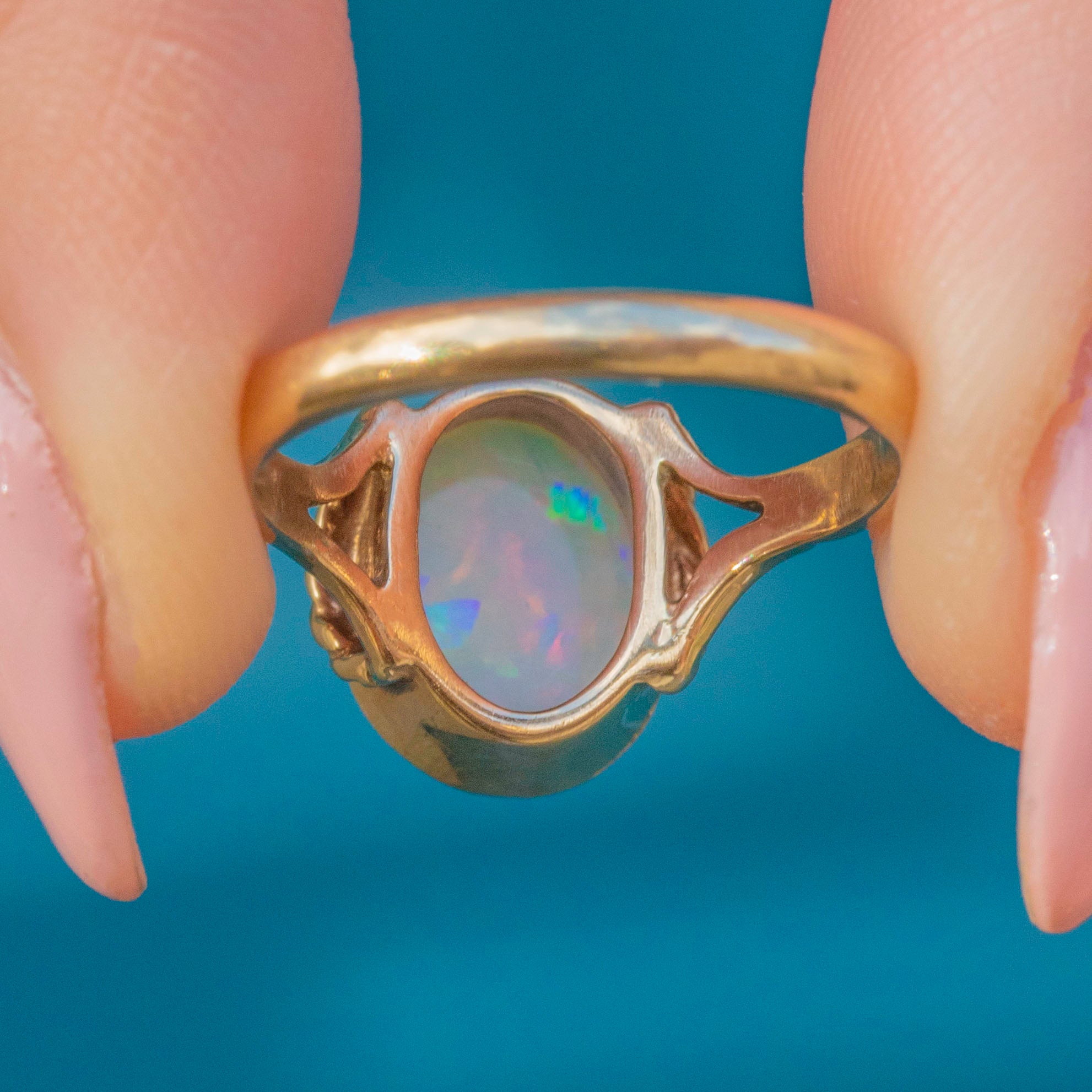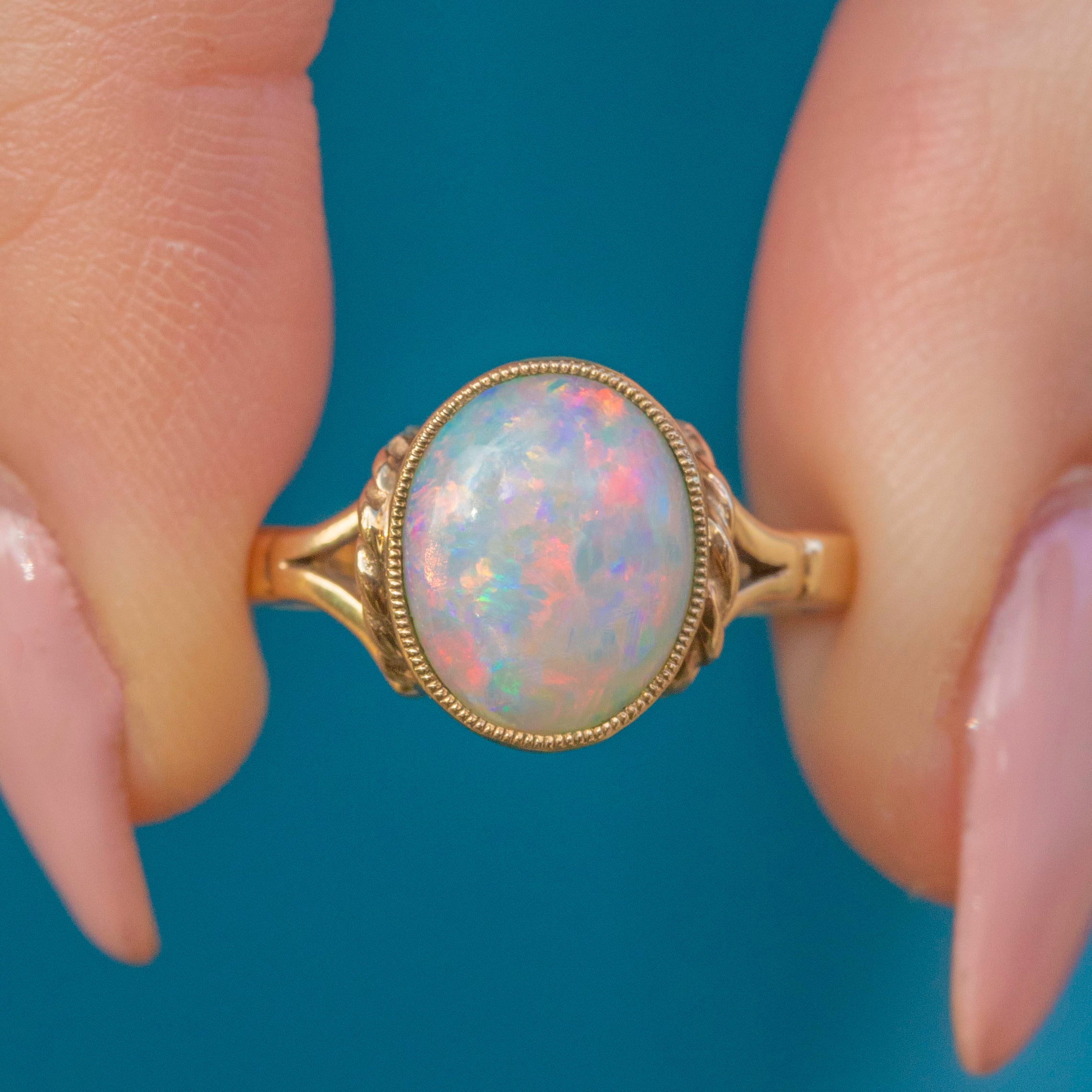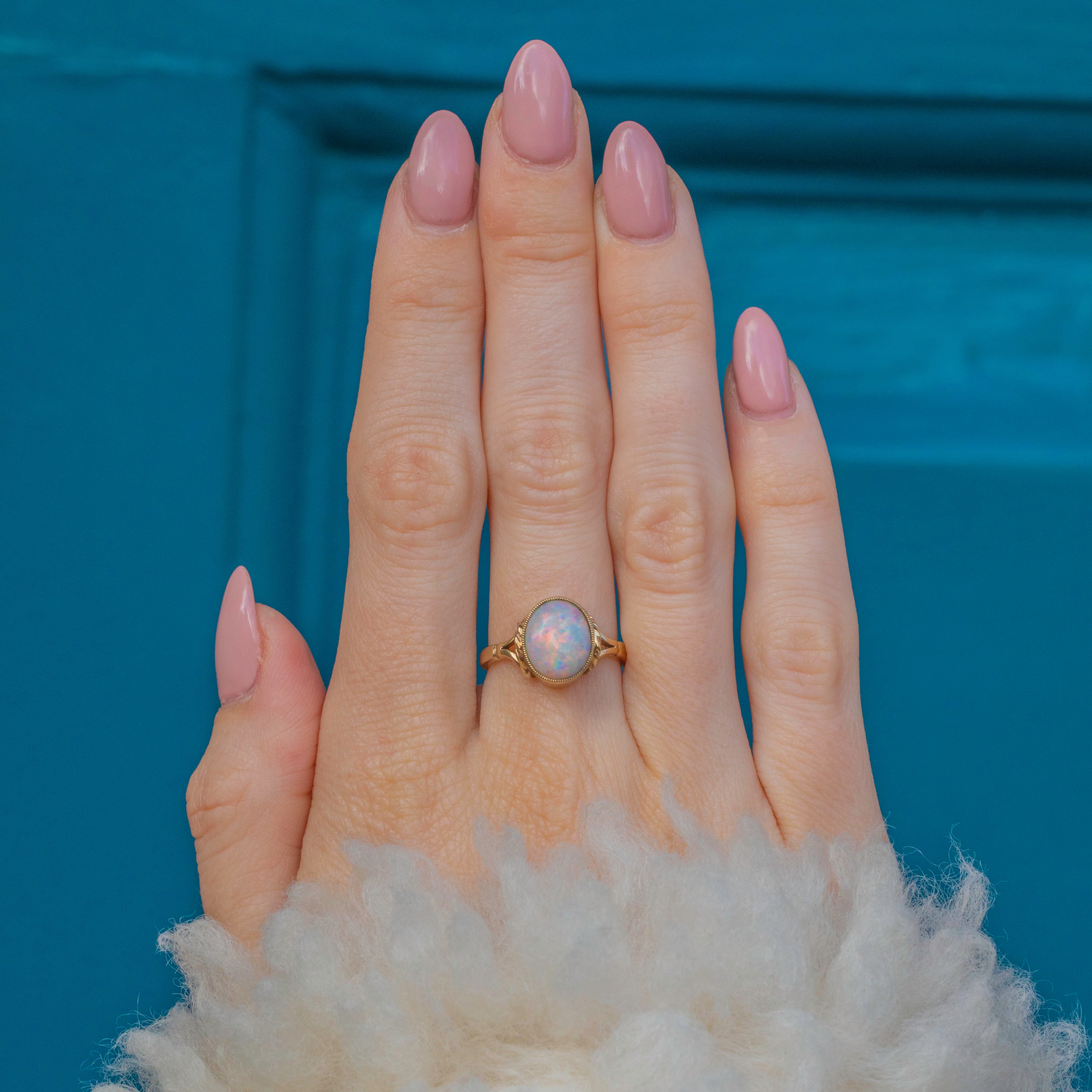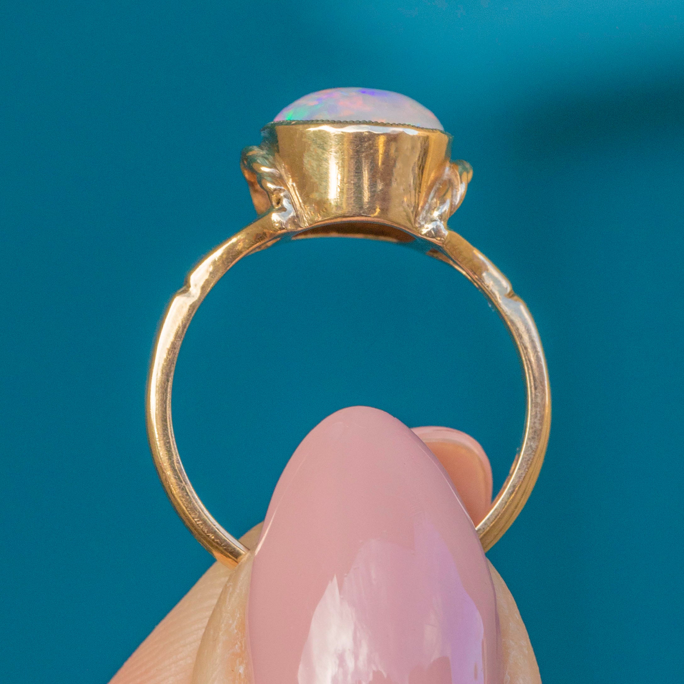 EXCELLENT. This 9ct Gold Opal cabochon ring is in excellent condition! The Opal is secure within its setting, smooth to the touch and provides a wonderful display of hues. The ring band is well formed, with the rope detailing securely soldered to the bezel setting. With a full set of hallmarks, we can accurately date this vintage Opal ring to 1961, and her beauty can be adored just as much today as when she was first made!
