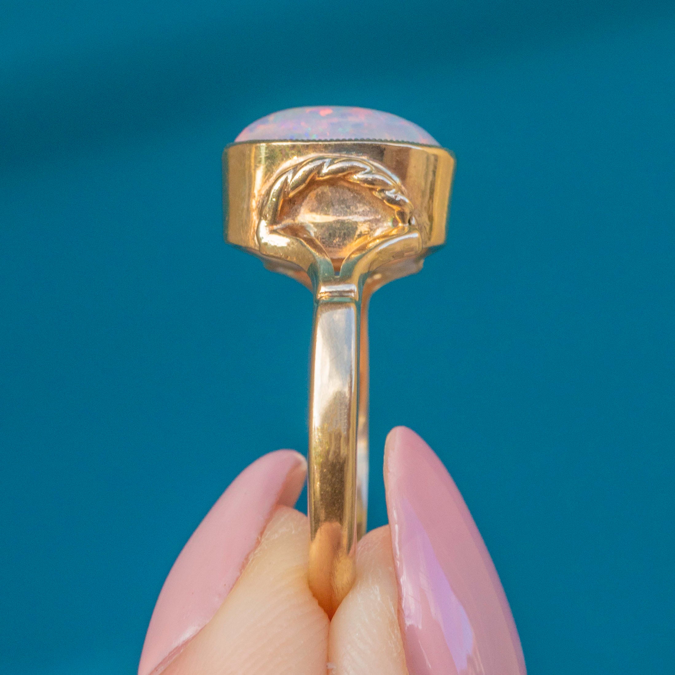 This 9ct Gold Opal cabochon ring is a mid-century delight! Bursting vivid hues of peachy and fuchsia pinks with flashes of lime green, the 1.40ct Opal will mesmerise you the moment you lay eyes on her.