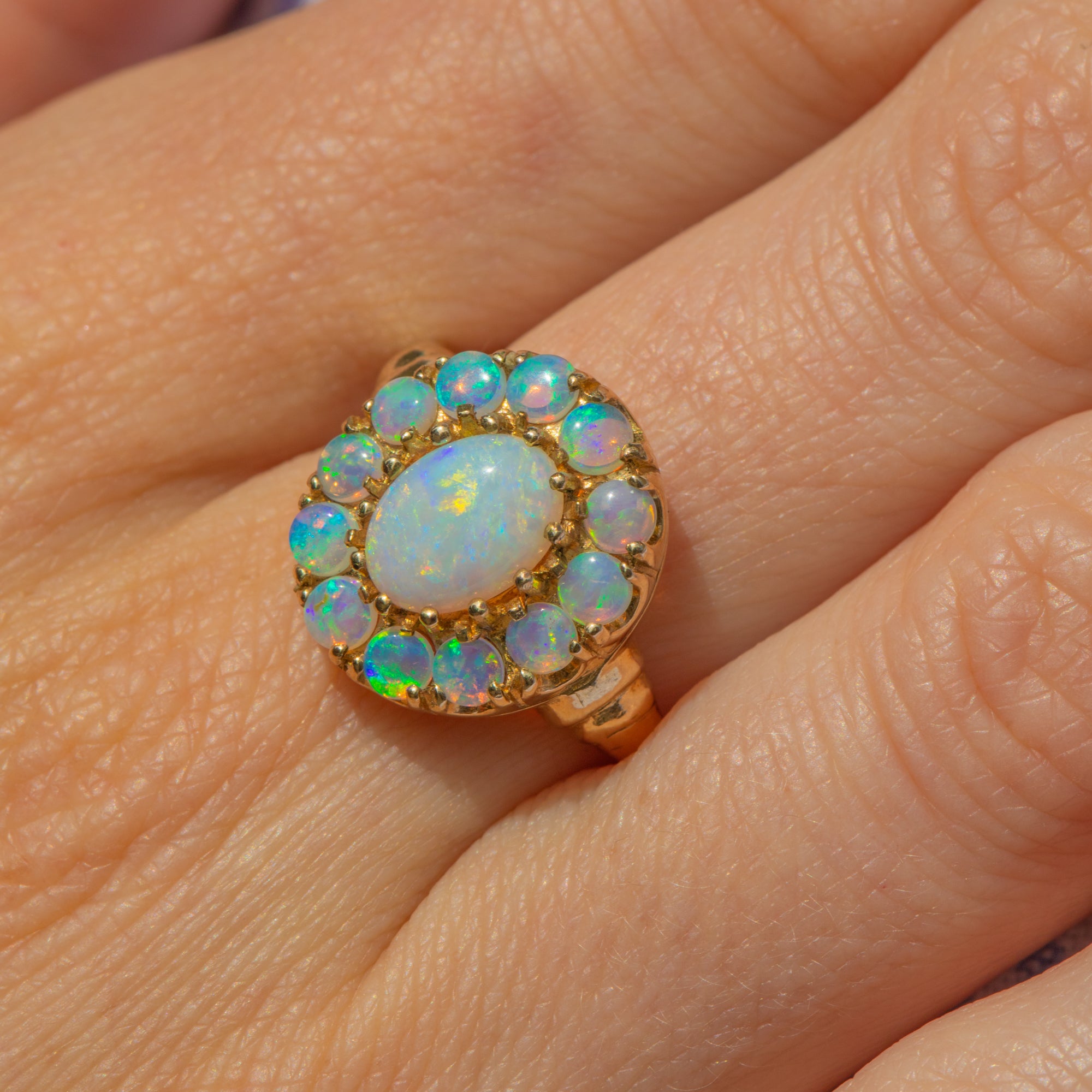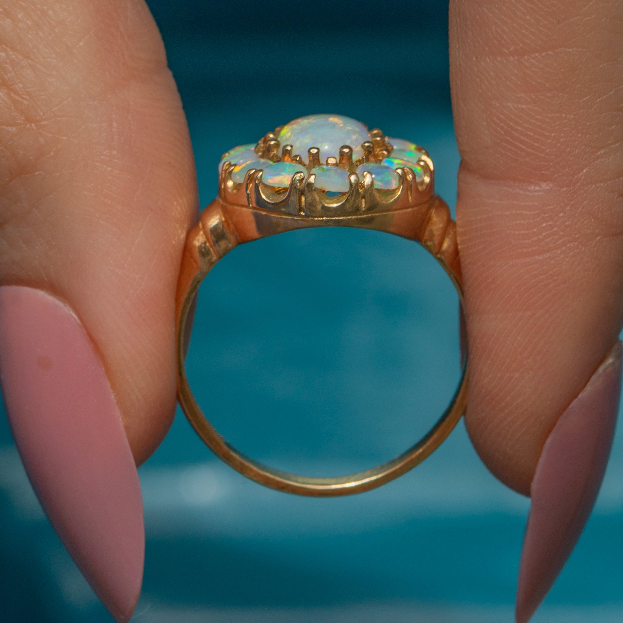 EXCELLENT. This 9ct Gold Opal flower cluster ring is in excellent condition, maintaining its original lustre. The Opals are secure in their setting with a glossy smooth finish. The Gold is buttery and has retained its form well, allowing you to wear it comfortably and securely all day long.