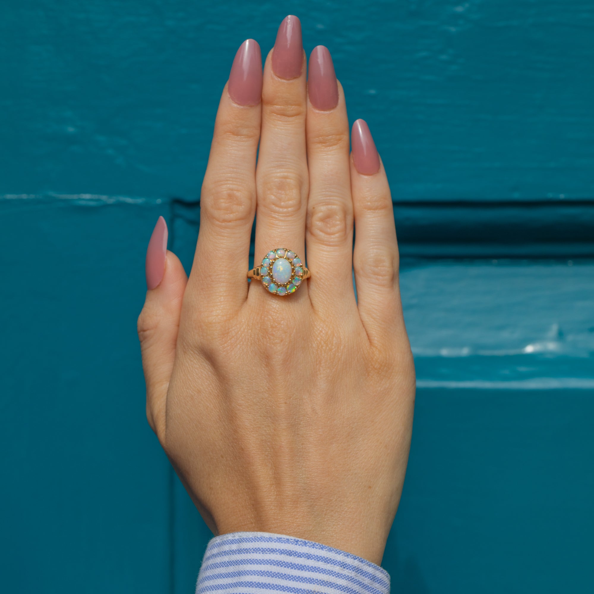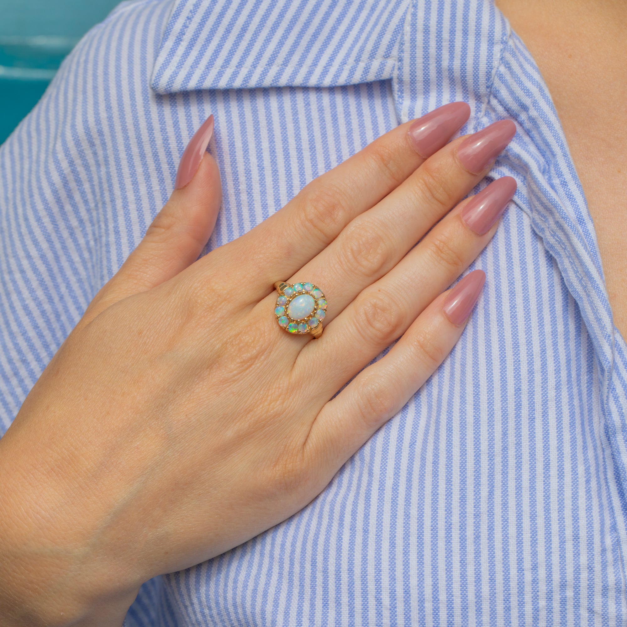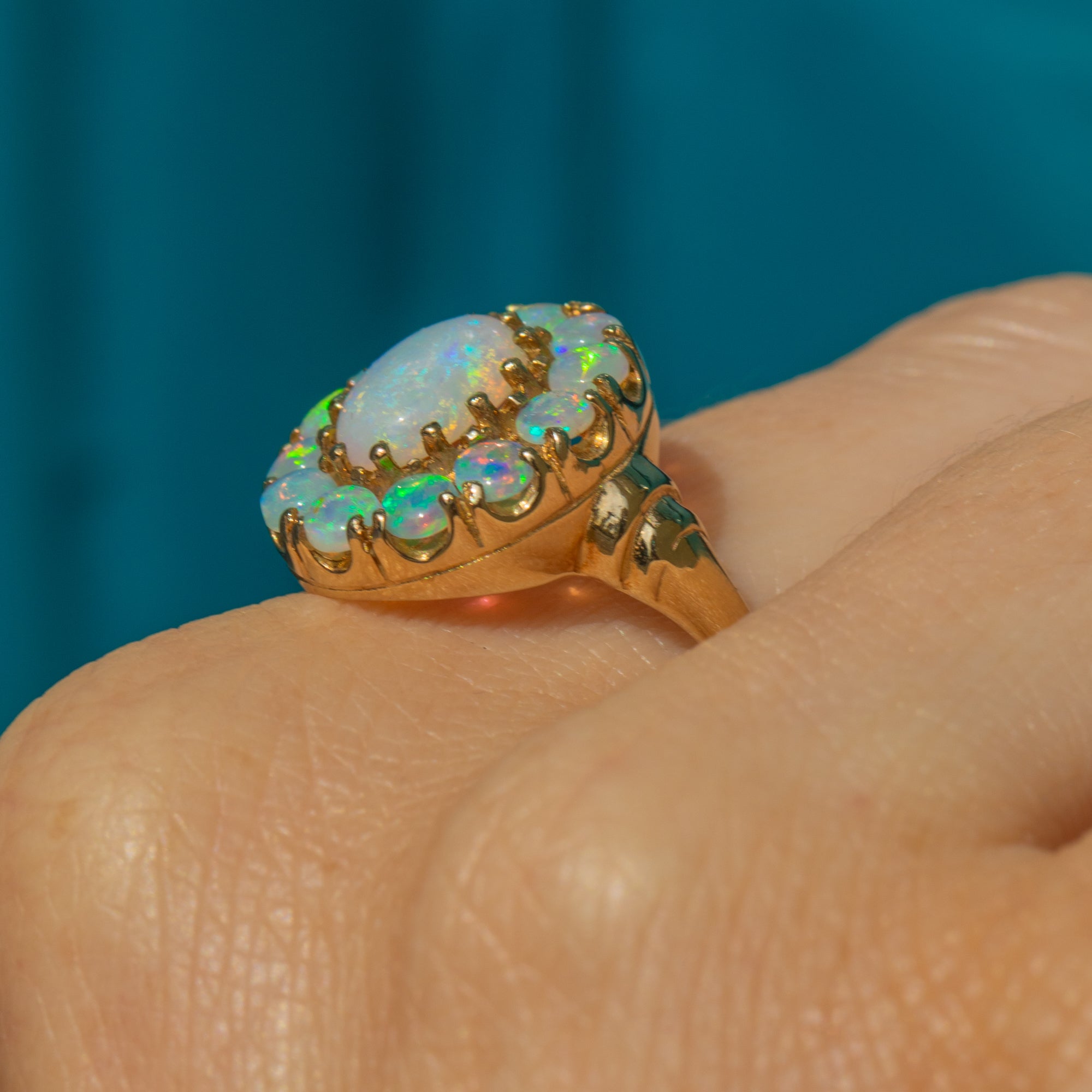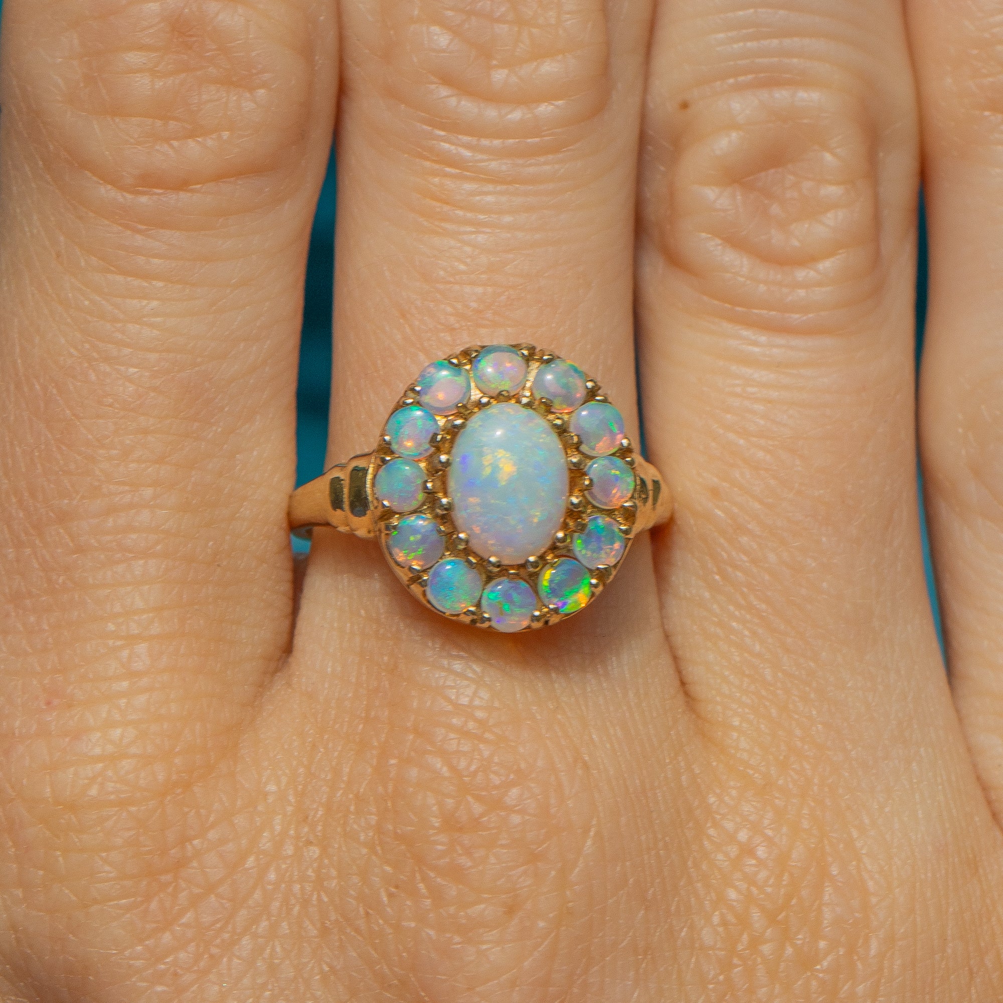 This exquisite 9ct Gold Opal cluster ring epitomises elegance and charm. Her 1.55ct Opal spread exhibits a captivating play of colours, ranging from ethereal blues to luminous green, speckled with neon orange and reds, providing ample finger coverage.