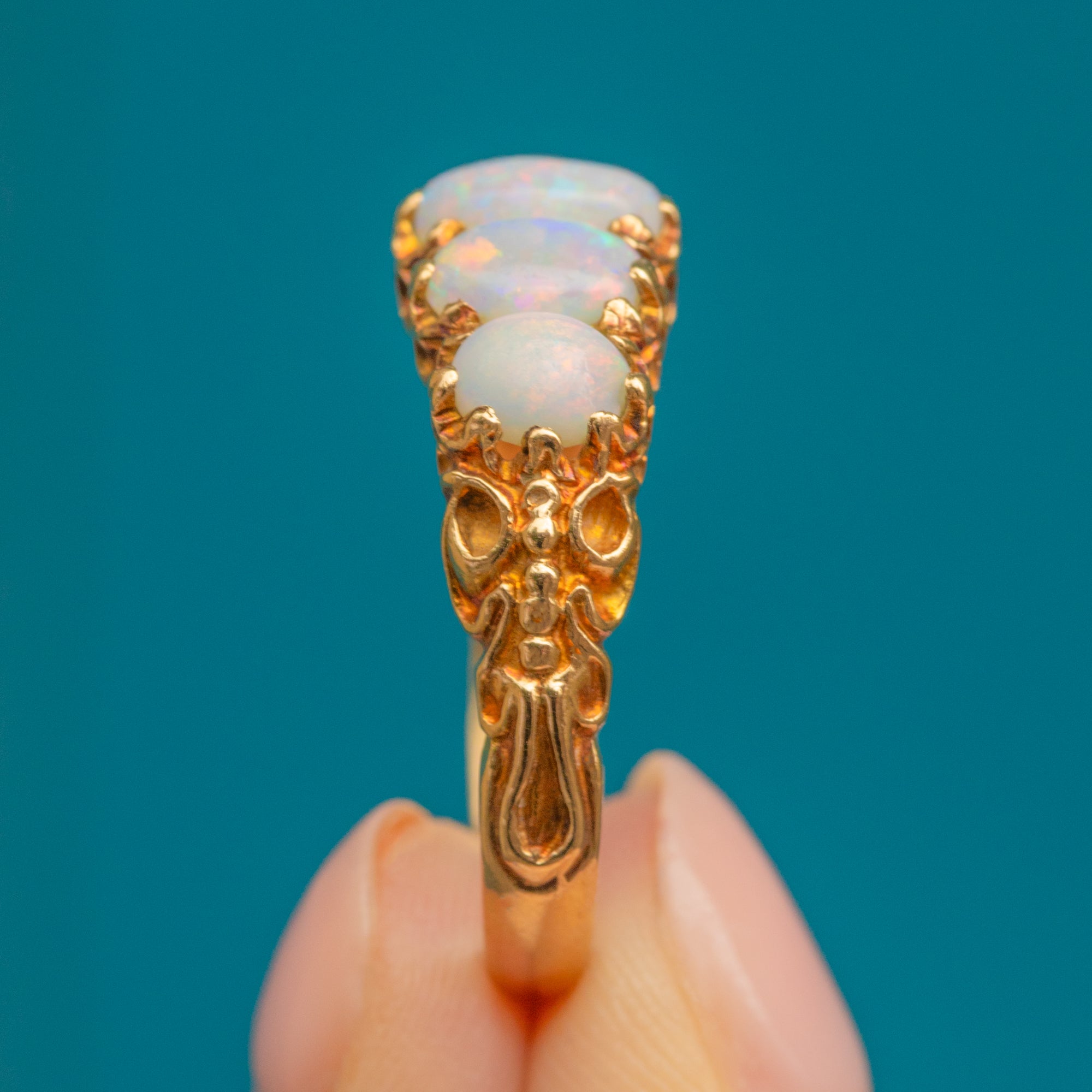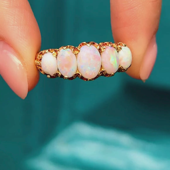 A stunning antique 9ct Gold Opal Diamond five-stone ring to bring you all the right kinds of attention! With a total spread of 1.51ct, each Opal boasts glowing purples, blues and greens, with mesmerising flashes of iridescence appearing under the light.