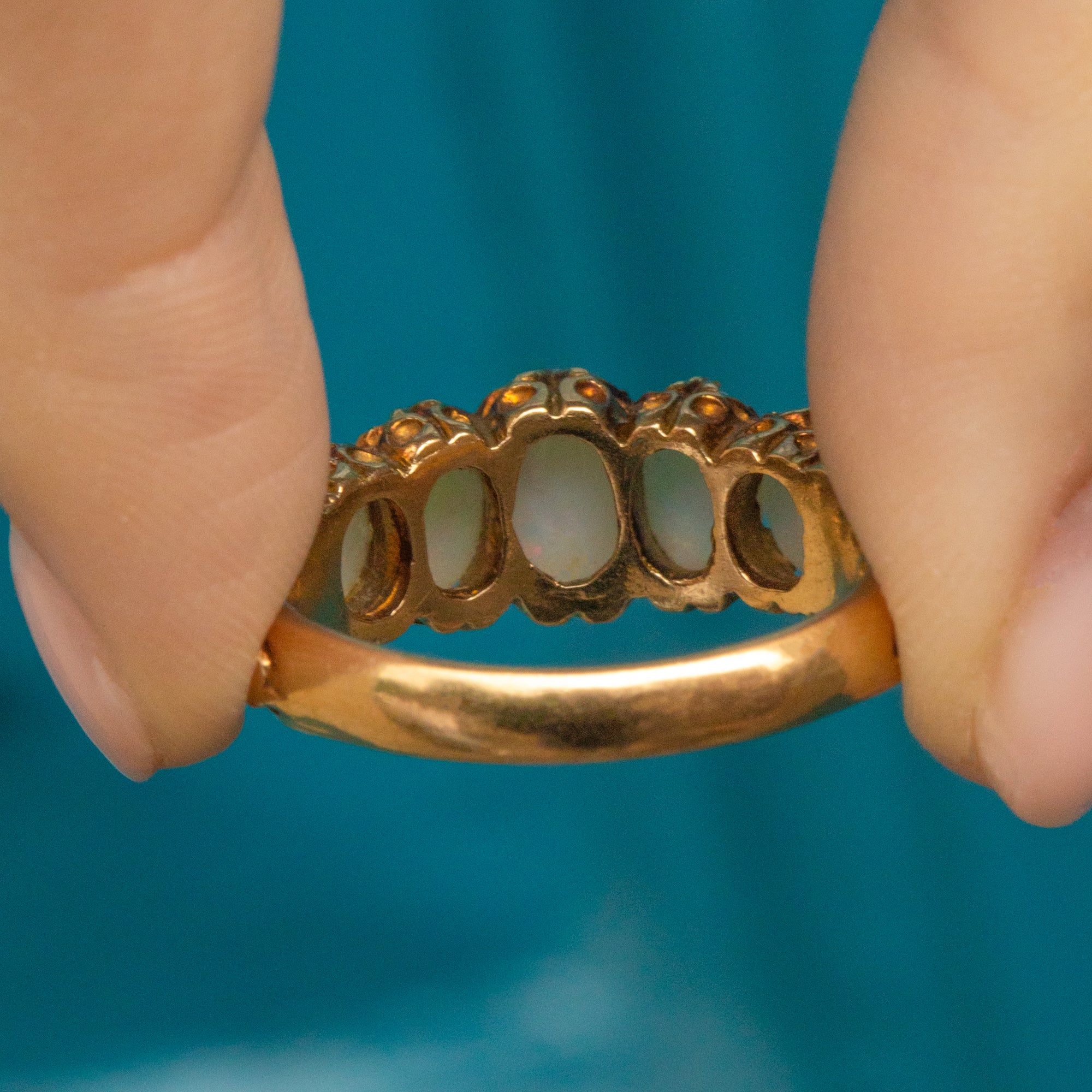 EXCELLENT. This antique 9ct Gold Opal Diamond five-stone ring is offered in excellent condition. Each Opal is securely set and sensuously smooth to the touch. The Gold is bright and buttery with the smooth band providing secure and comfortable wear.