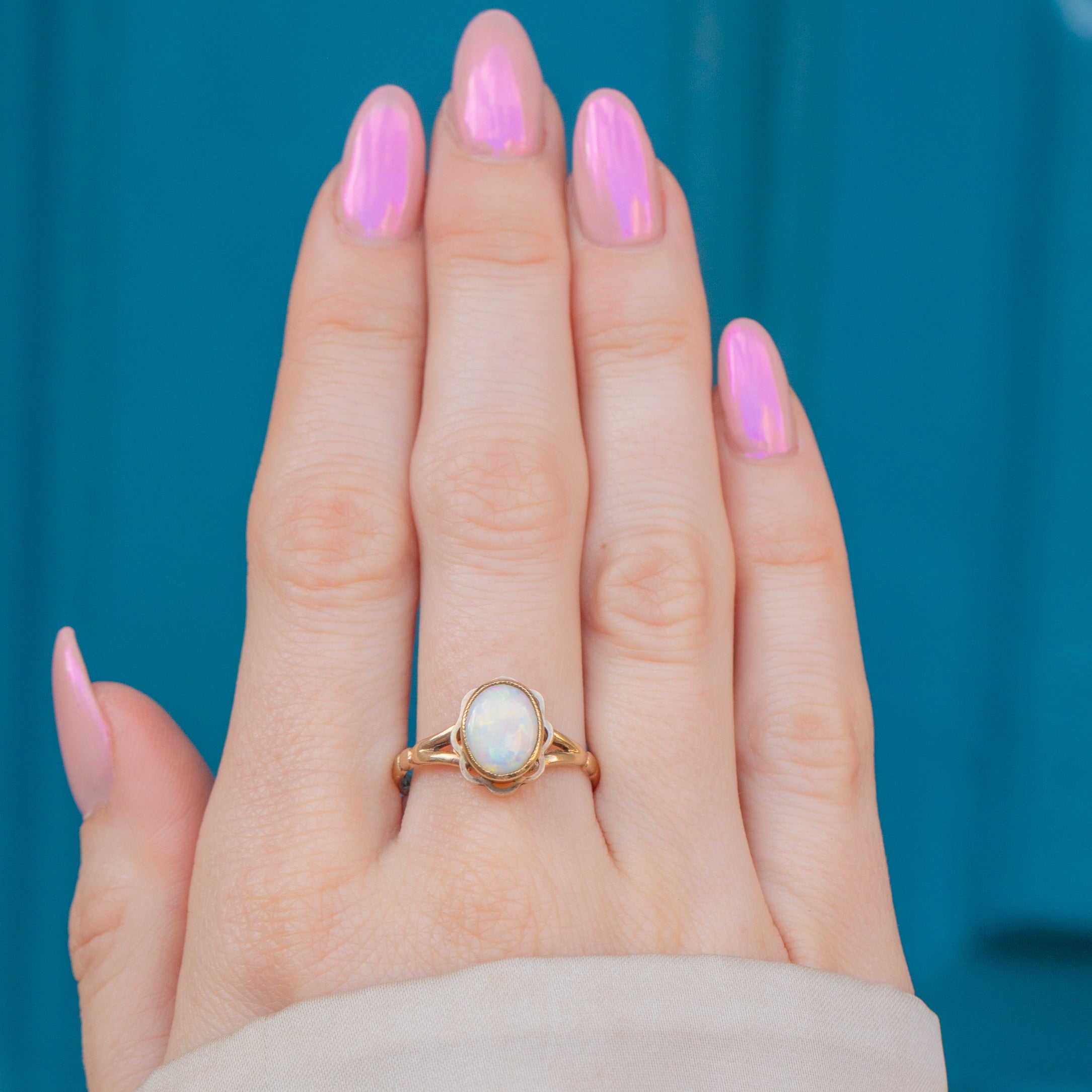 EXCELLENT. This 9ct Gold Opal ring is in superb condition. There is little to report, her 0.62ct Opal cabochon is lively and vibrant, free from any damage to note. A simply stunning vintage piece to add to your collection!