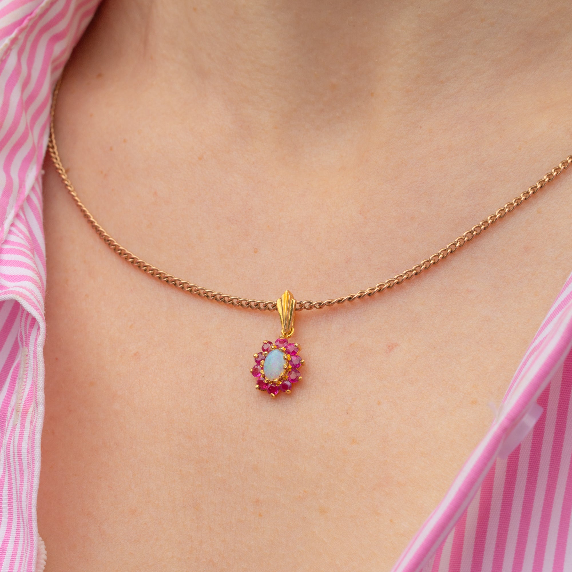 This 9ct Gold Opal ruby flower cluster charm is bursting with vibrancy and opulence! A fiery Opal is poised at her centre, with a galactic display of neon greens and vivid peach flashing across her surface. A halo of fuchsia Rubies encases her Opal, bringing femininity in abundance to this vintage cluster pendant.