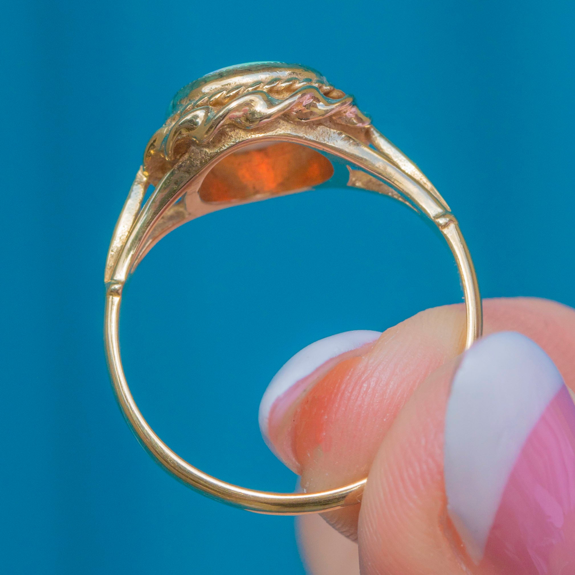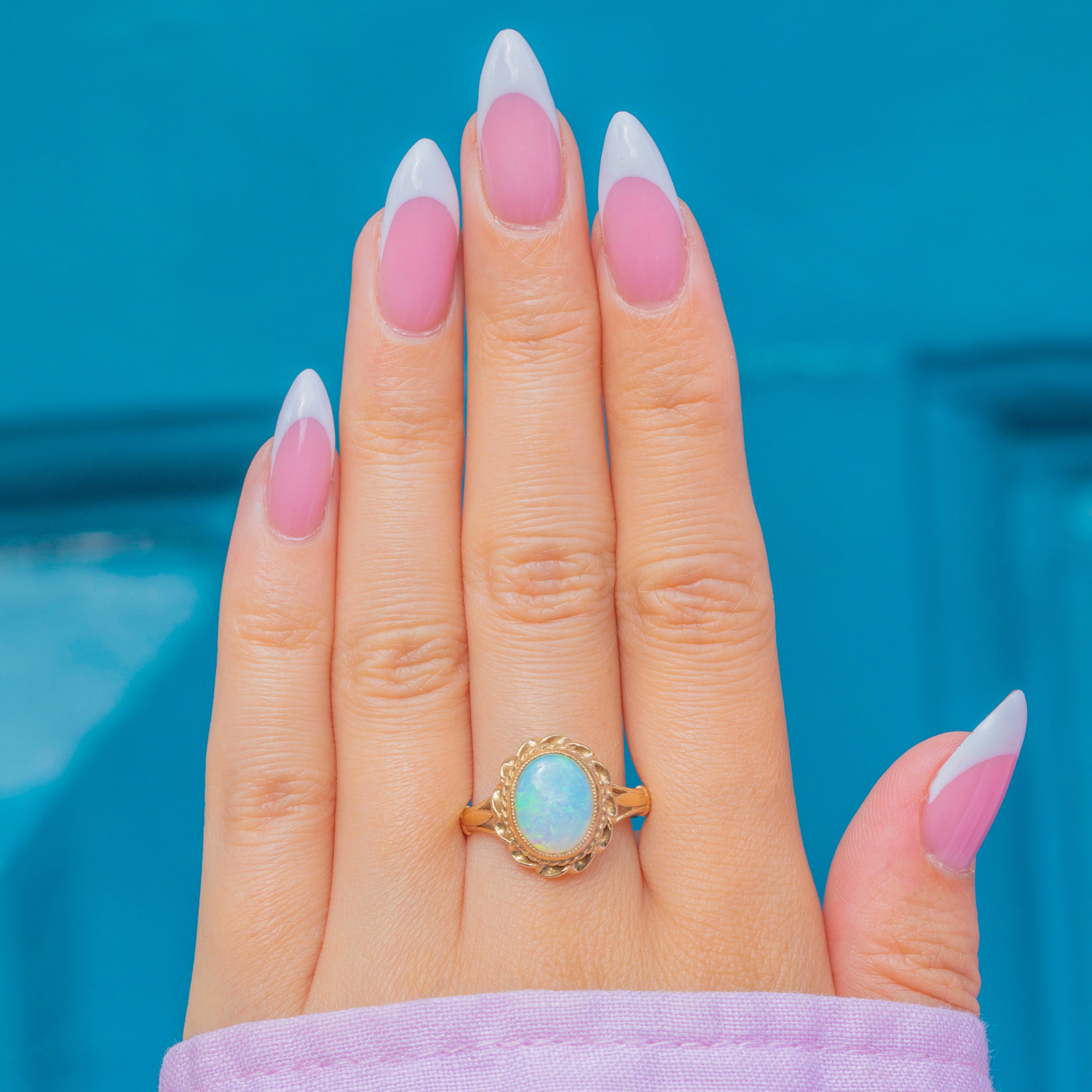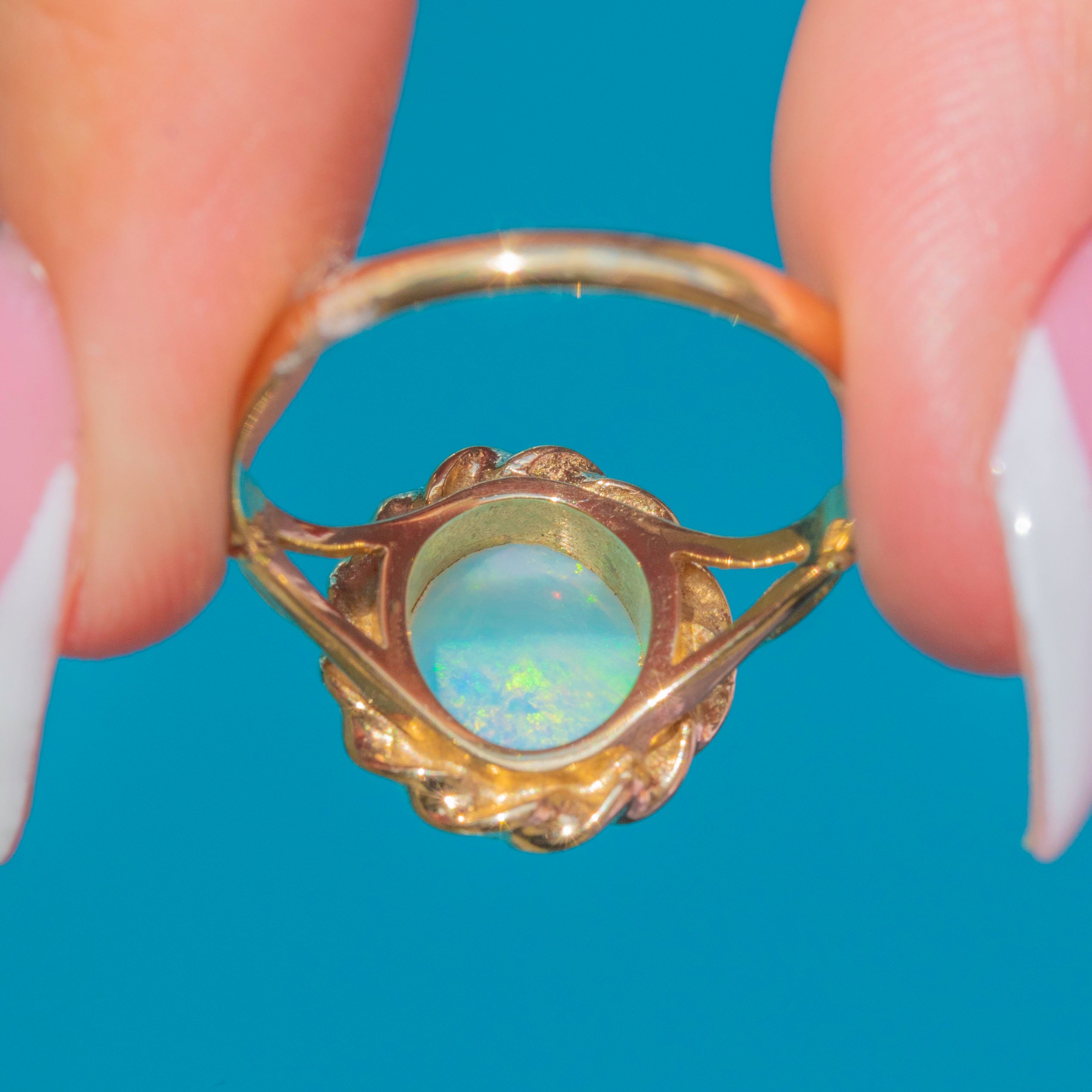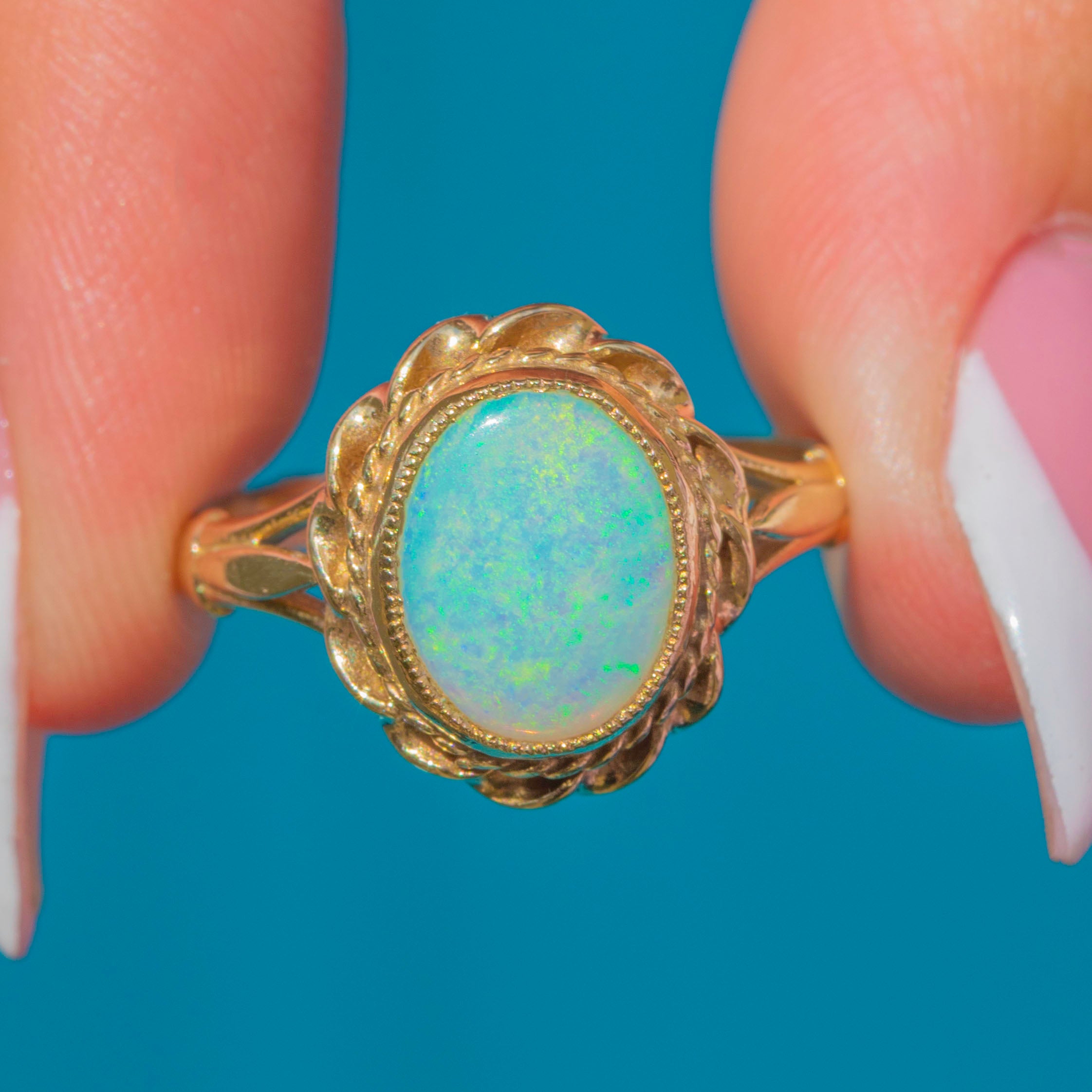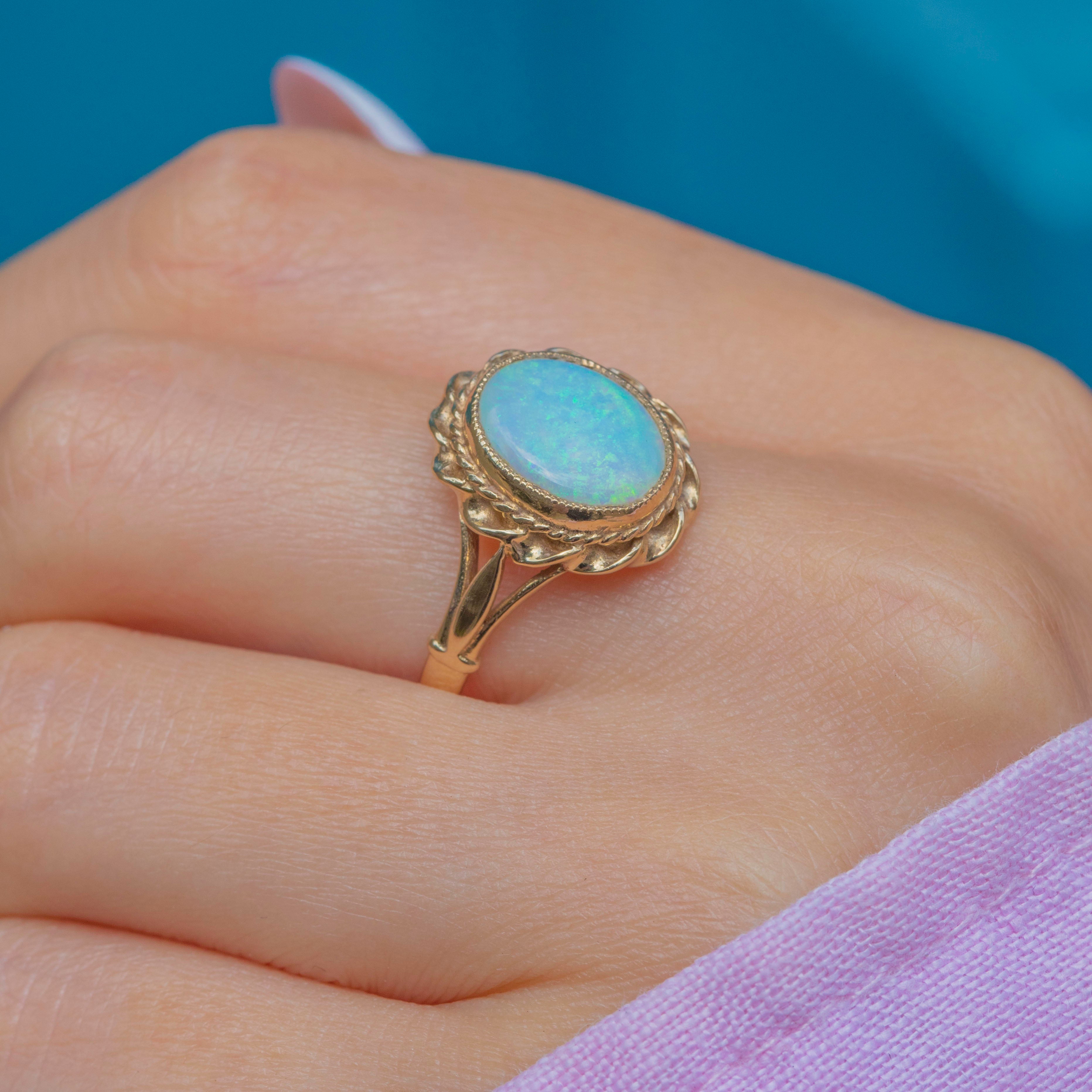 The oval Opal is set within a glossy 9ct Gold rope twisted bezel, adding a wonderful texture and depth to the piece. Fully hallmarked, this vintage solitaire ring is exudes vintage charm and is sure to make a radiant addition to your collection.