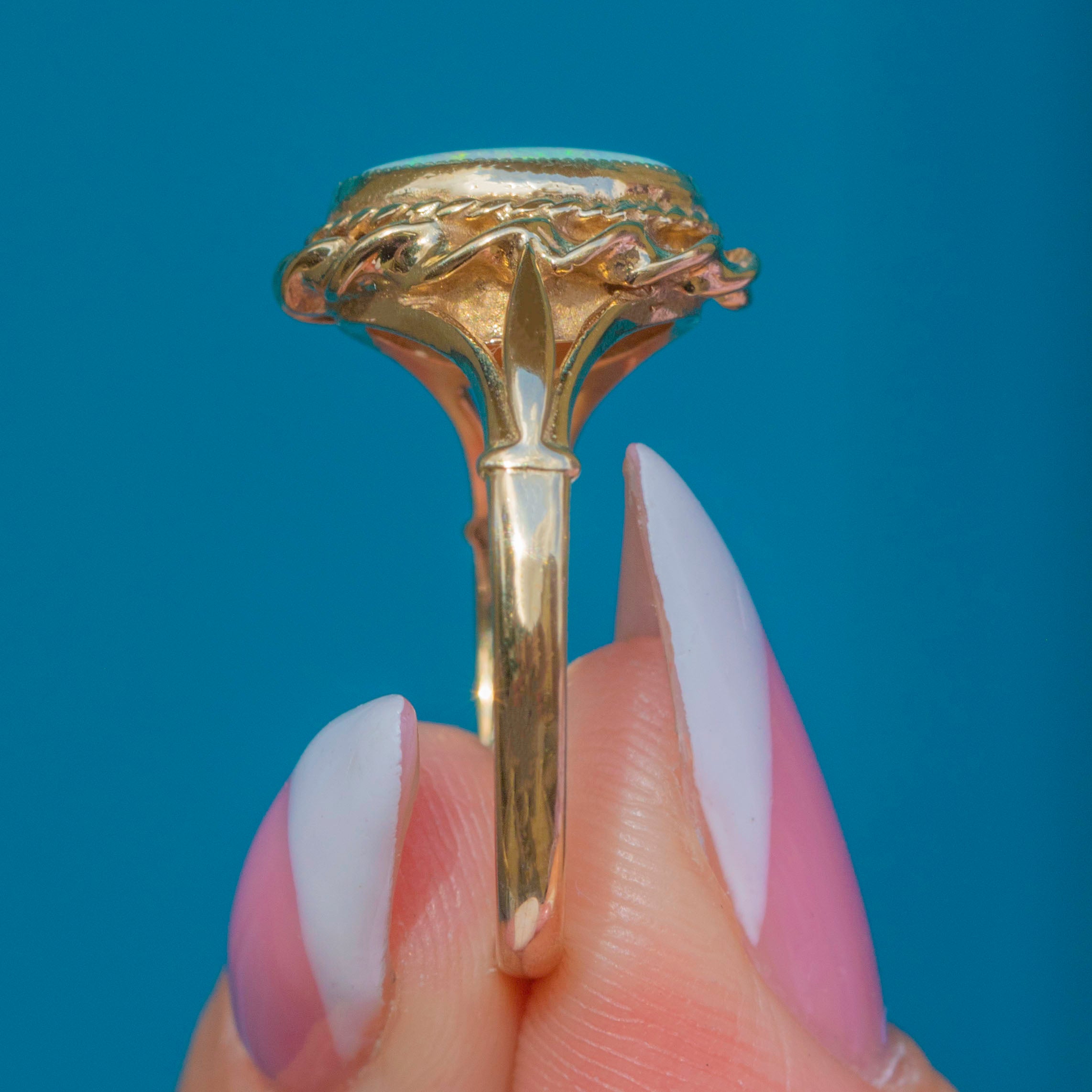 EXCELLENT: The Opal is bright and glossy, free from any scuffs or scratches. The surrounding Gold is also in great condition and with the glossy band providing a comfortable wear, this vintage ring is soon to become a must-have in your collection.