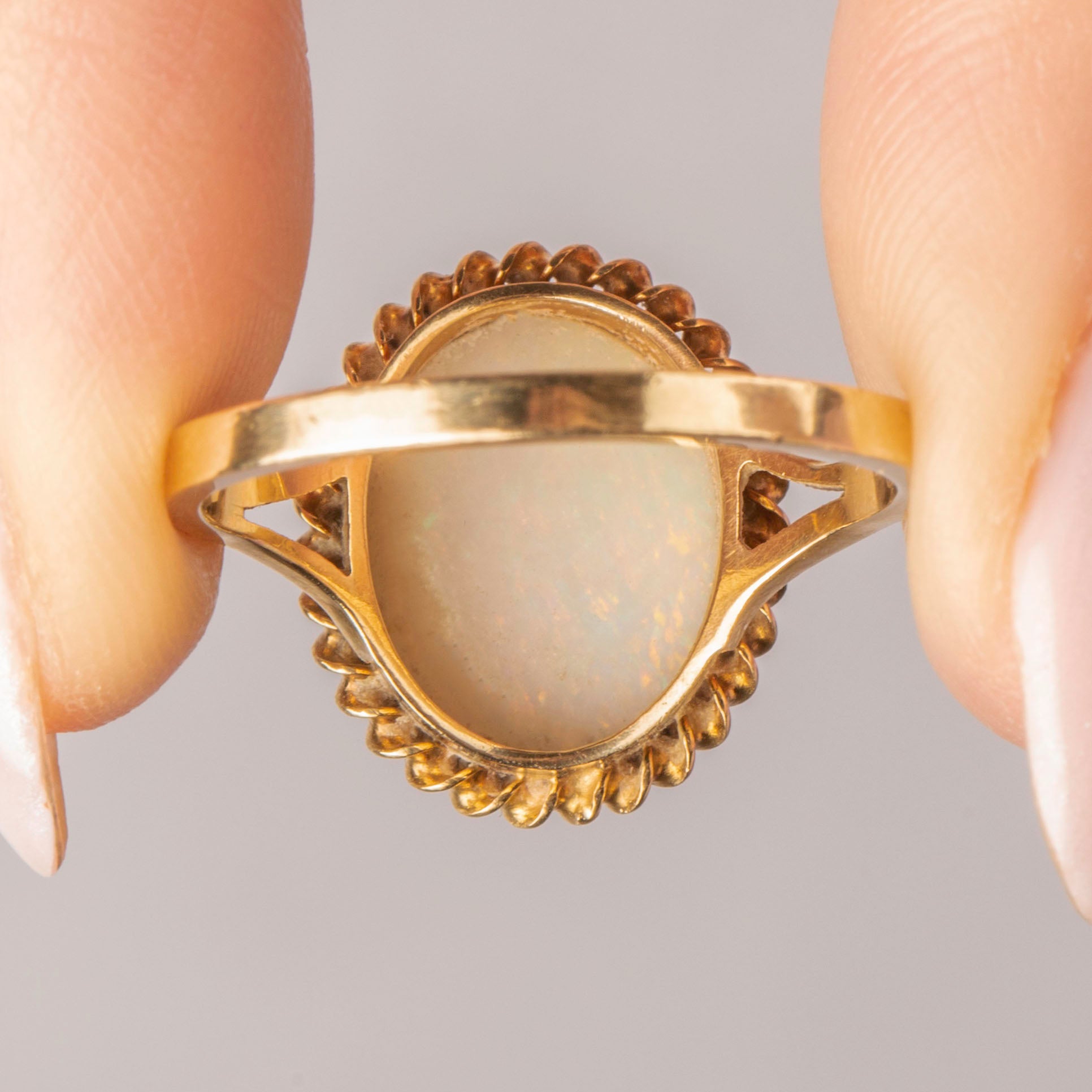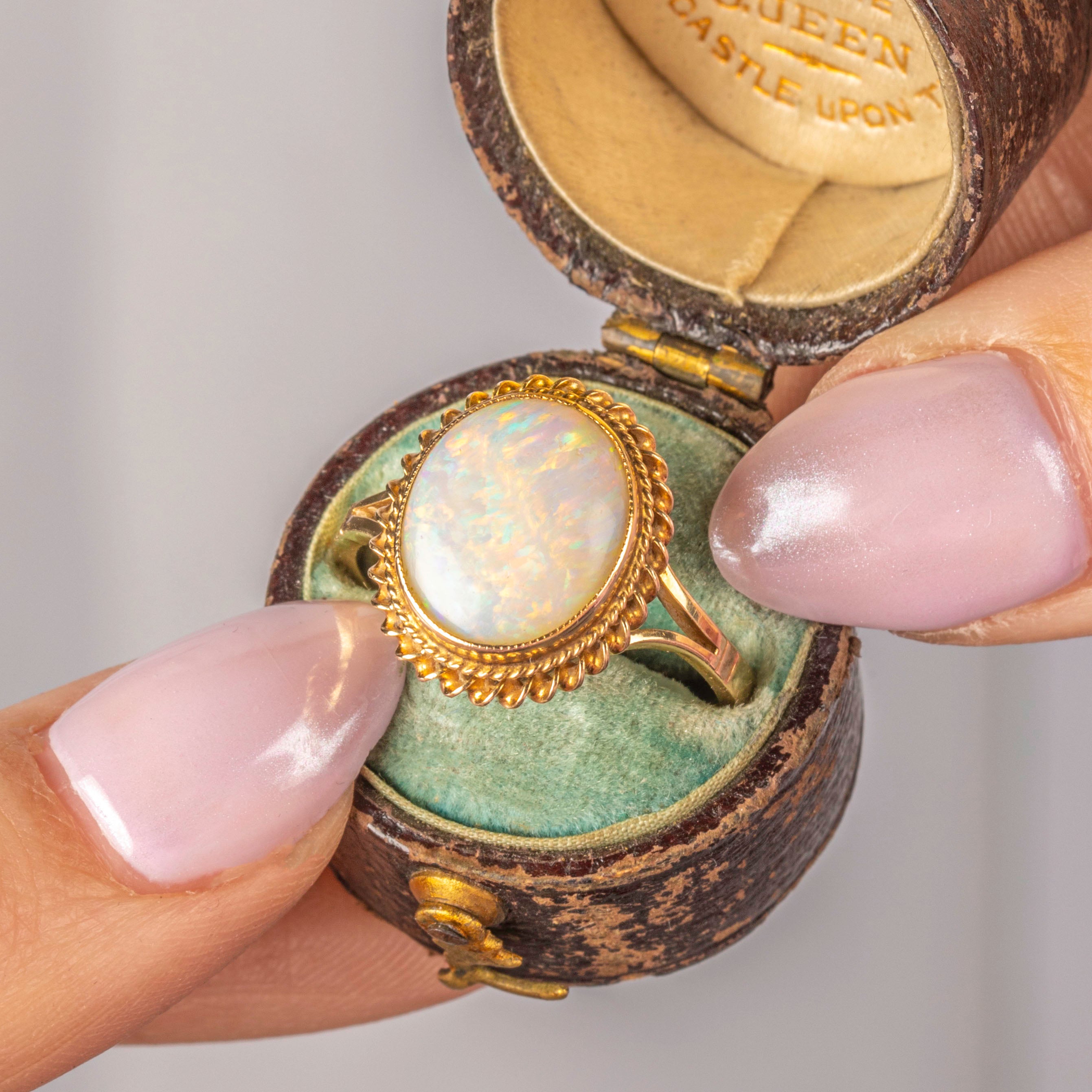 EXCELLENT. This 9ct Gold Opal solitaire ring is in excellent condition! The Opal sits securely within its setting, surrounded by a securely soldered rope border. The Opal has a lovely play of colour with her smooth cabochon cut flaunting no damage to note. With a full set of hallmarks, we can accurately date this ring to 1976, making her a true Vintage treasure!