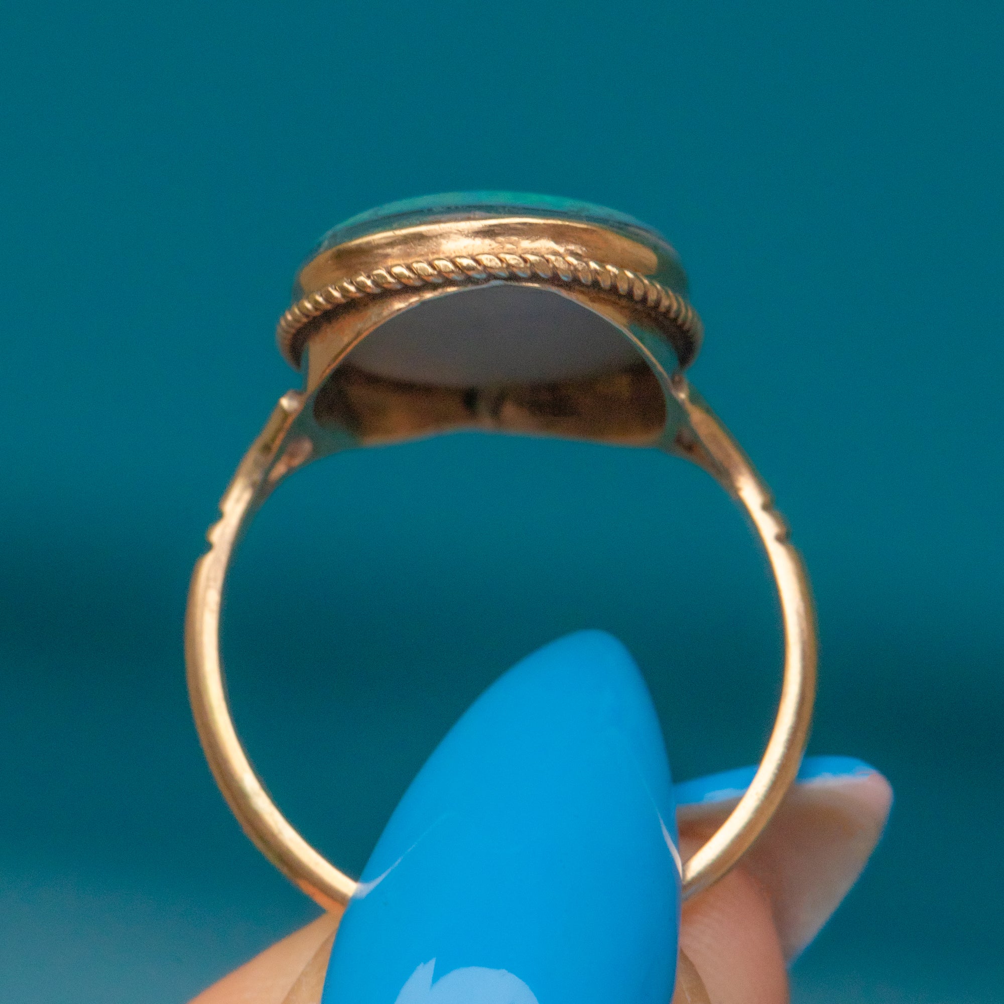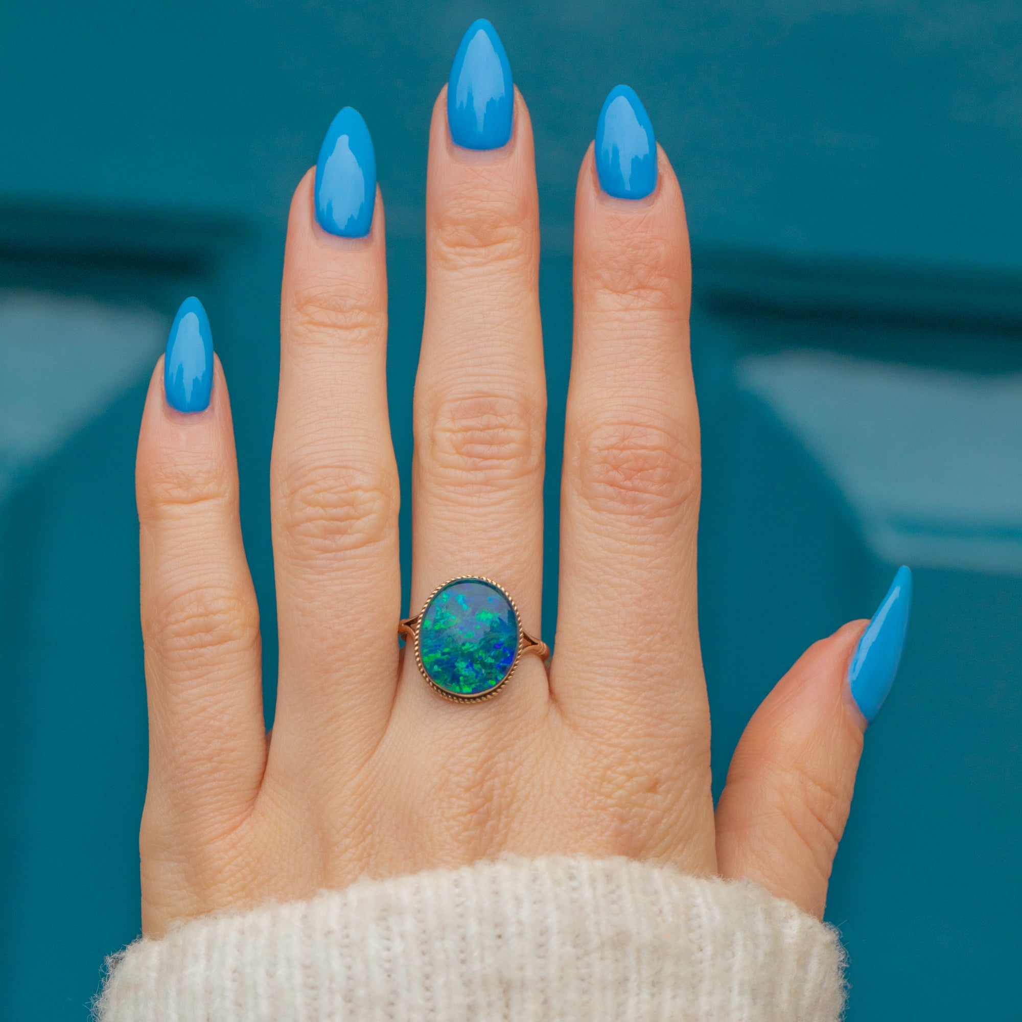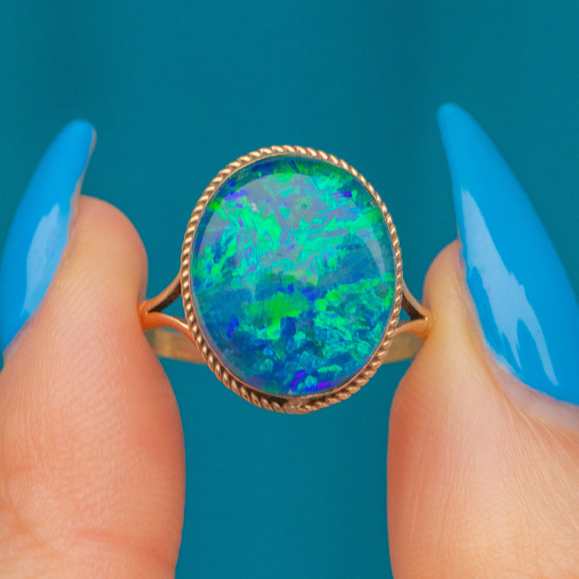 You will become mesmerised the moment you lay your eyes on this phenomenal 9ct Gold Opal triplet ring! The Opal triplet boasts exquisite hues of shimmering cobalt and emerald, with ethereal qualities that make this Victorian ring appear as though it might have been plucked from an enchanted forest.