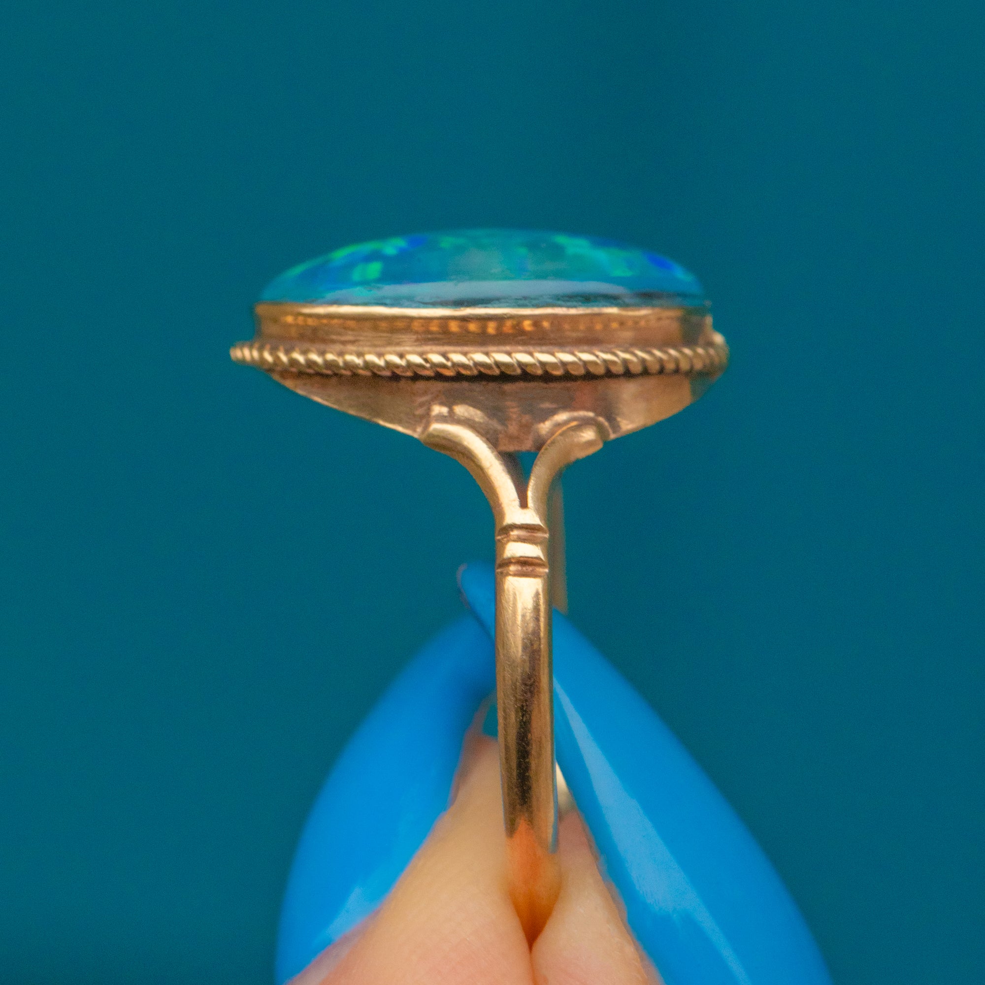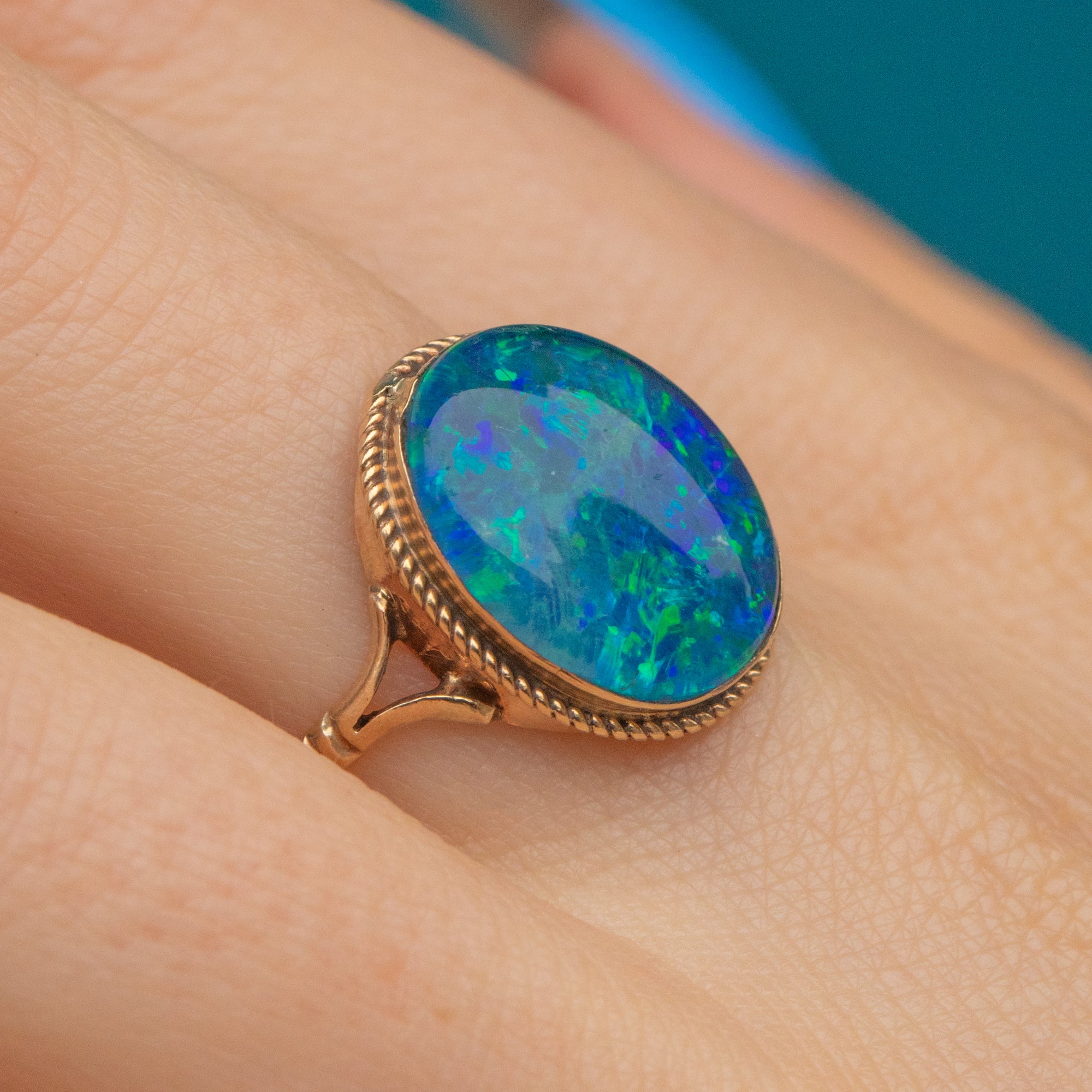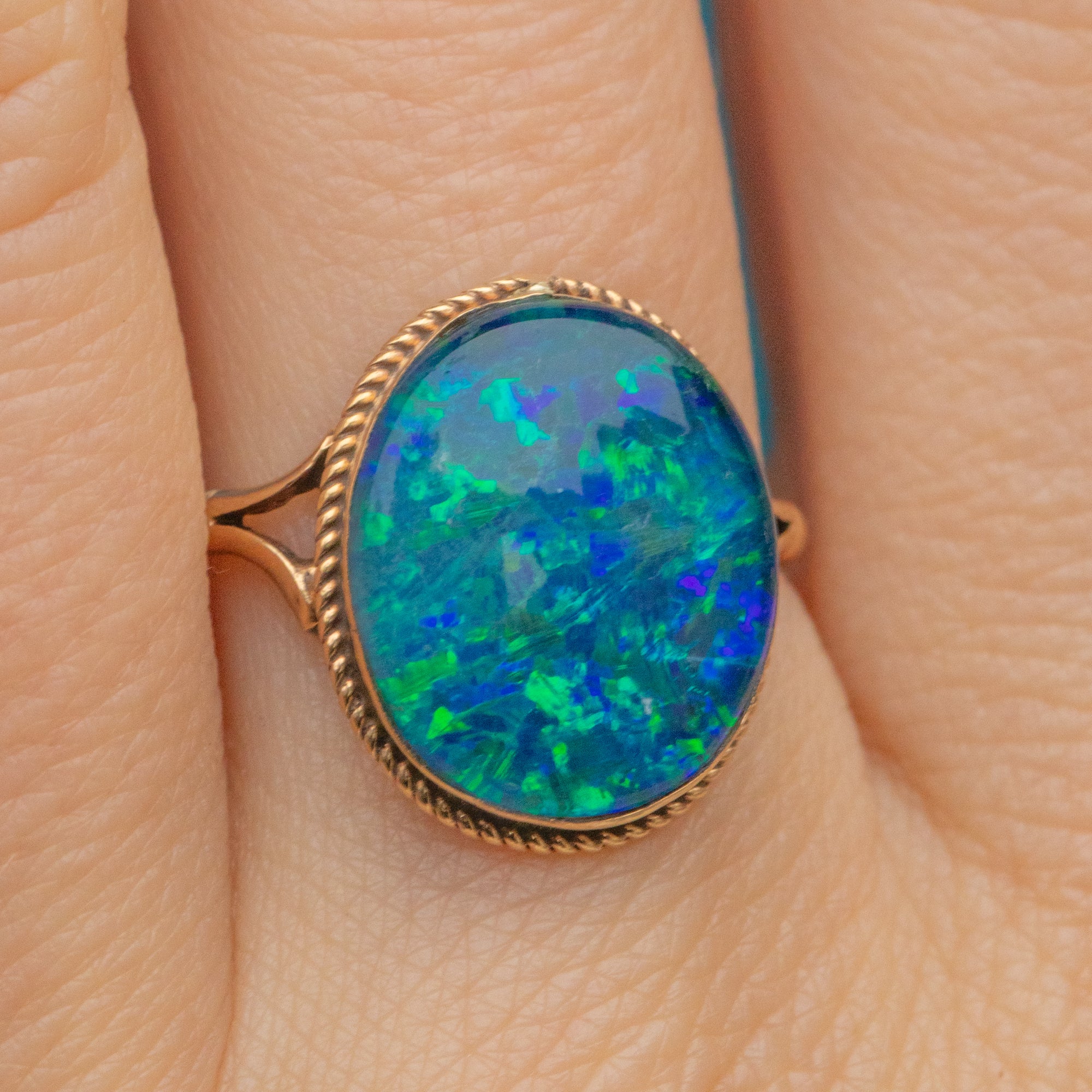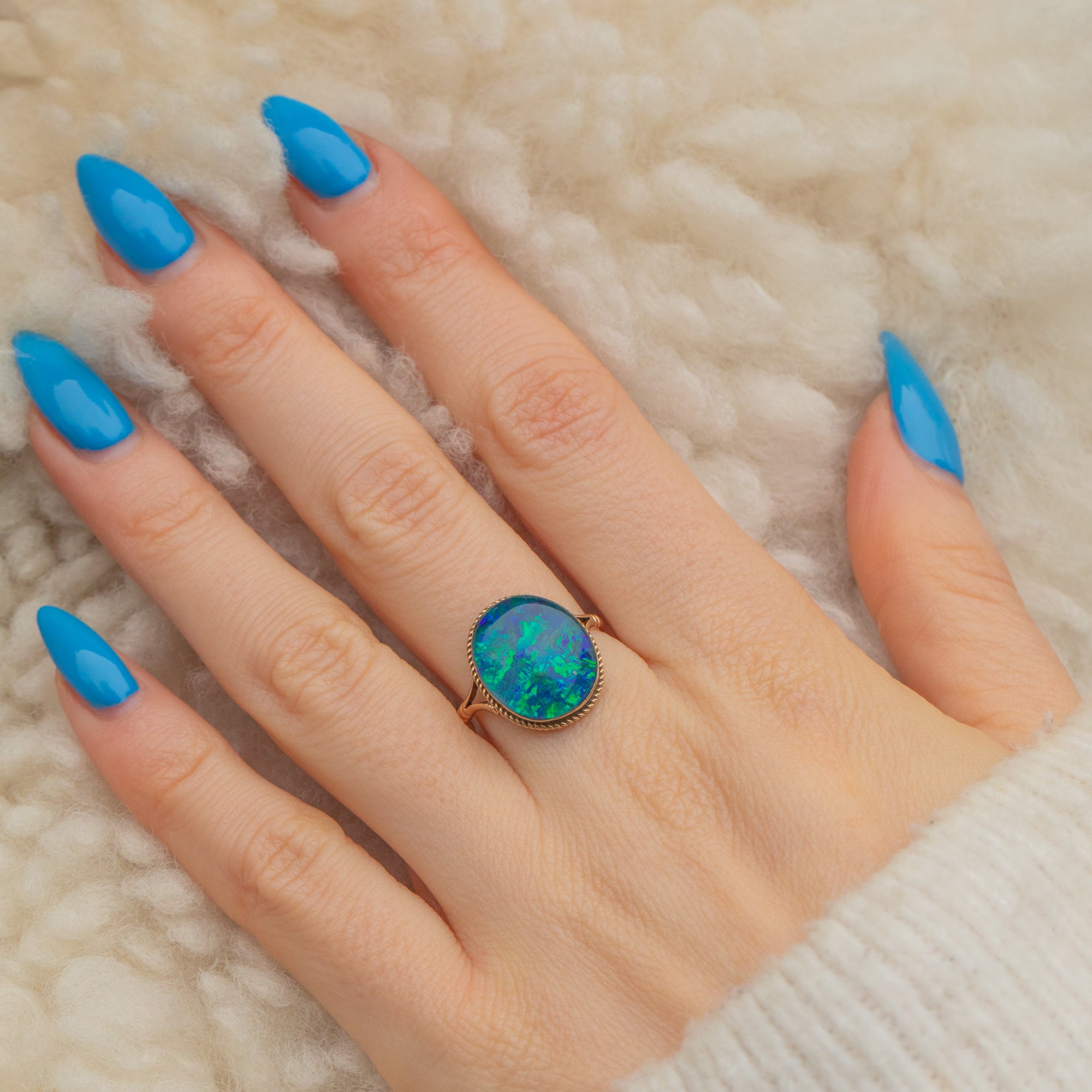 VERY GOOD-EXCELLENT. This 9ct Gold Opal triplet ring is in wonderful condition. The Opal triplet is smooth, free from any surface wear, and secure within its bezel setting. There is a visible solder join mark at the base of the ring, but this cannot be seen during wear. The Gold is buttery and the band has retained its form well over the years, promising years of wear and enjoyment!