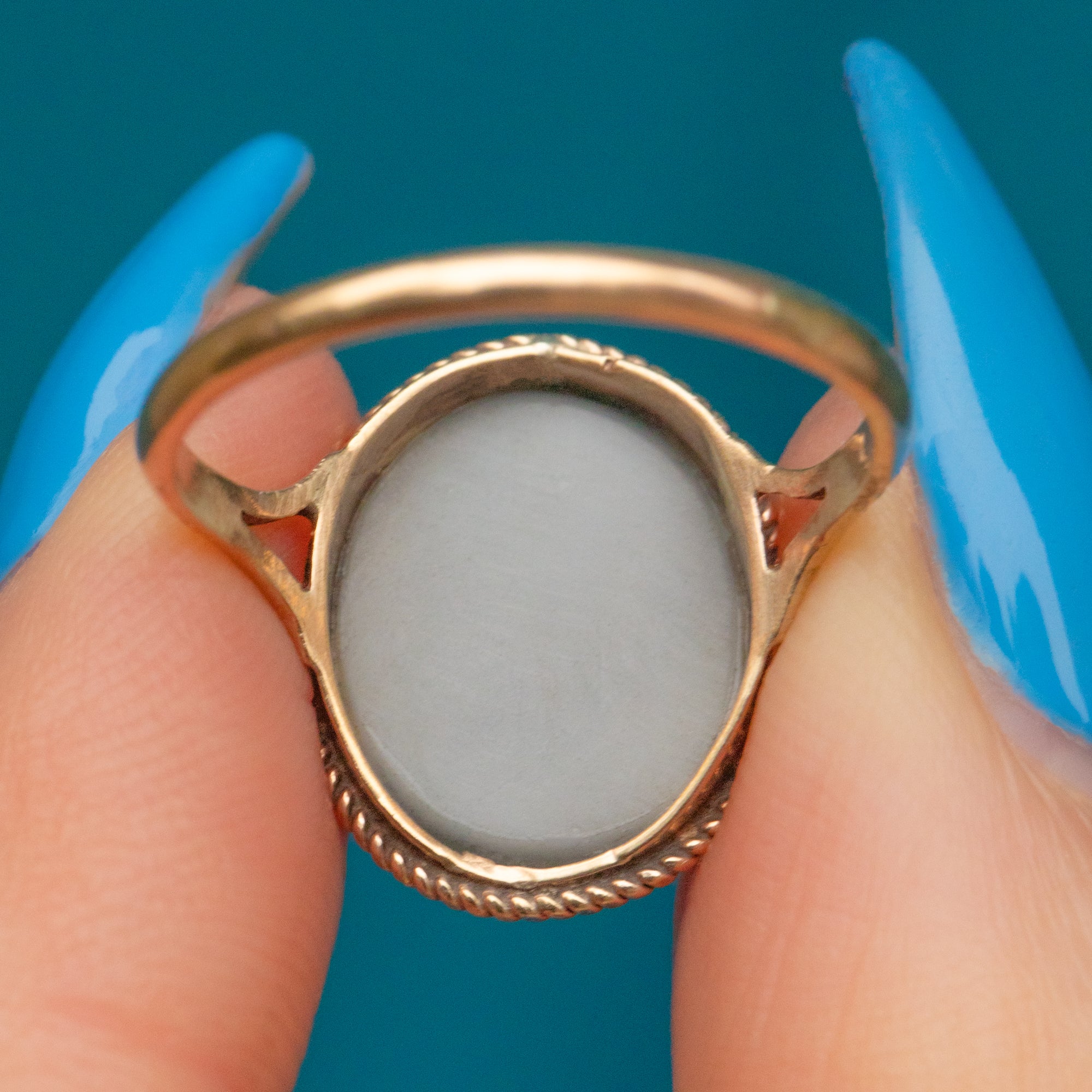 Crafted from buttery 9ct Gold, the Opal is framed by a decorative rope border and flanked by split shoulders giving this antique ring an elegant finish. Providing exceptional finger coverage, this Victorian Opal ring will instantly bring the wow factor to any outfit!