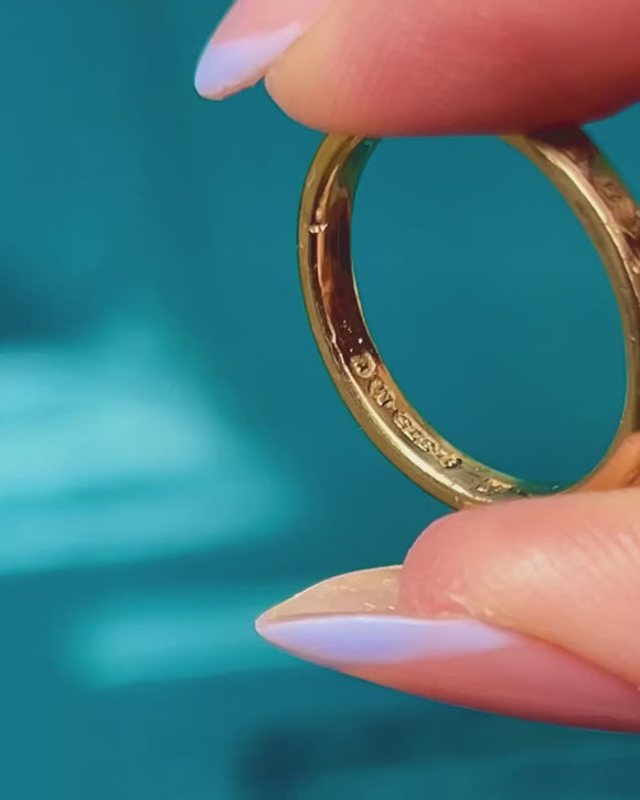 VERY GOOD: This 9ct Gold orange blossom wedding band is in very good condition. The Gold is radiant and the engraved details have remained defined for the most part, with only small areas of wear noticeable under close inspection. The hallmarks are fully legible, allowing us to accurately date her to 1947. This ring is the perfect vintage wedding band to honour a new beginning!