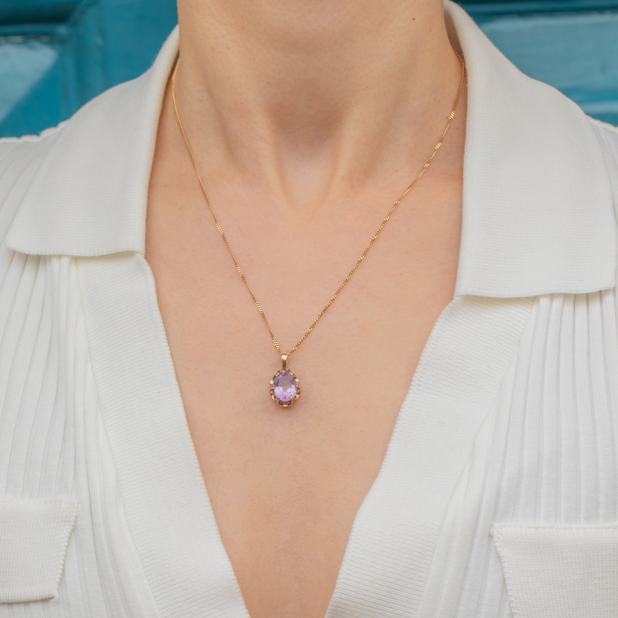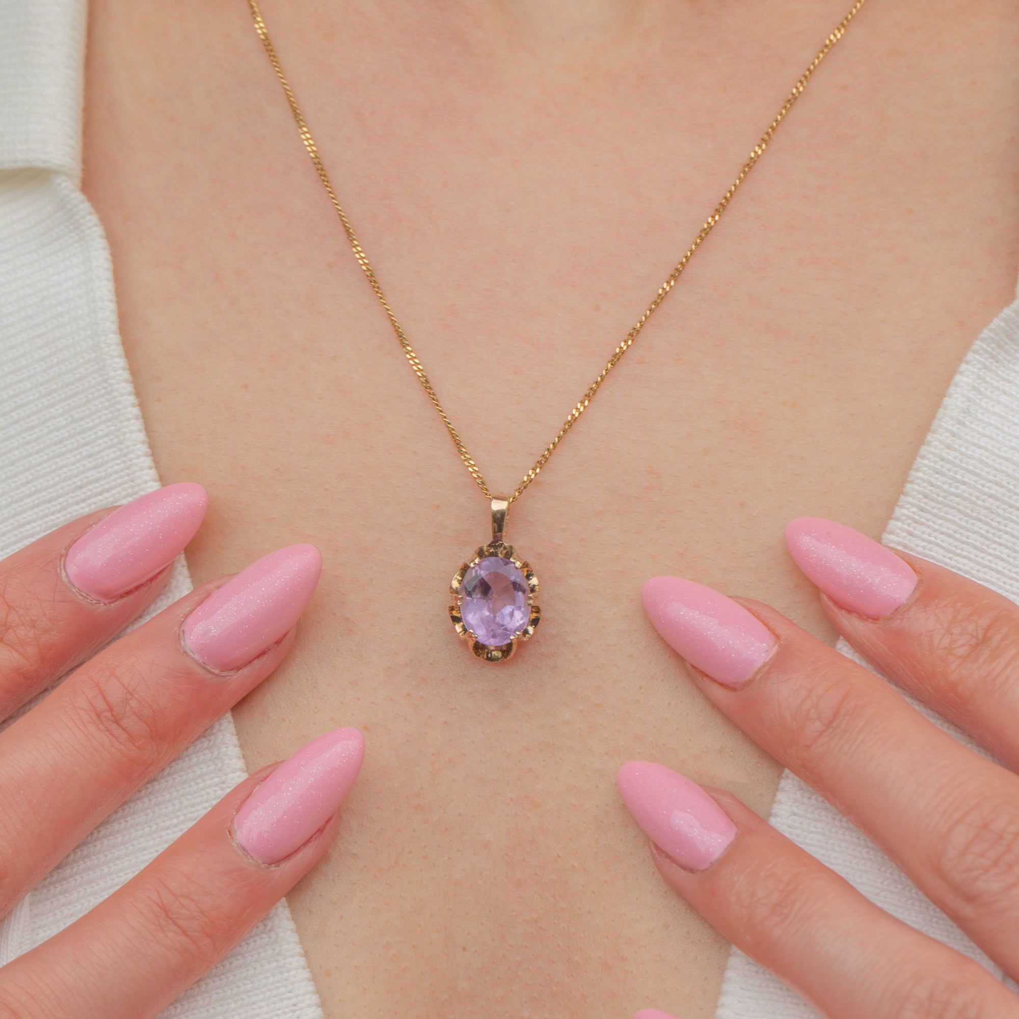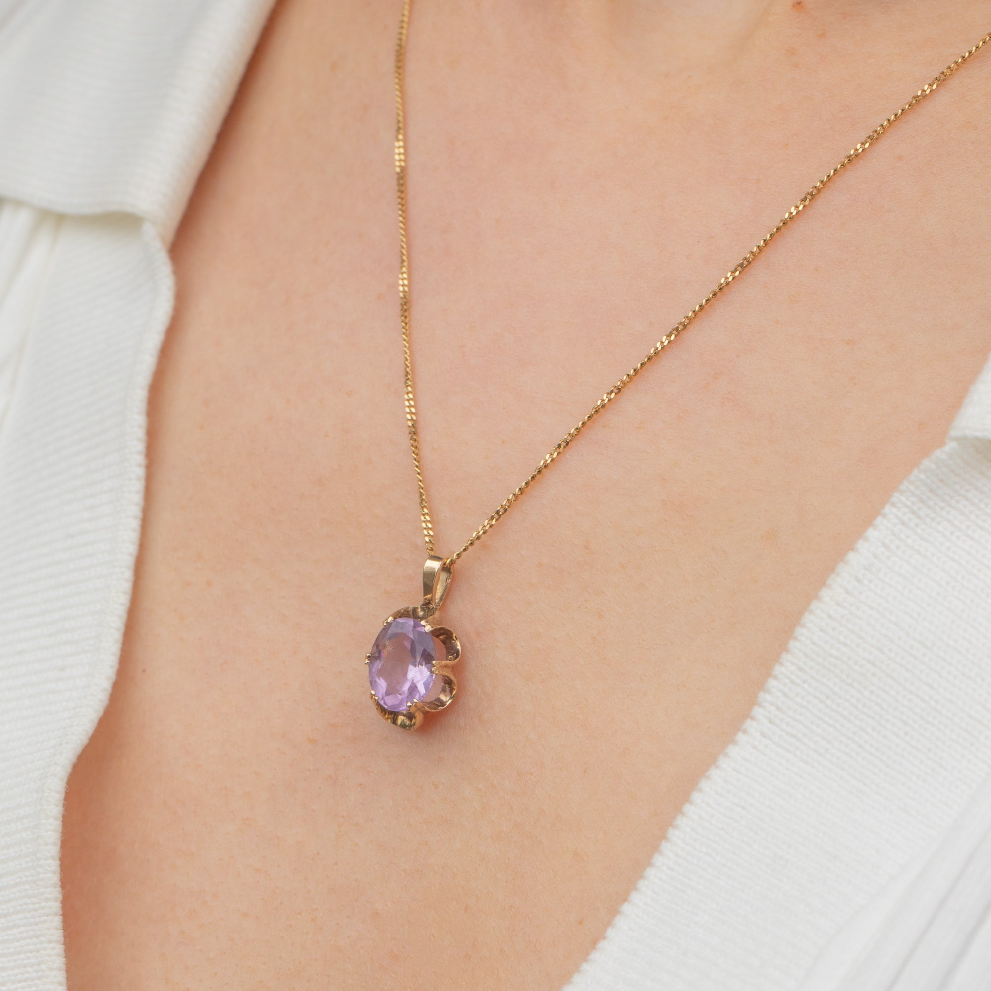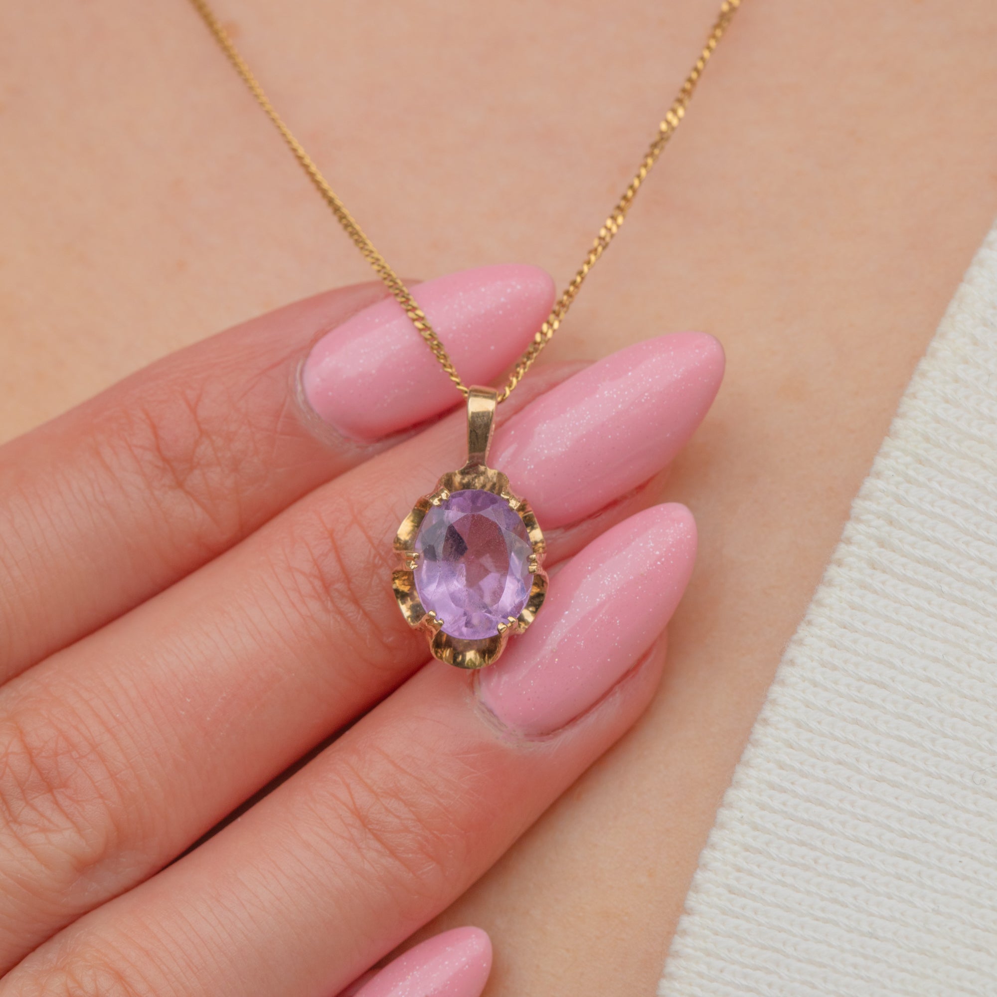 Crafted from solid 9ct Gold throughout, the large oval Amethyst is framed by a buttercup setting adding to her vintage charm. Sitting proud from your chest suspended from a Gold chain, this vintage Amethyst pendant will steal the show!