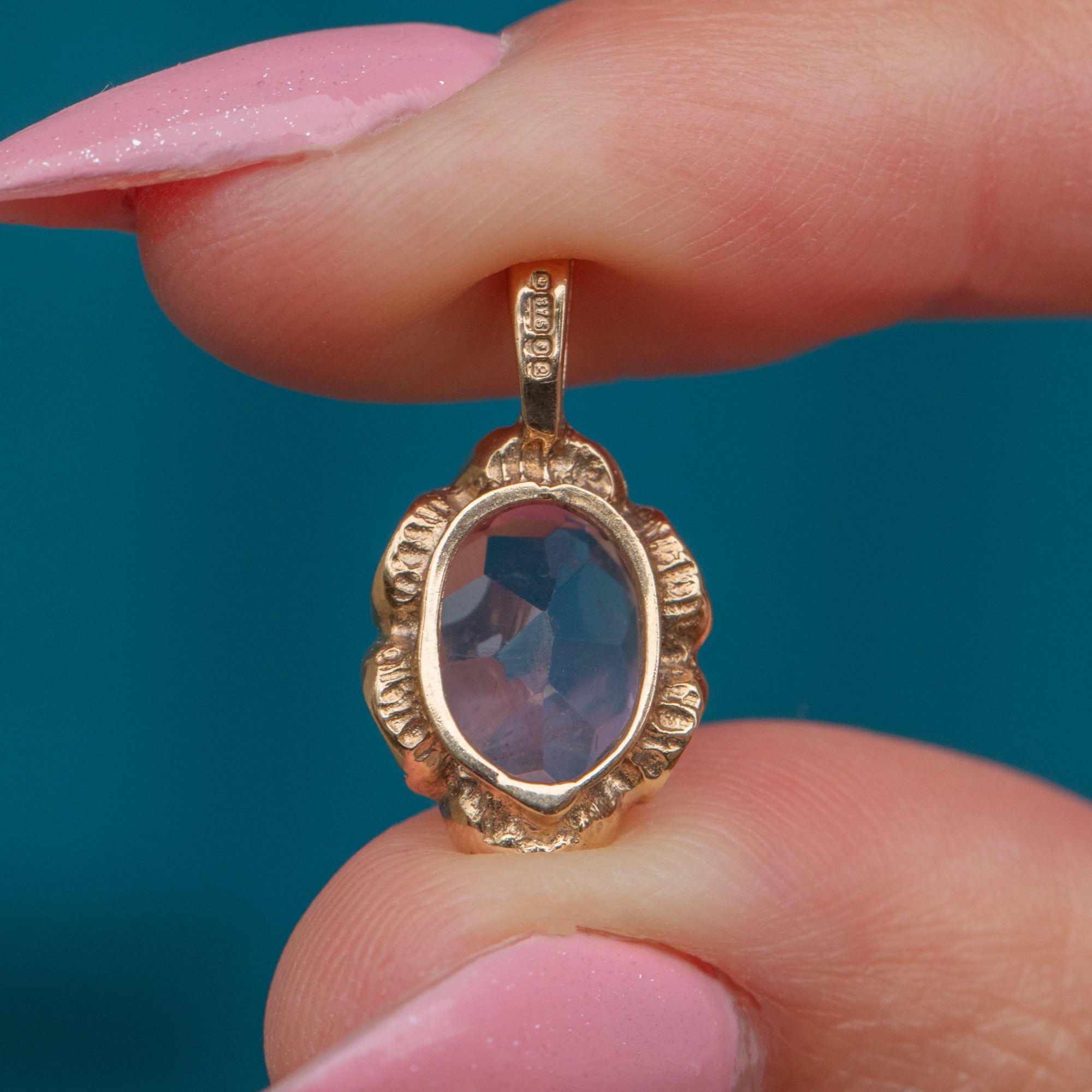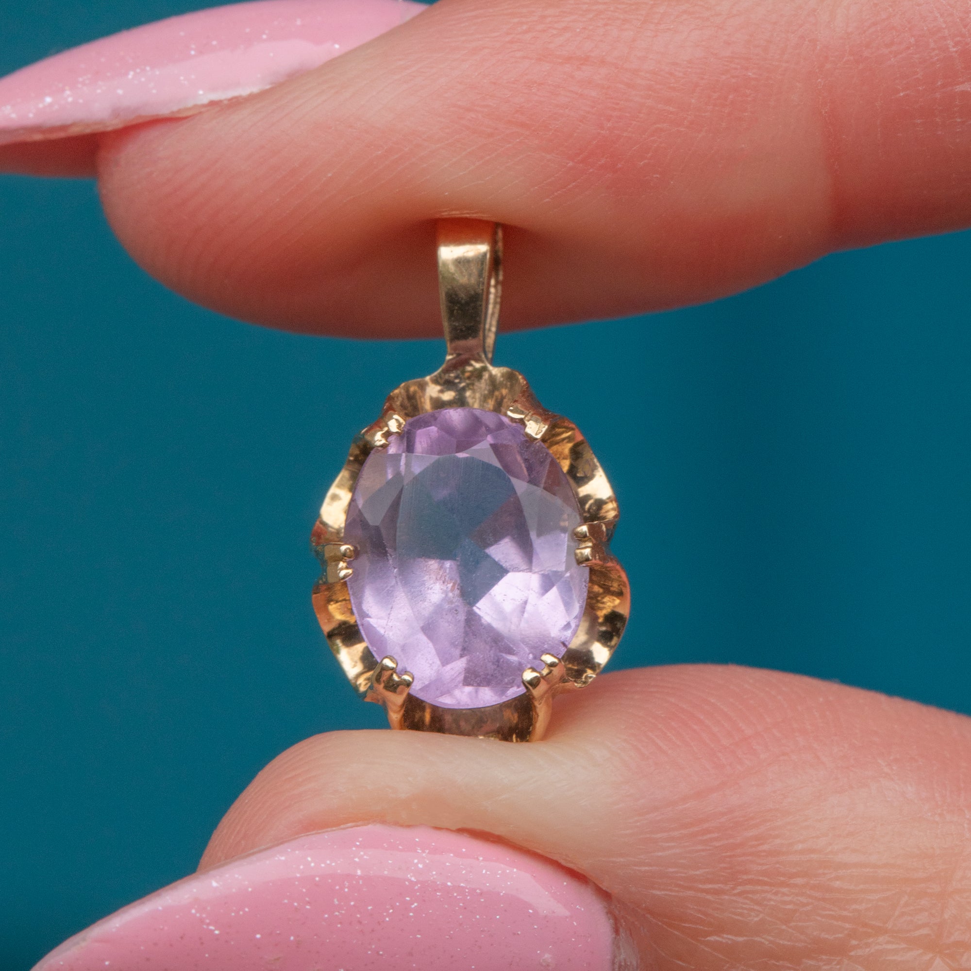 VERY GOOD-EXCELLENT: This 9ct Gold oval Amethyst charm is in lovely condition. The Amethyst is set securely and is fabulously faceted with beautiful tones rippling throughout- she does have mild surface wear but nothing too untoward. The Gold has a gorgeous rosy hue and the Amethyst is securely held in place. Complete with a secure bale, you can wear this pretty Amethyst pendant with confidence!
