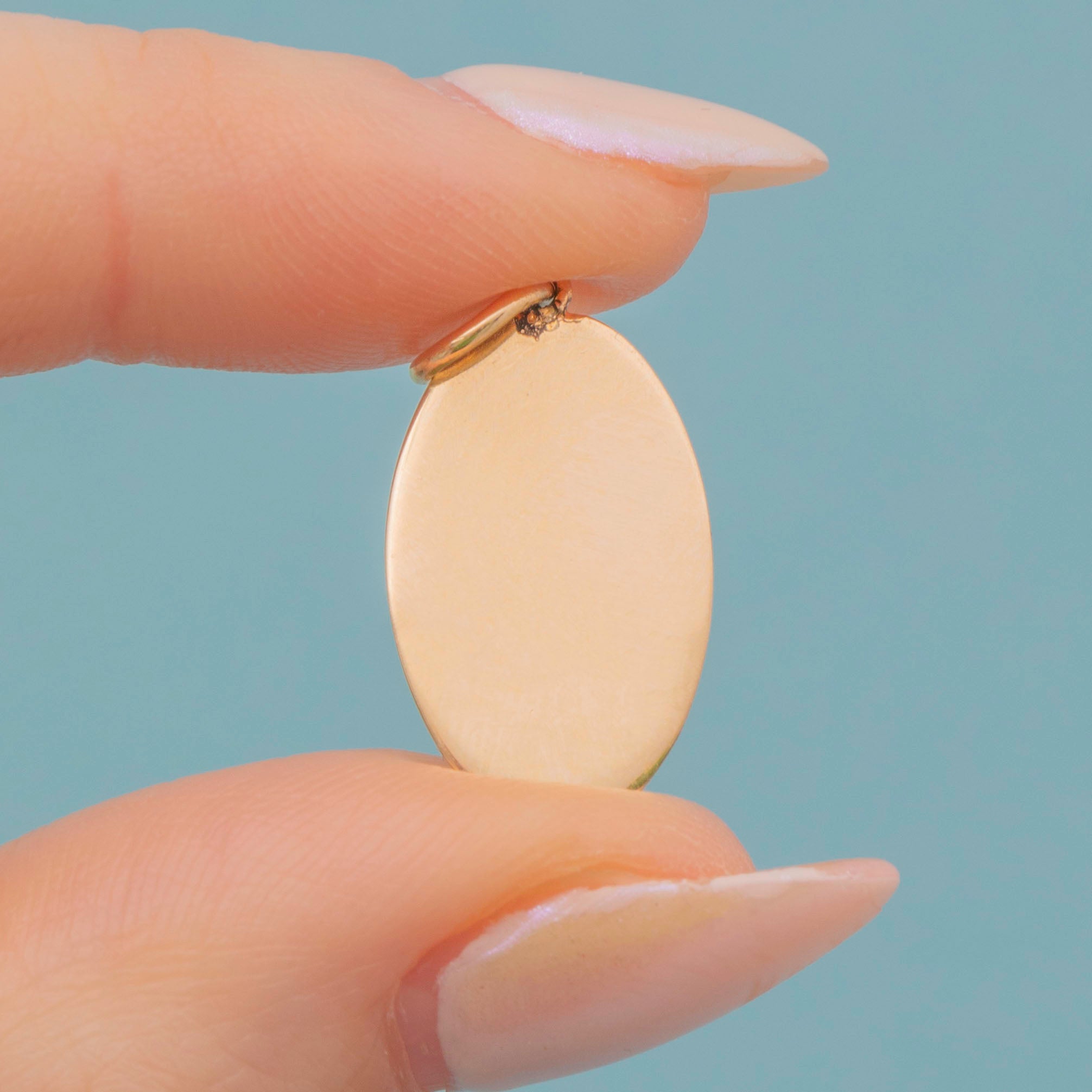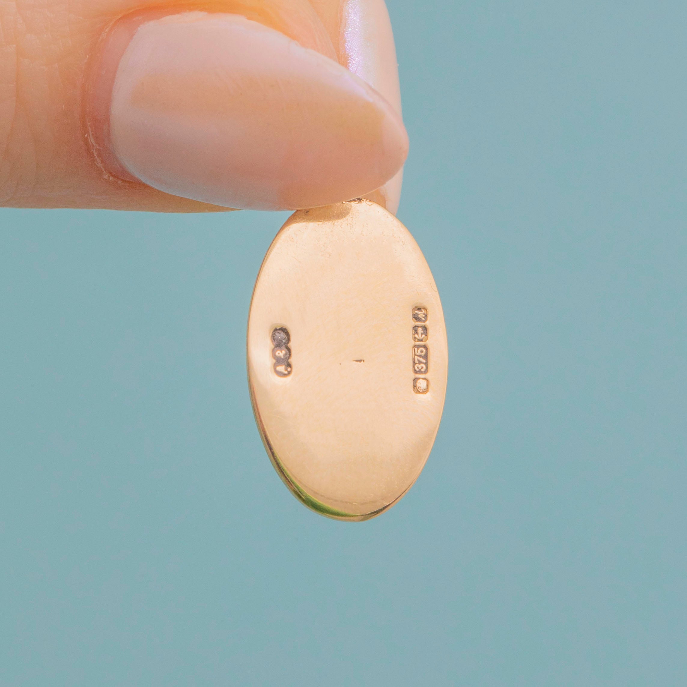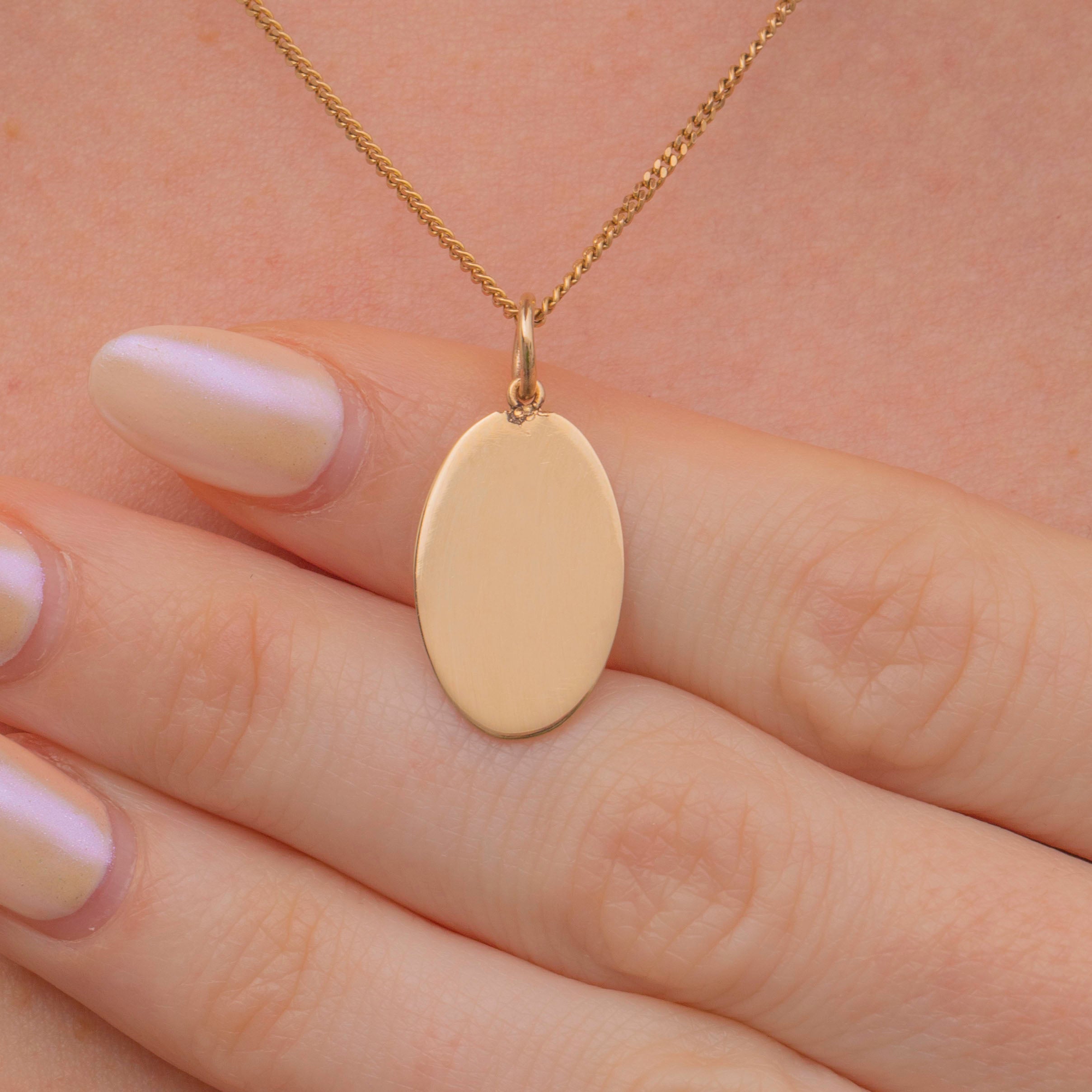 EXCELLENT. This 9ct Gold oval disc pendant is in excellent condition! Her hallmarks are crisp, and her Gold has only very minor signs of wear commensurate with age. With a securely soldered jump ring, you can wear her with confidence.