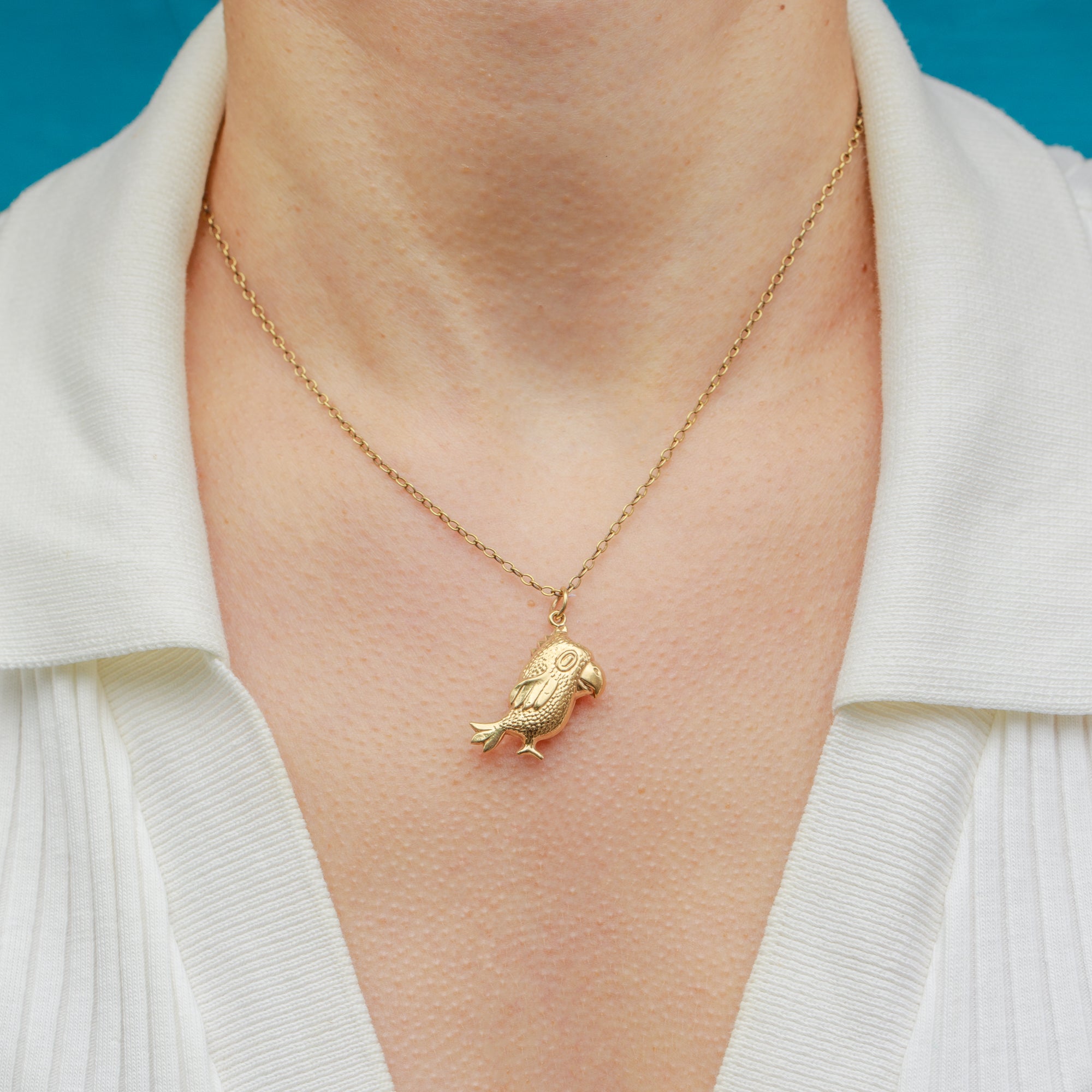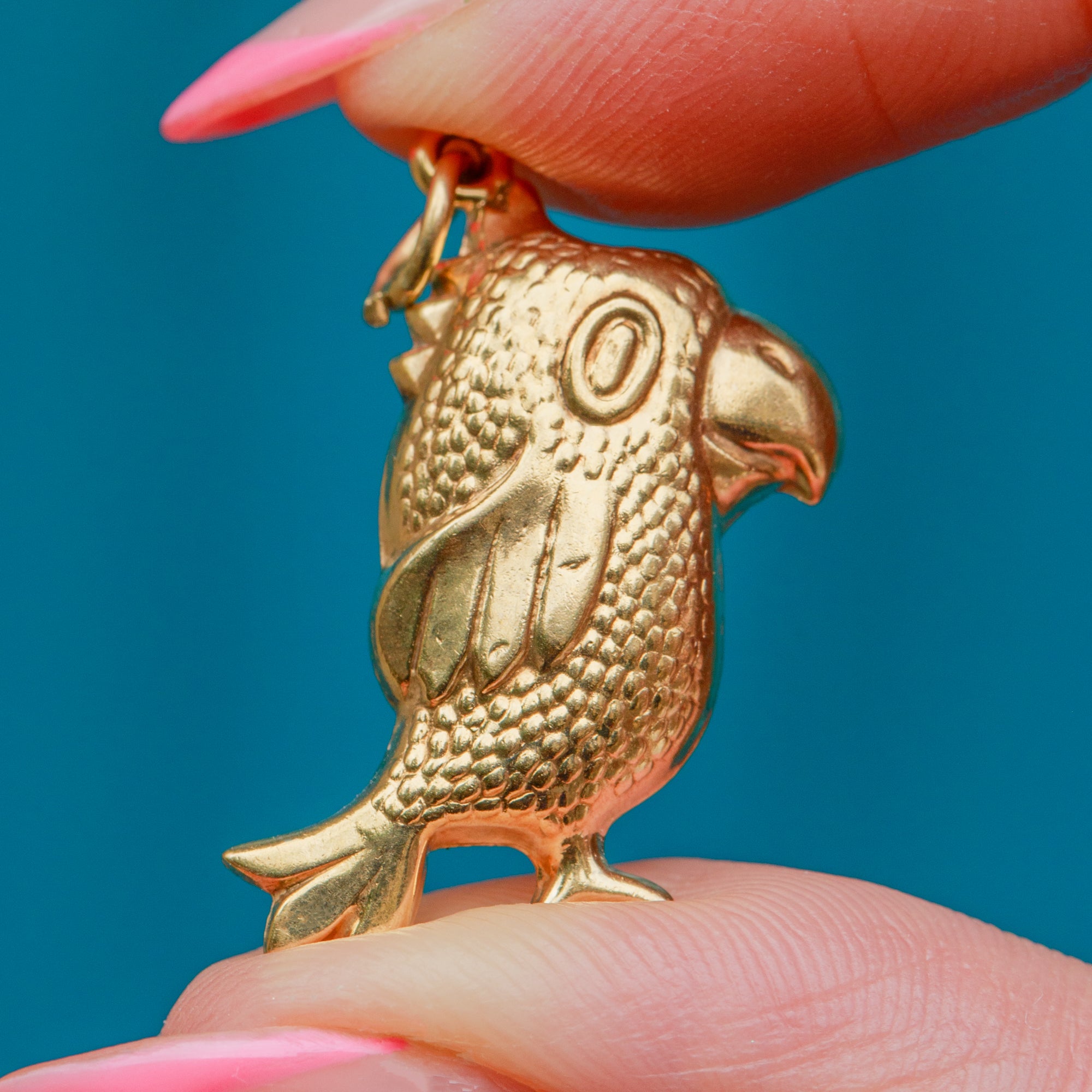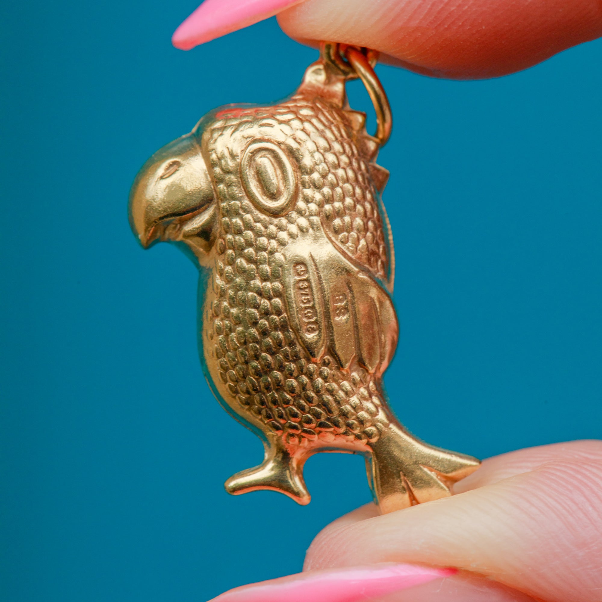 EXCELLENT: This 9ct Gold parrot charm is in excellent condition, with a beautifully polished Gold finish that highlights its intricate detailing. A well-preserved and charming piece, ready to be worn suspended from a fine Gold chain!