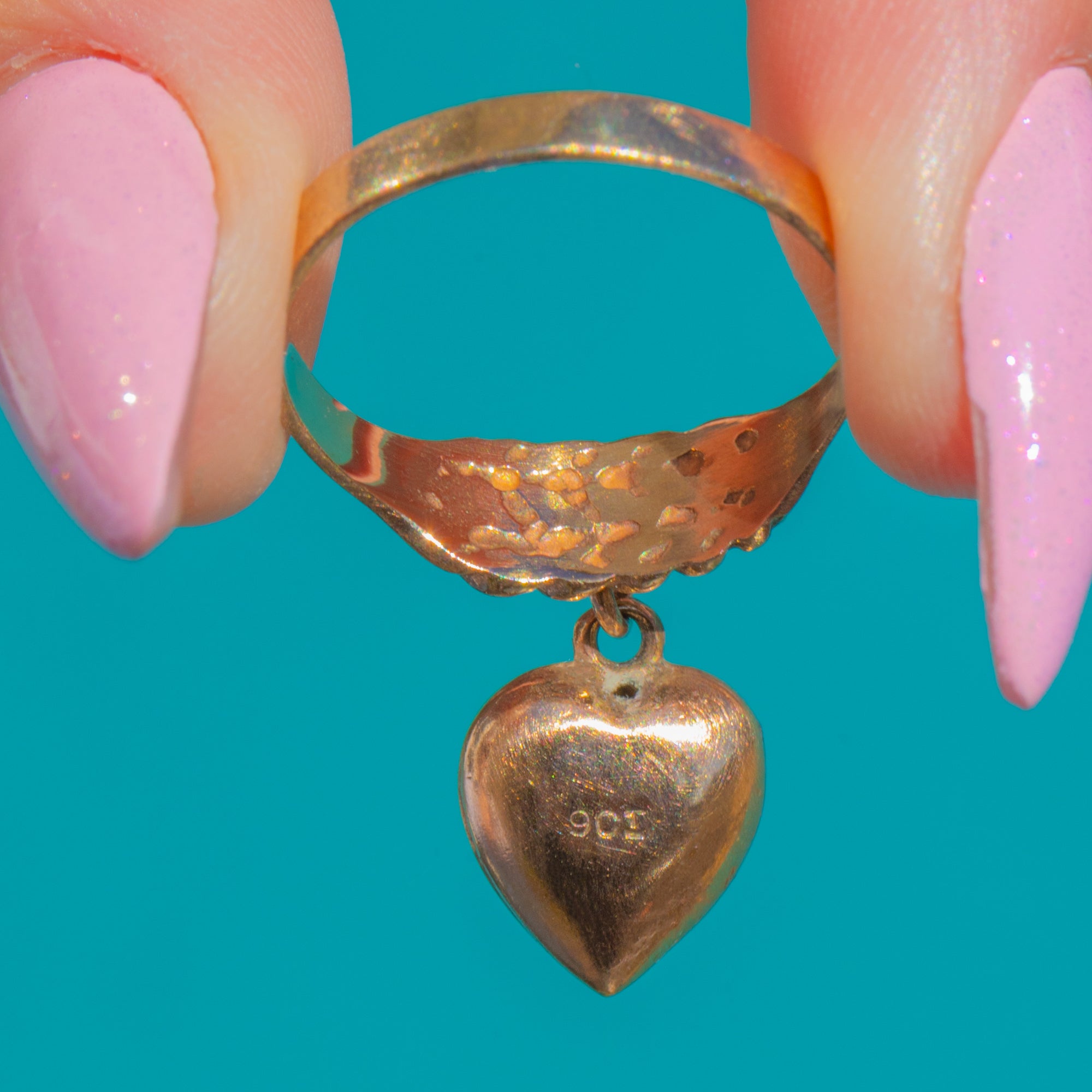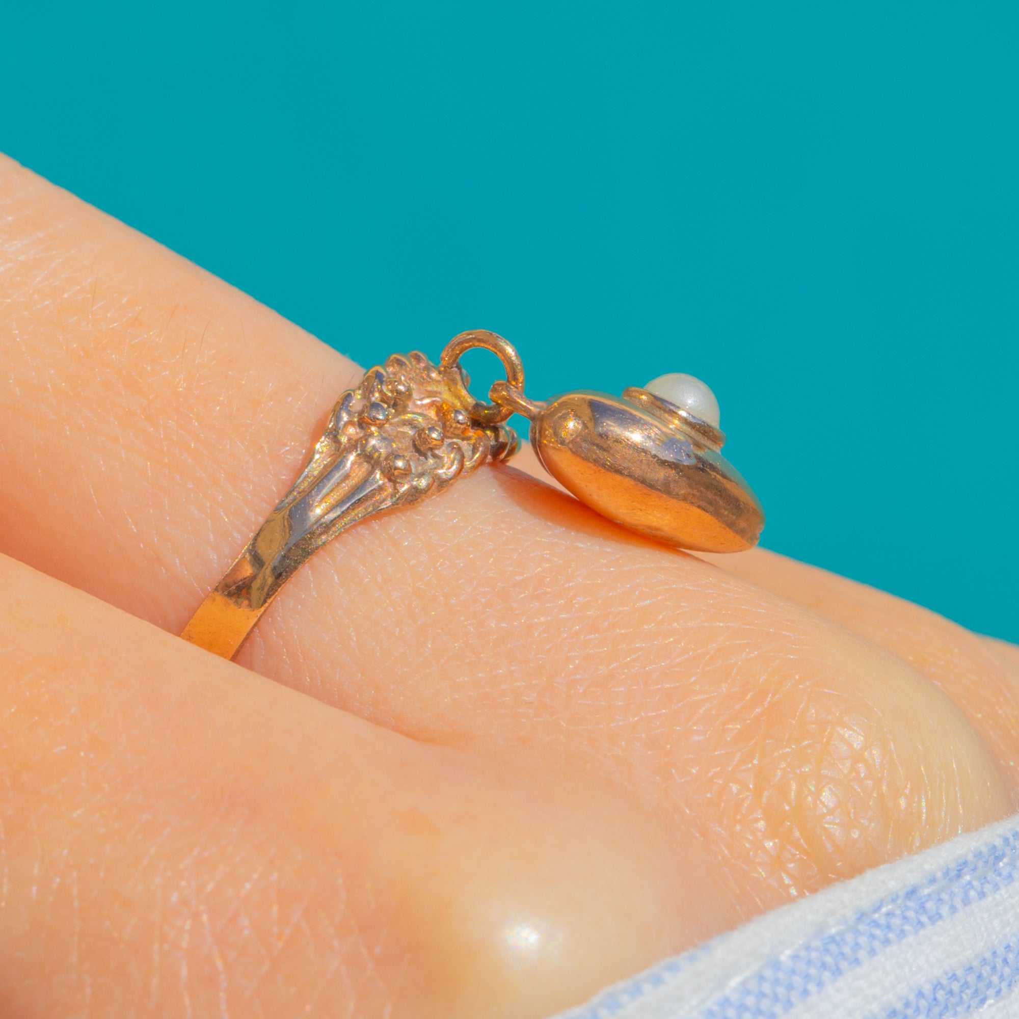 A dainty Vintage charmer, this 9ct Gold “keeper” ring suspends a petite heart drop set with a creamy Pearl. The articulated heart sways beneath an ornate scalloped cartouche, while the fine shoulders are adorned with tiny raised beading for a romantic, Victorian-inspired flourish.