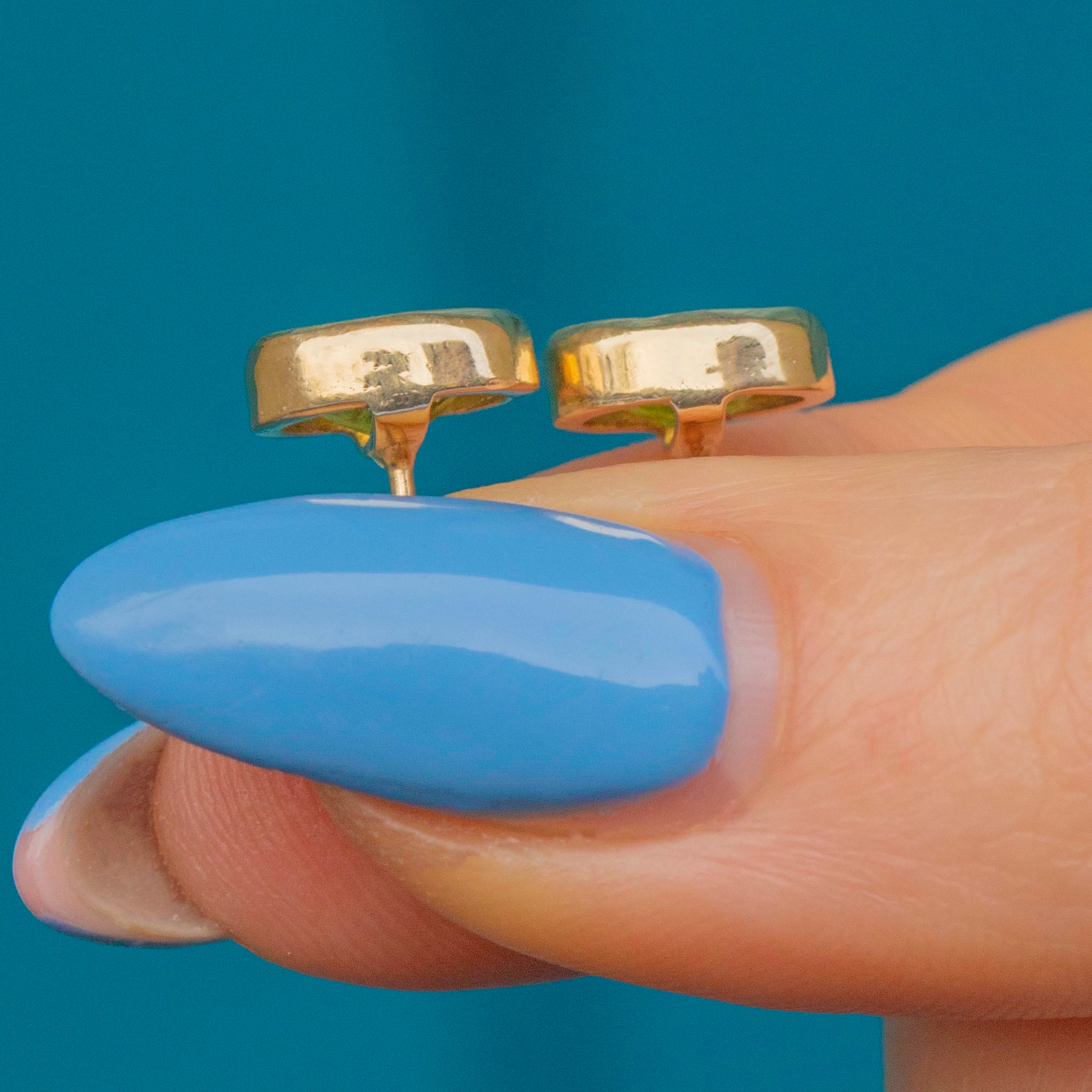 Peridots are 7.5mm long x 5.5mm wide, weighing approx. 1.55ct combined.