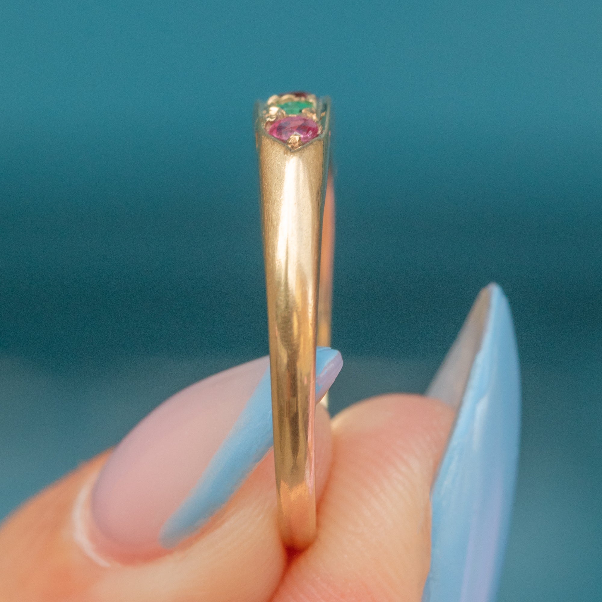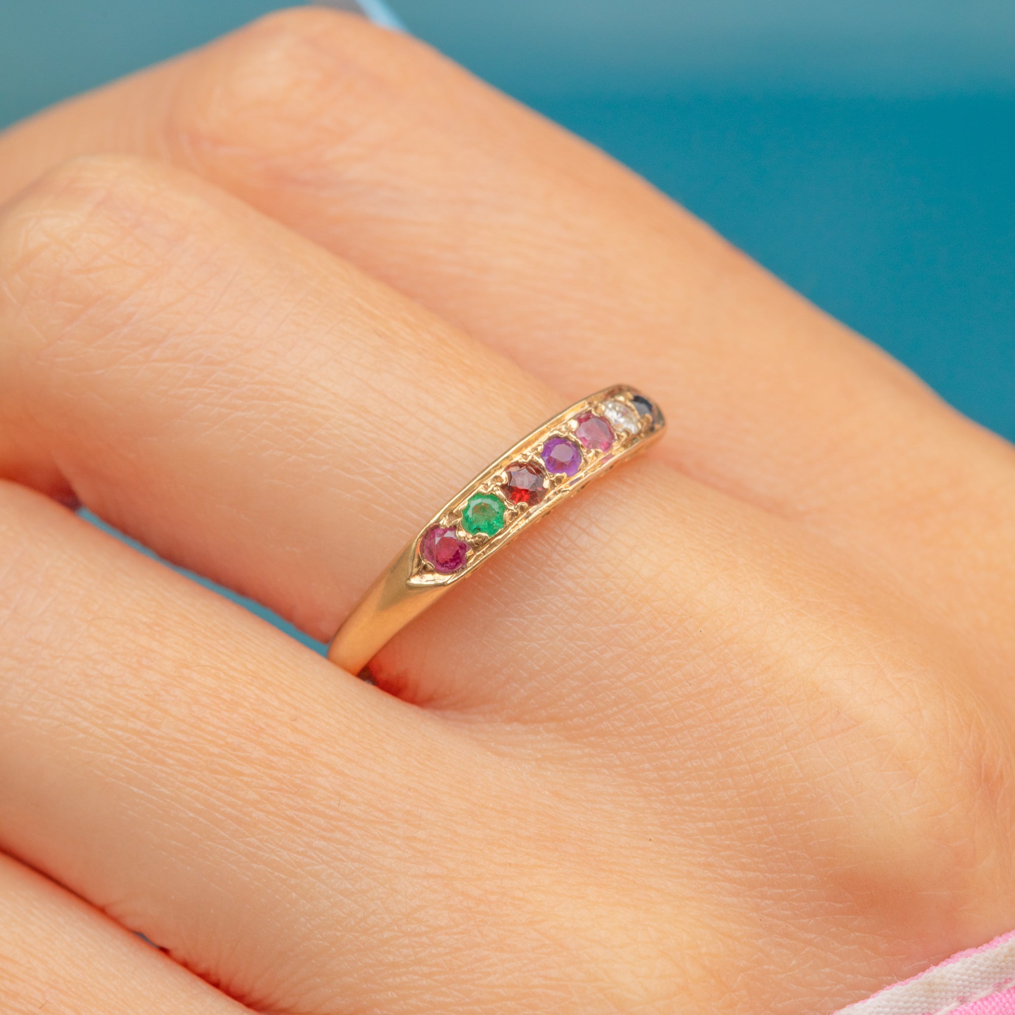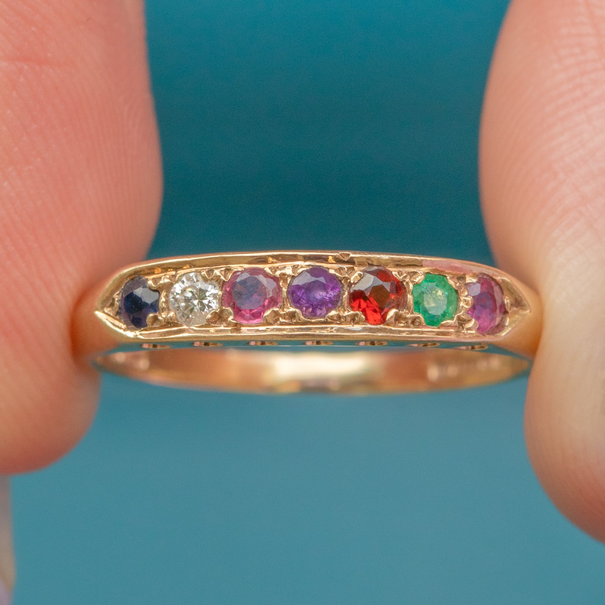 The use of carefully arranged gemstones (Ruby, Emerald, Garnet, Amethyst, Ruby, Diamond, Blue Sapphire) spells out the word 'regards' across this Victorian-style ring, making it a wonderfully sentimental piece.