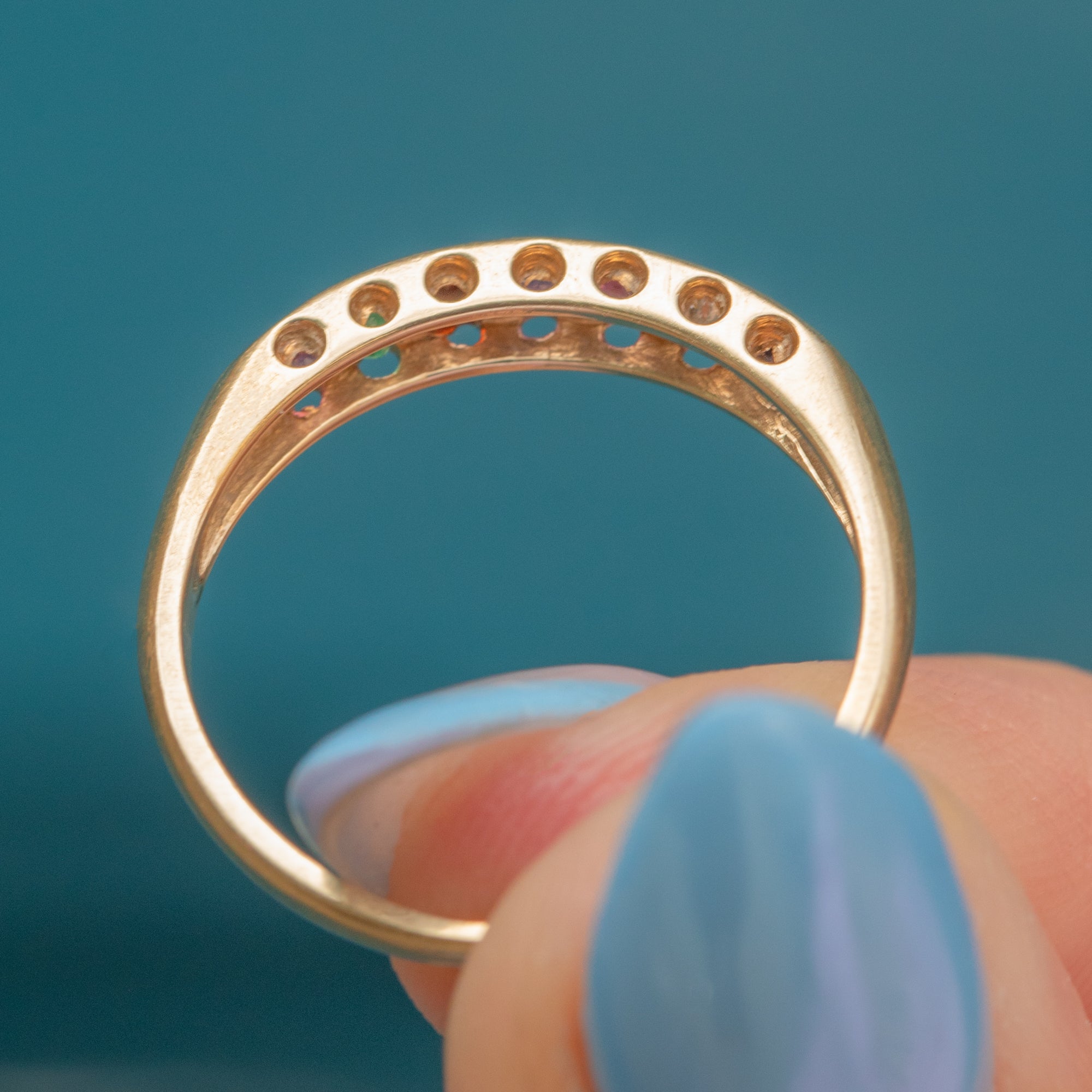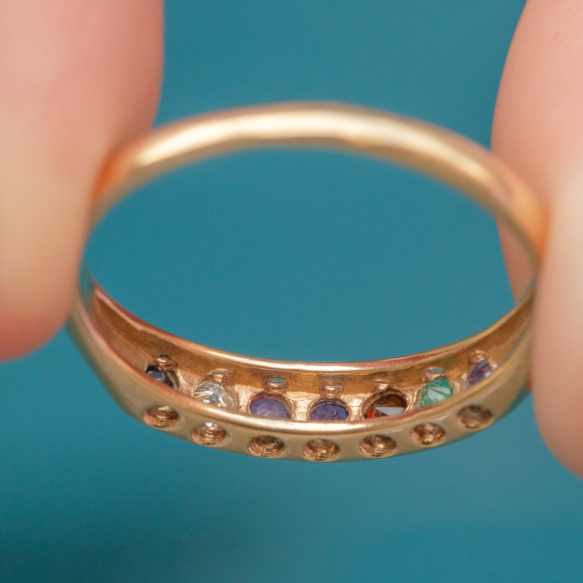 This refined vintage acrostic ring features seven scintillating multi-tonal gemstones, displayed proudly in luxurious 9ct Gold.