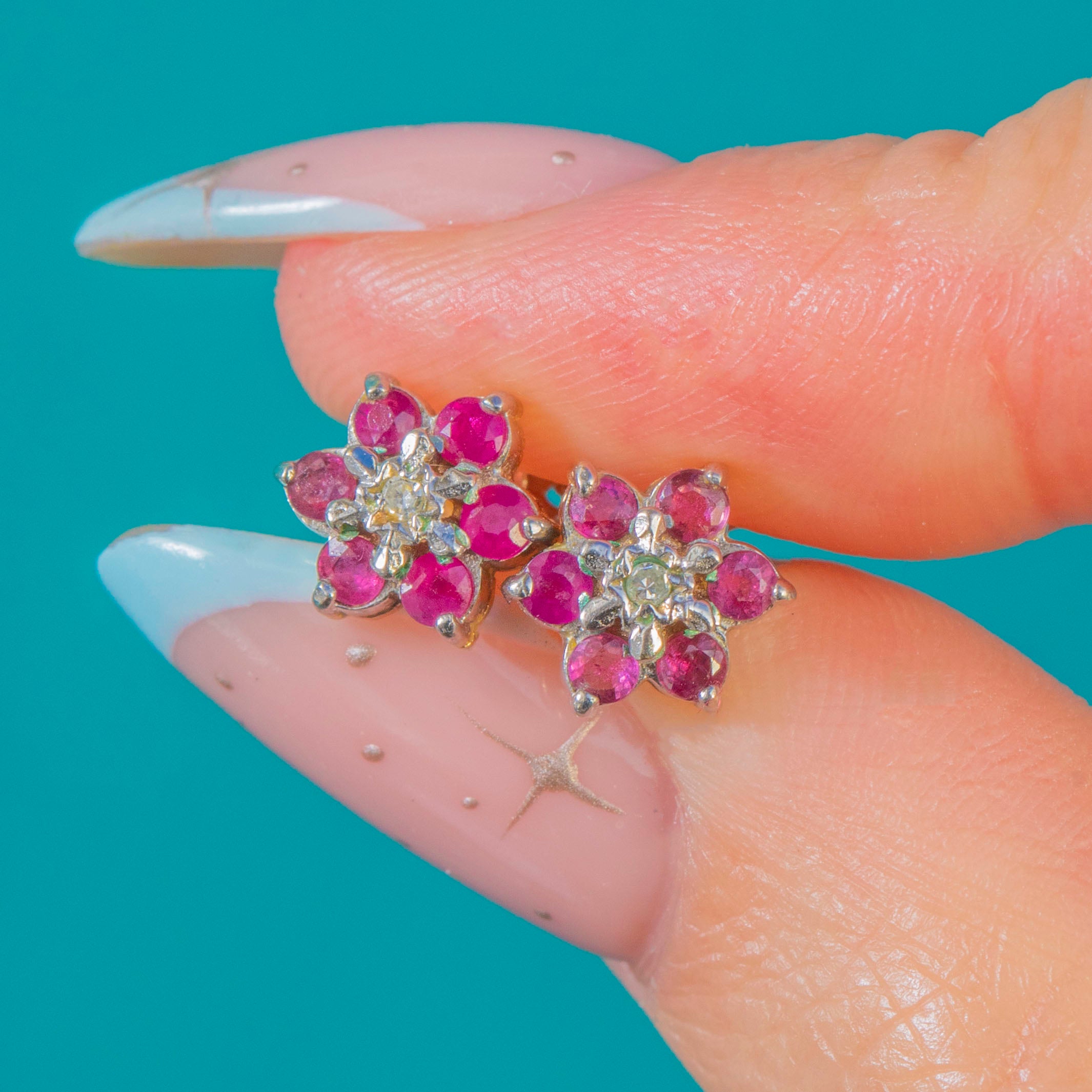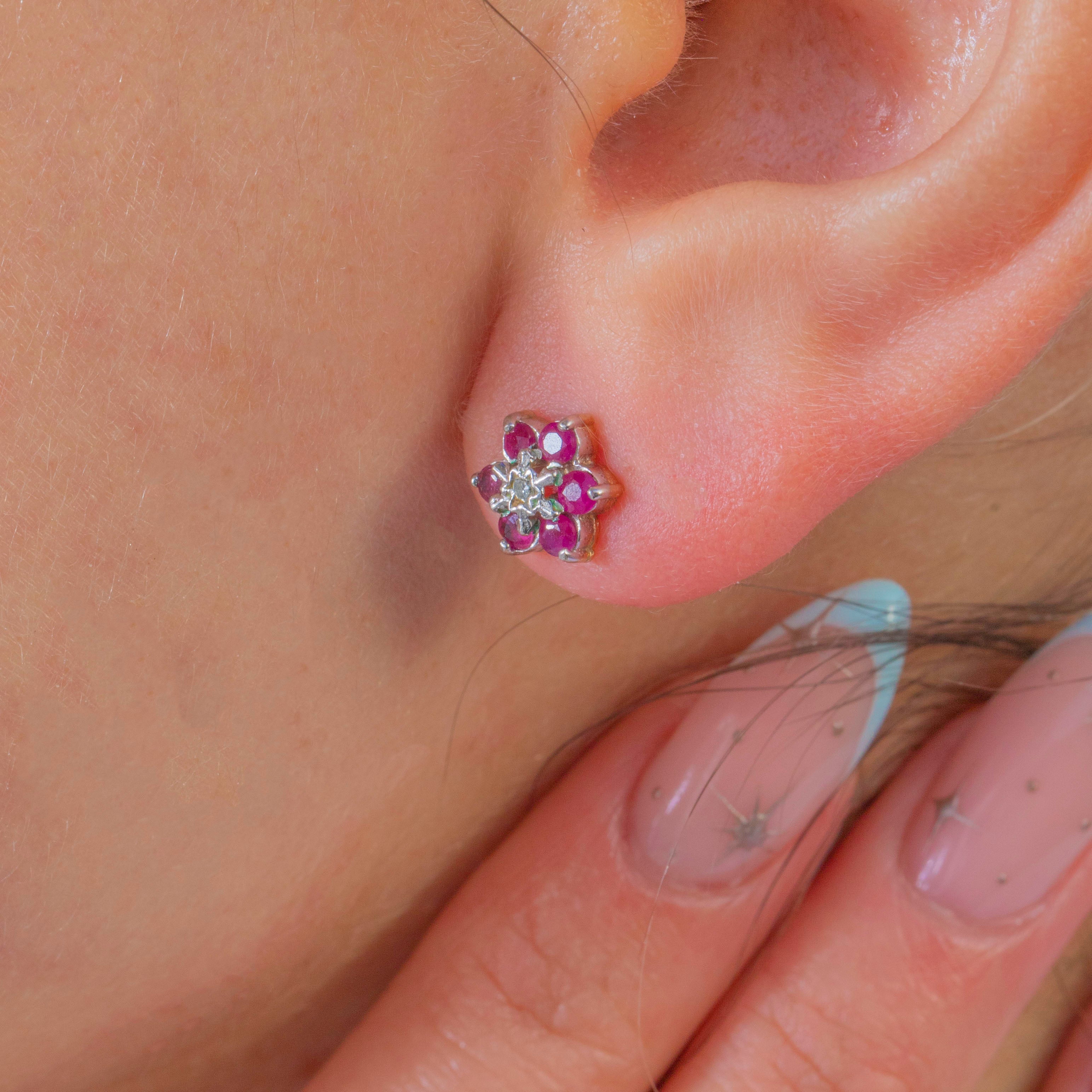 Sweet and sparkling, these 20th-century Vintage Ruby and Diamond cluster studs are a timeless pop of colour for every day. The crisp rosettes glow with vivid pink-red Rubies, punctuated by a twinkle of Diamonds at the centre for a fresh, lively sparkle.