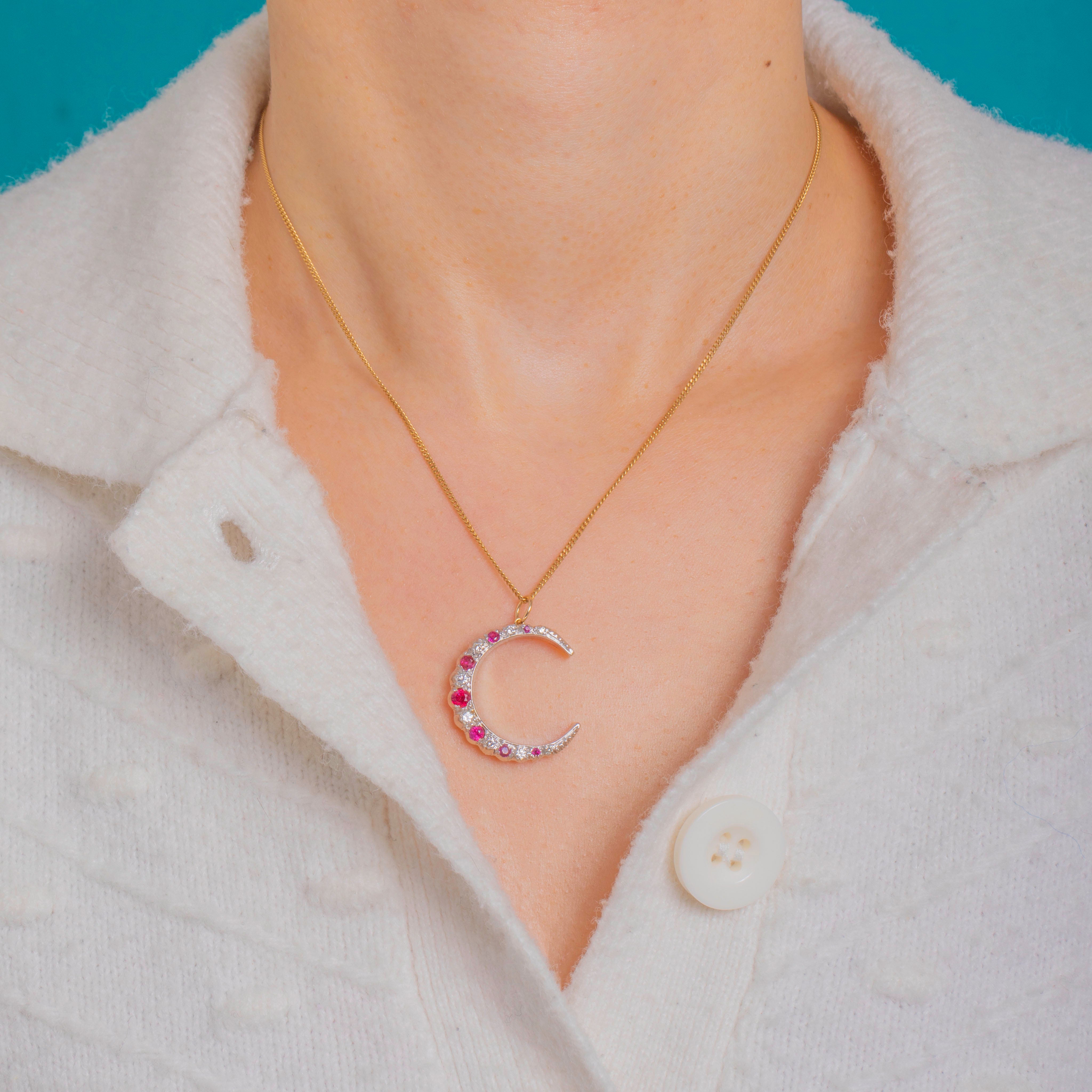 A luminous celestial treasure, this Vintage crescent moon pendant is crafted in two-tone 9ct Gold with a white Gold crescent and yellow Gold accents. The arc is set with a graceful graduation of bright Rubies and sparkling Diamonds in scalloped settings, lending a romantic Victorian-revival feel with crisp milgrain detail. Vivid reds play beautifully against icy white brilliance, creating an elegant, timeless glow.