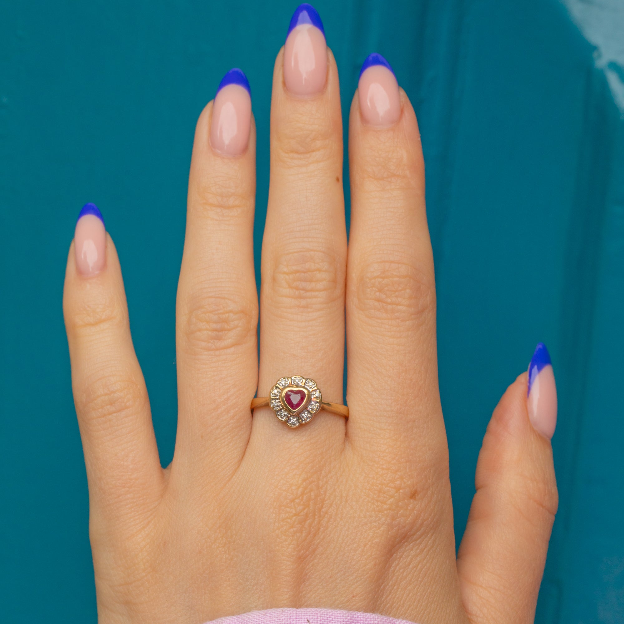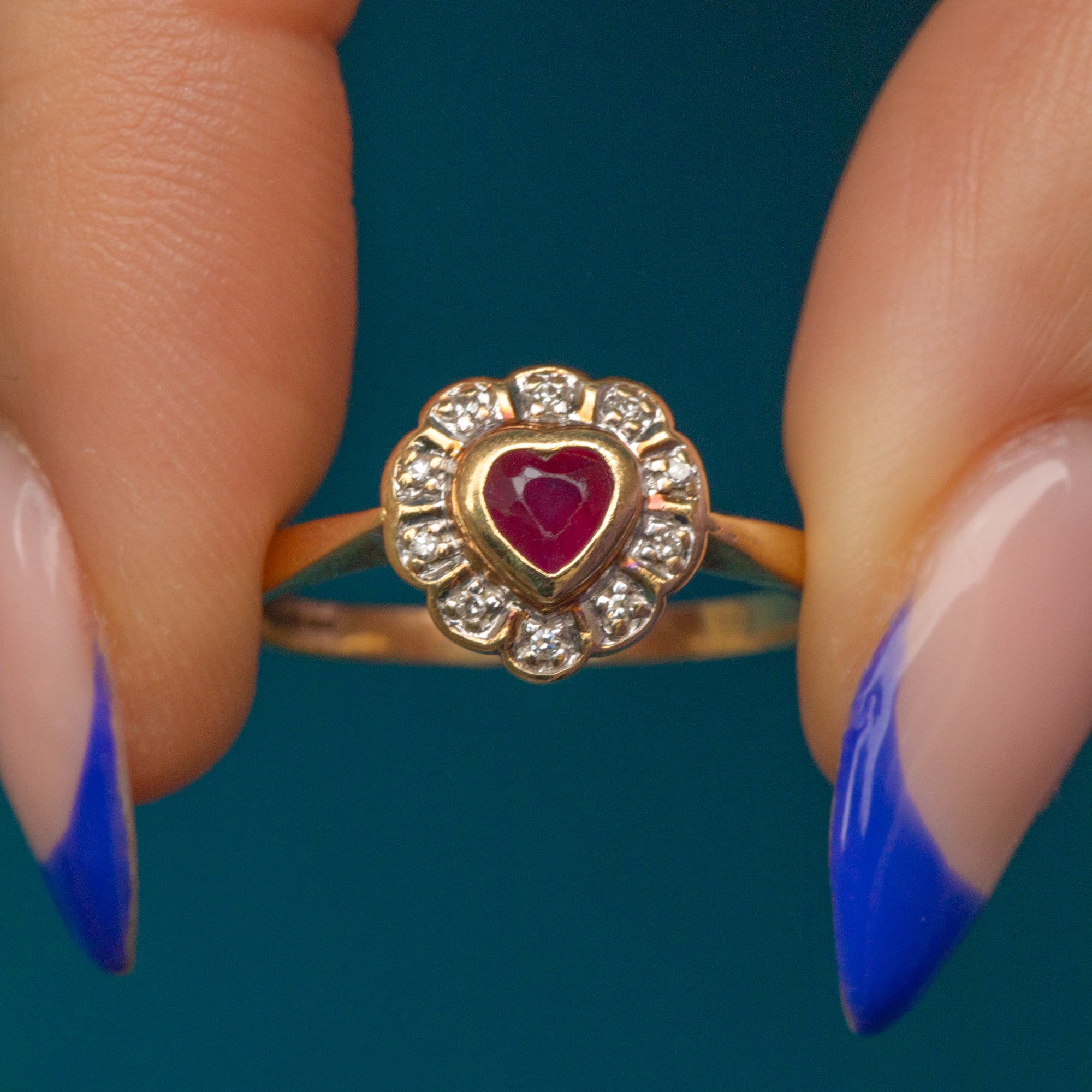 We have found heaven in the form of this 9ct Gold Ruby Diamond heart ring! Bursting with romantic charm, she homes a deep pink Ruby that will capture the hearts of anyone lucky enough to lay eyes on her, surrounded by a sea of scintillating Diamonds.