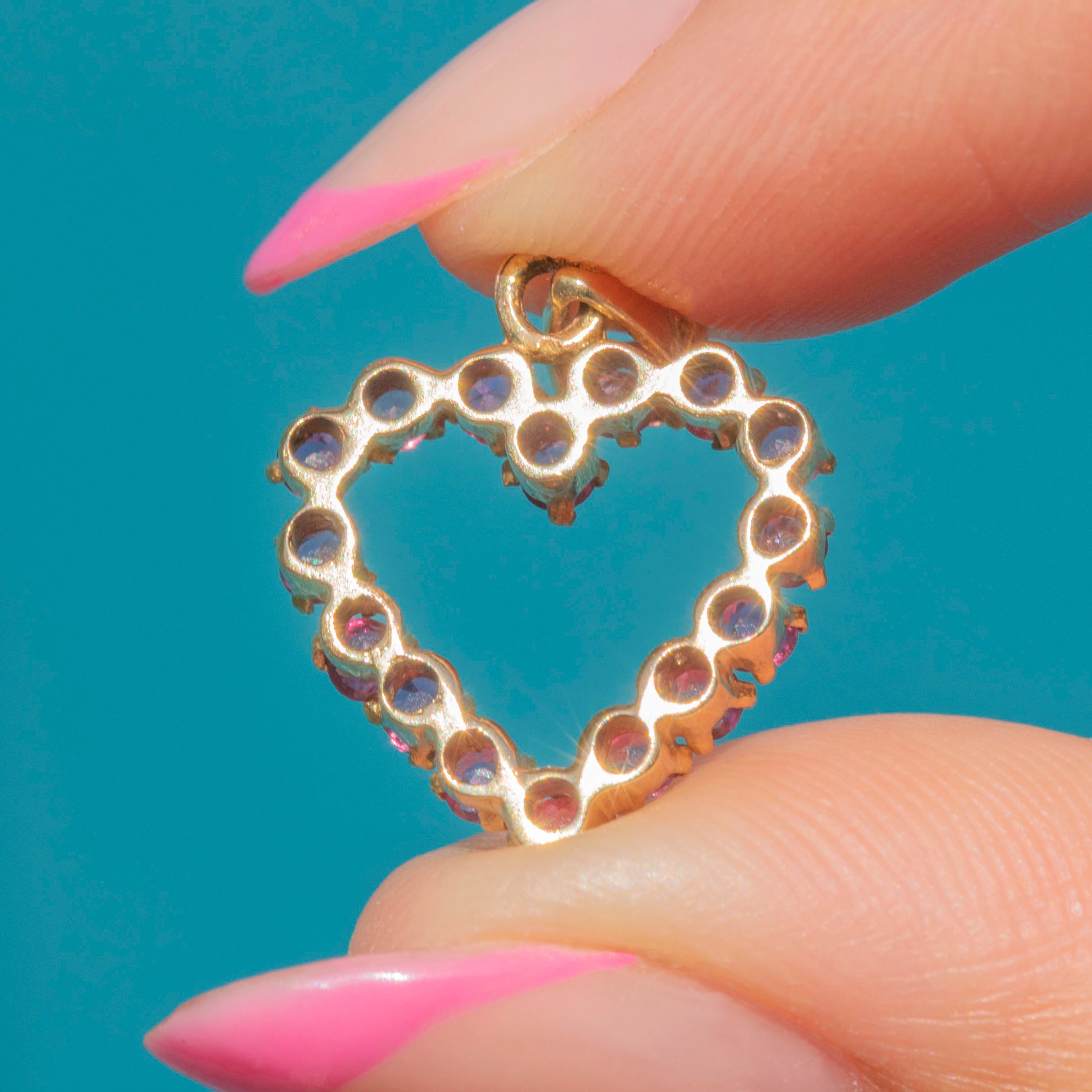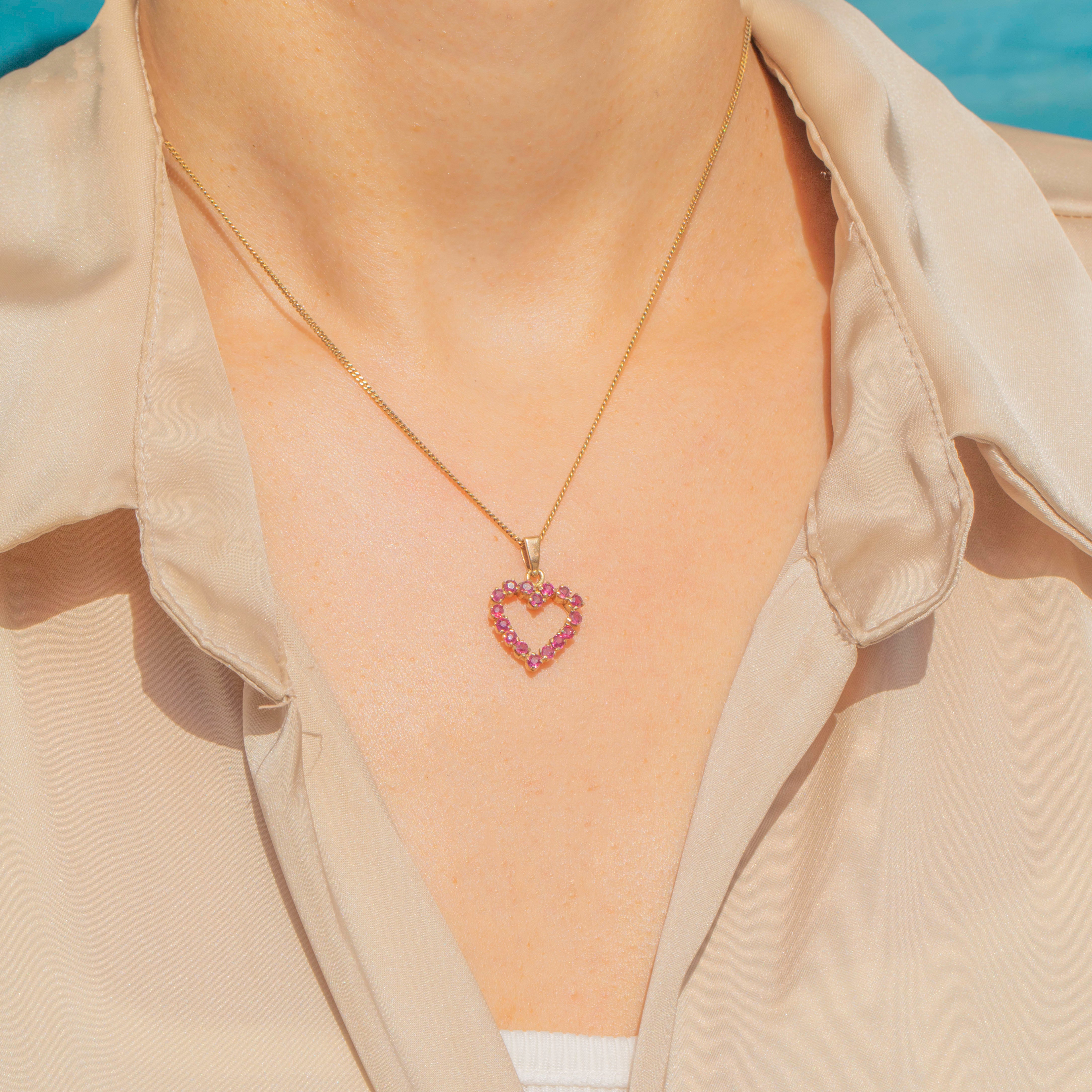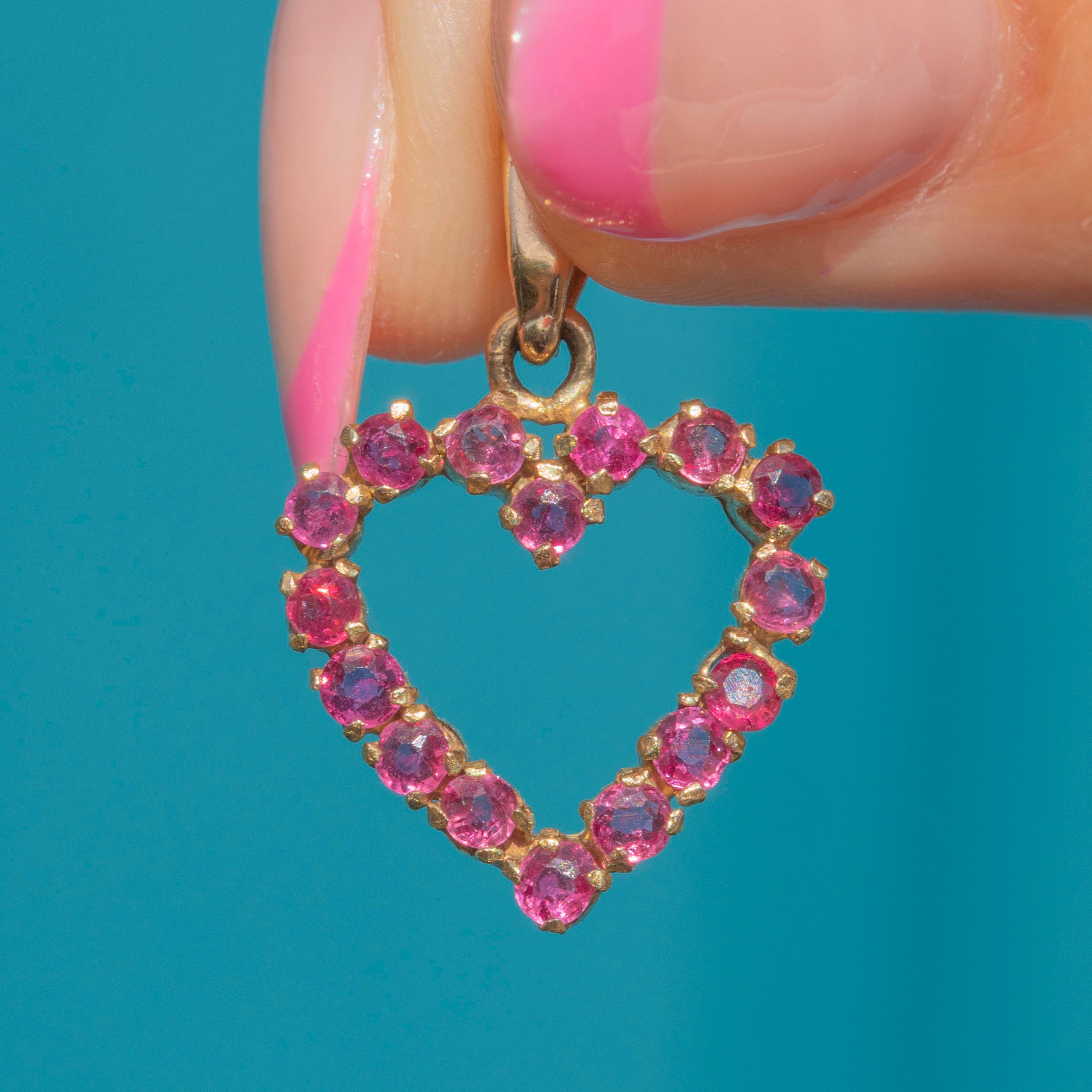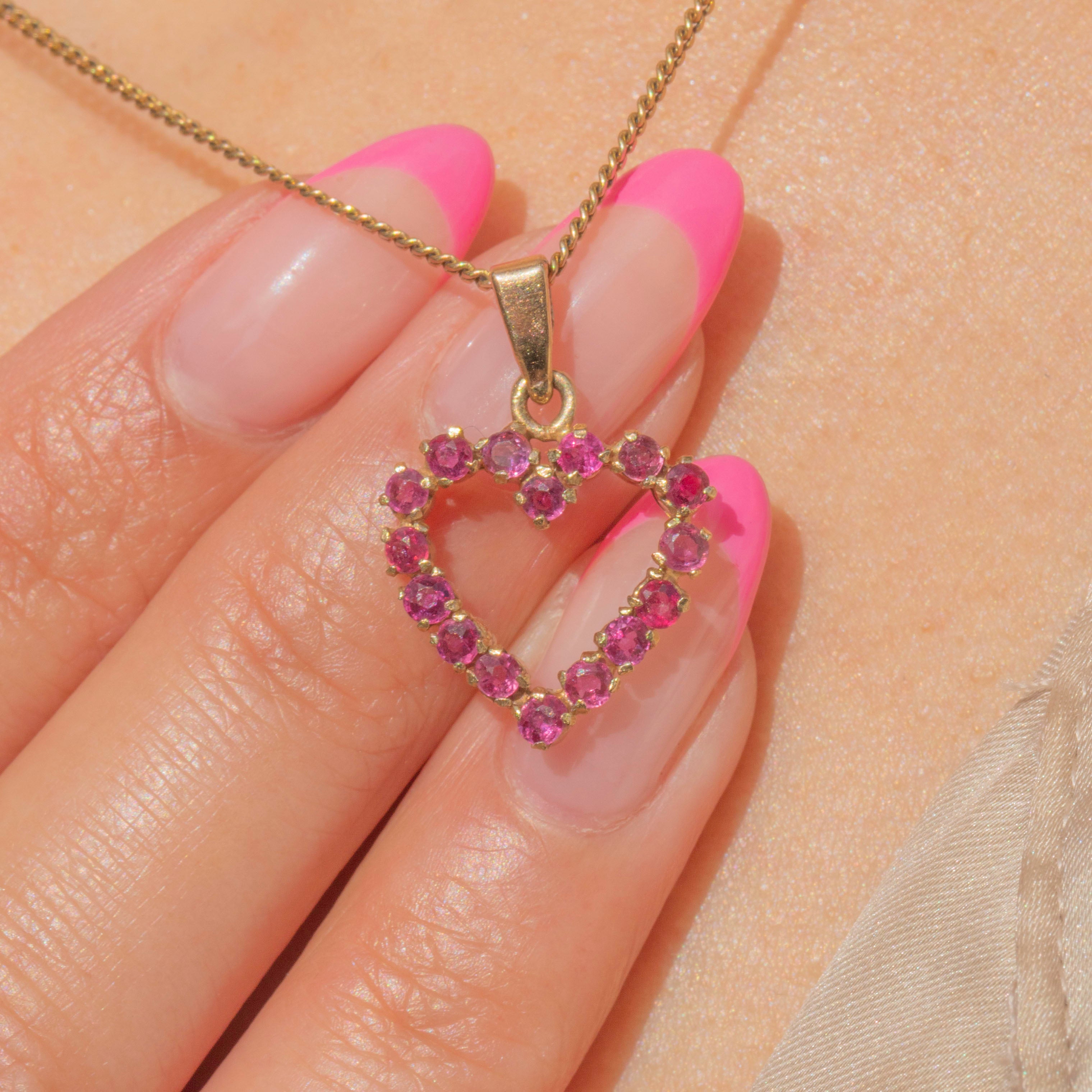 EXCELLENT: This 9ct Gold Ruby heart pendant is in mint condition. Her gemstones are all secure in their settings, without accruing any scuffs or dents throughout the years. Her Gold has clear Hallmarks and has aged well over the years, keeping her saturated honey-toned colour. She's the most sentimental soul!