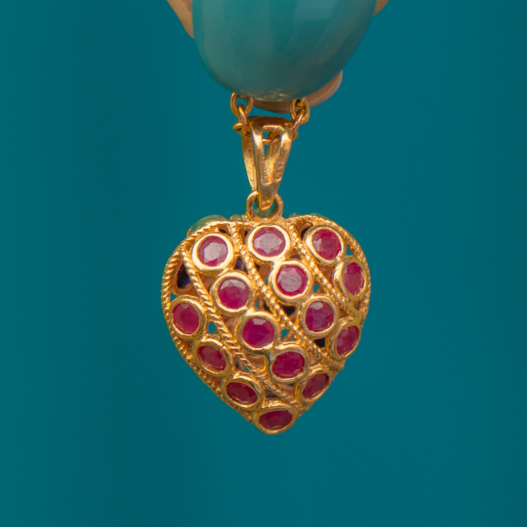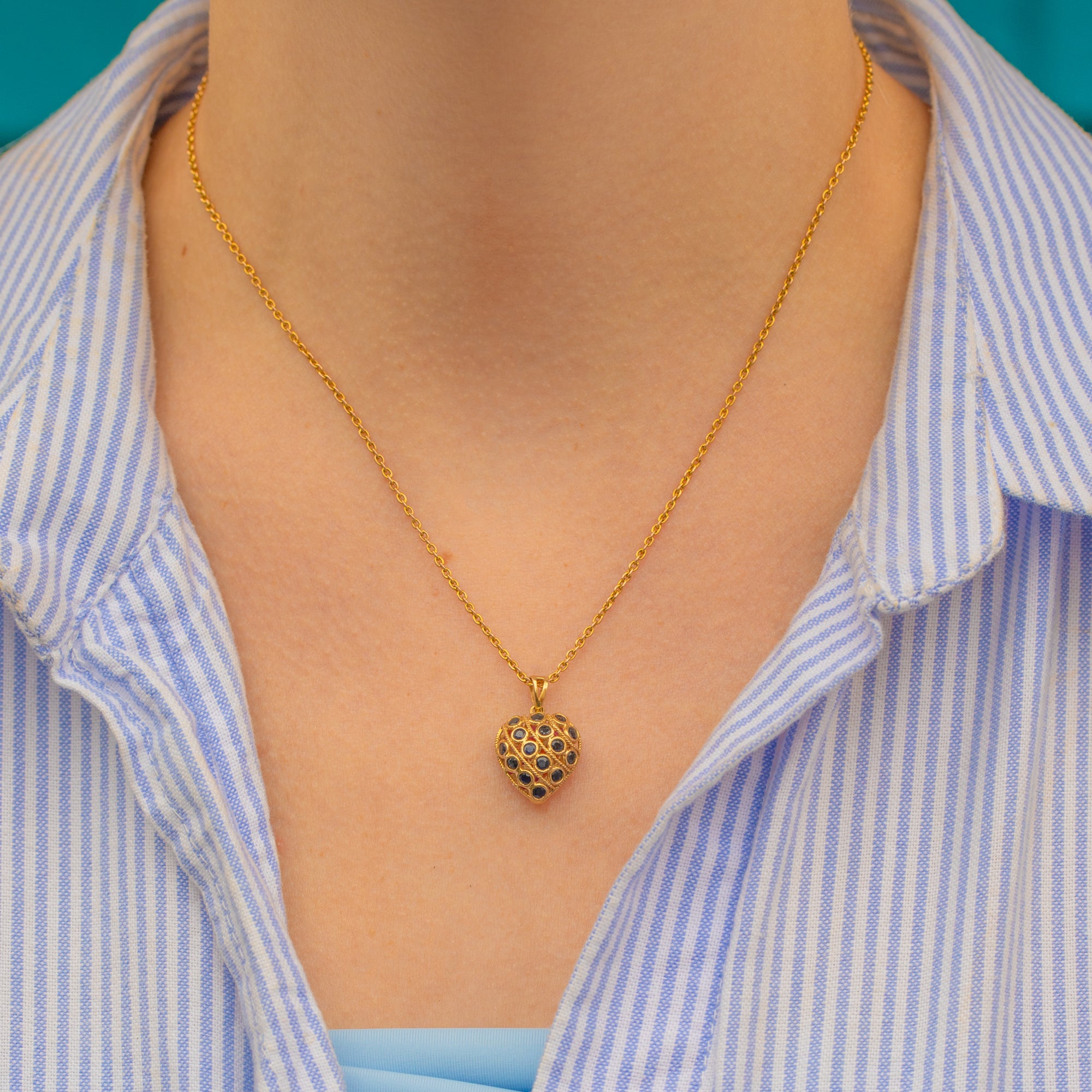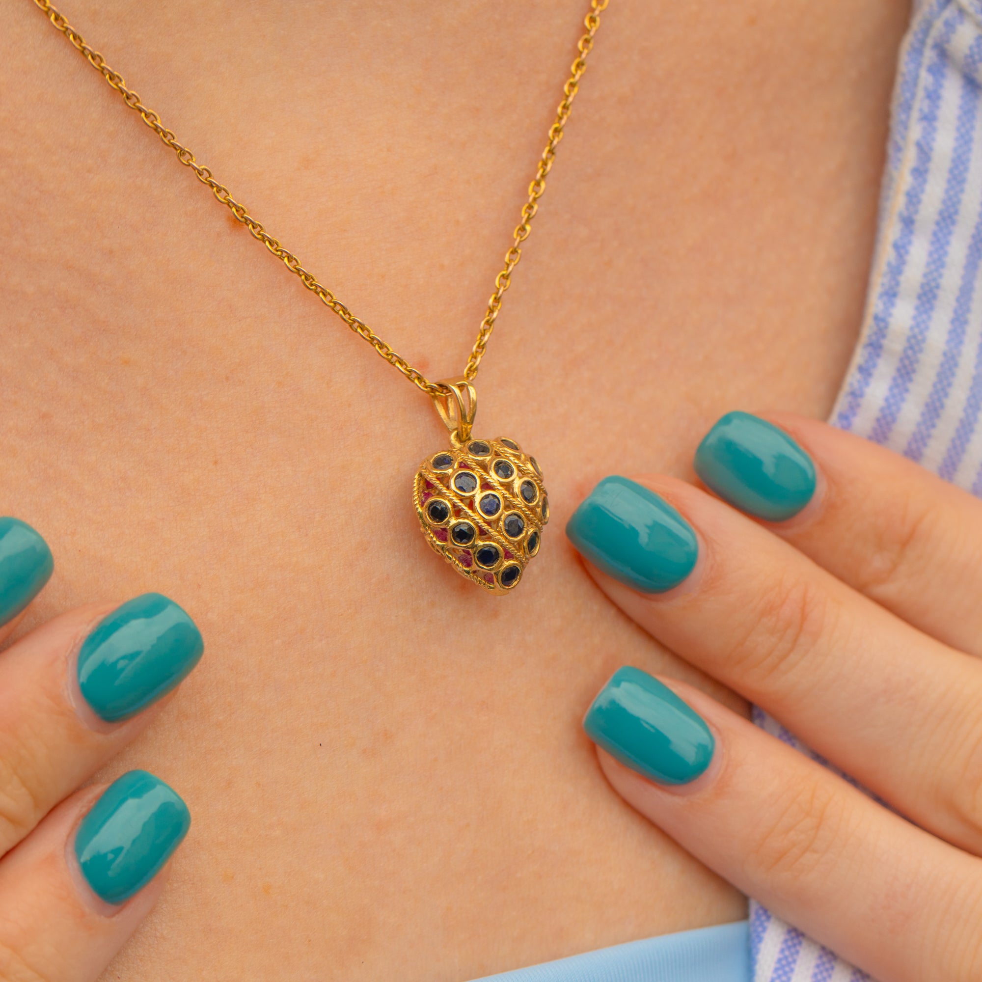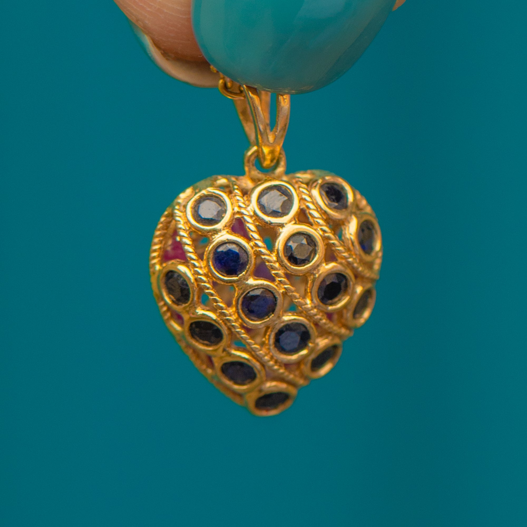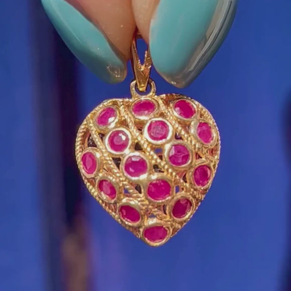 This exquisite 9ct Gold Ruby Sapphire heart pendant would make the perfect love token! Intricately formed details span both sides of this enchanting vintage pendant, crafted entirely from buttery 9ct Gold.