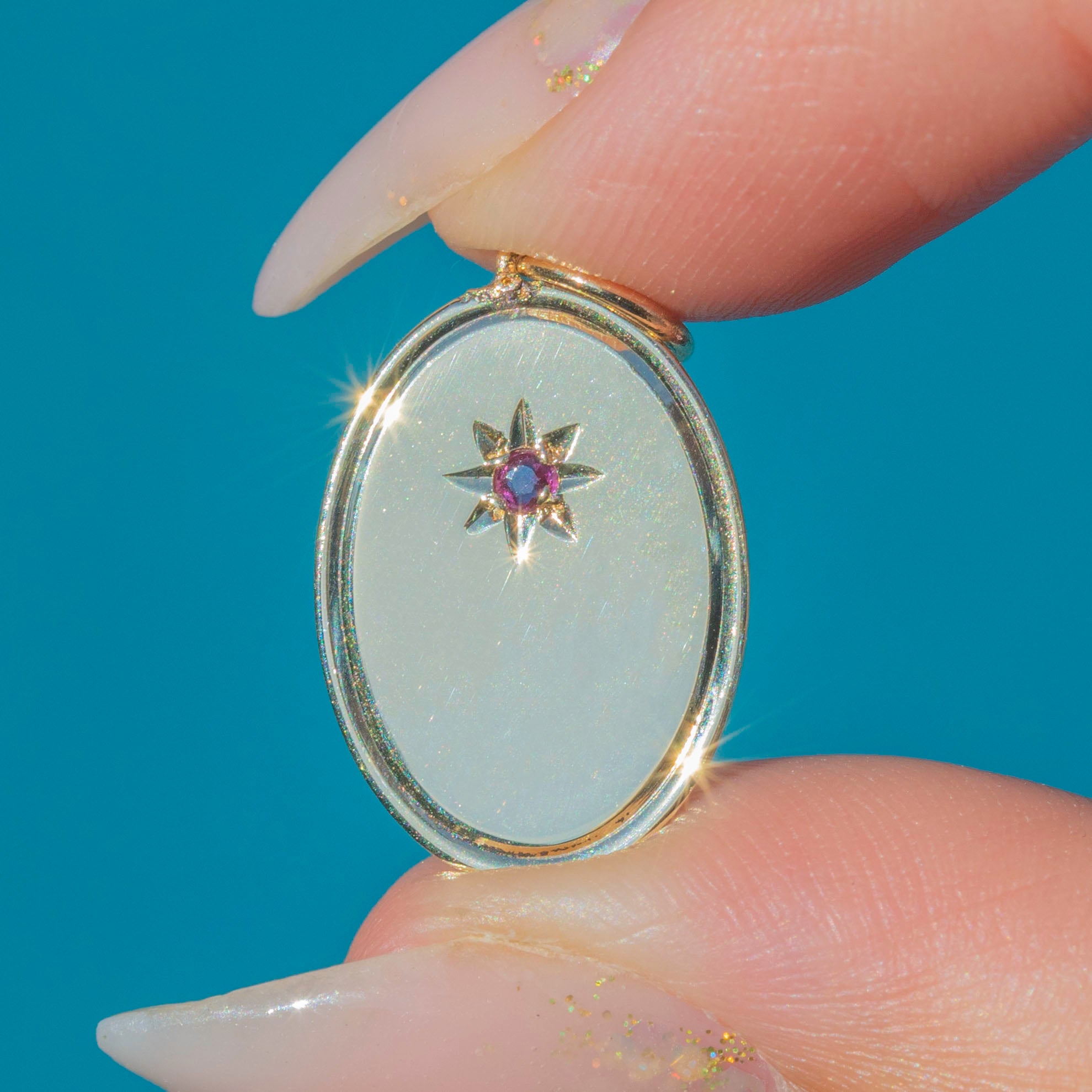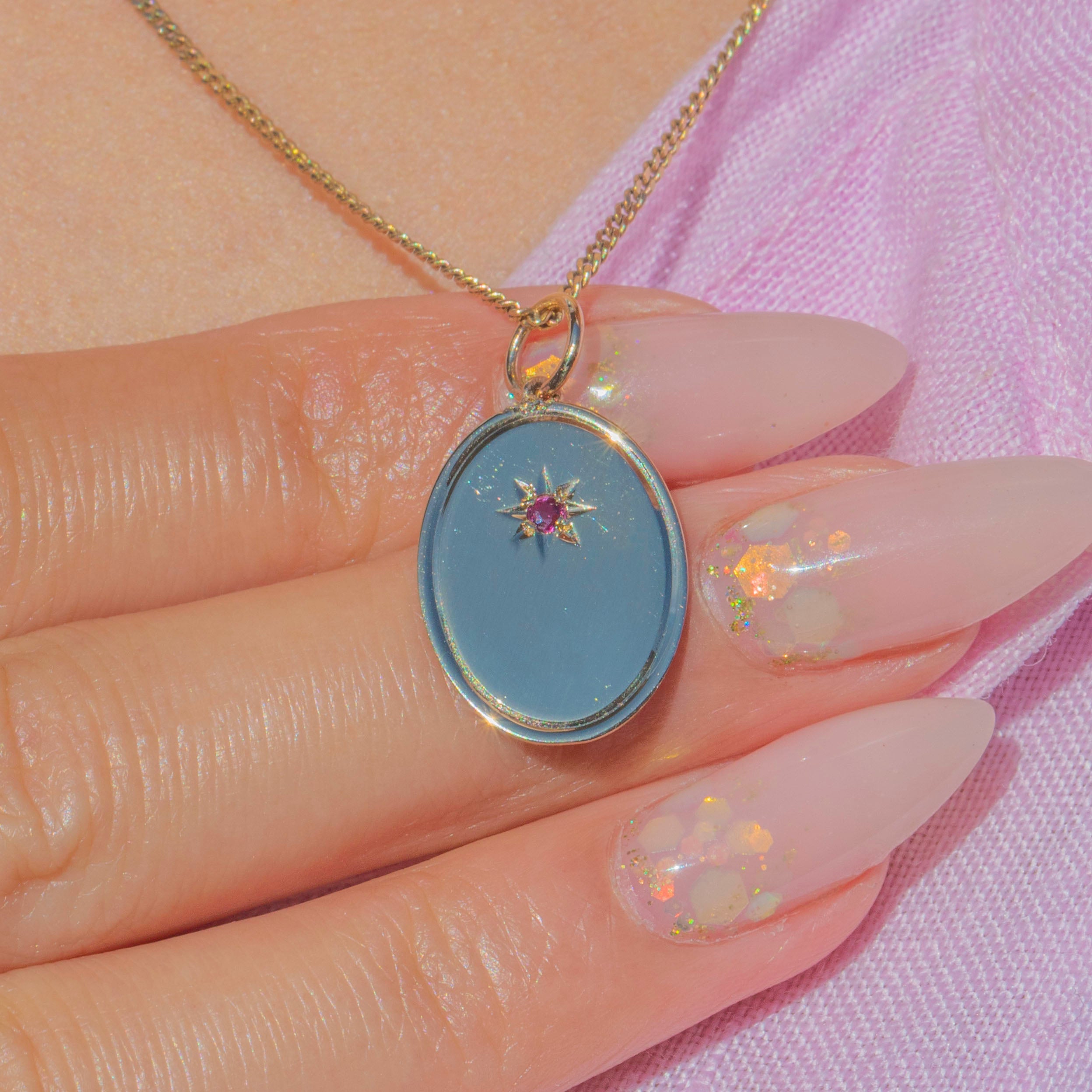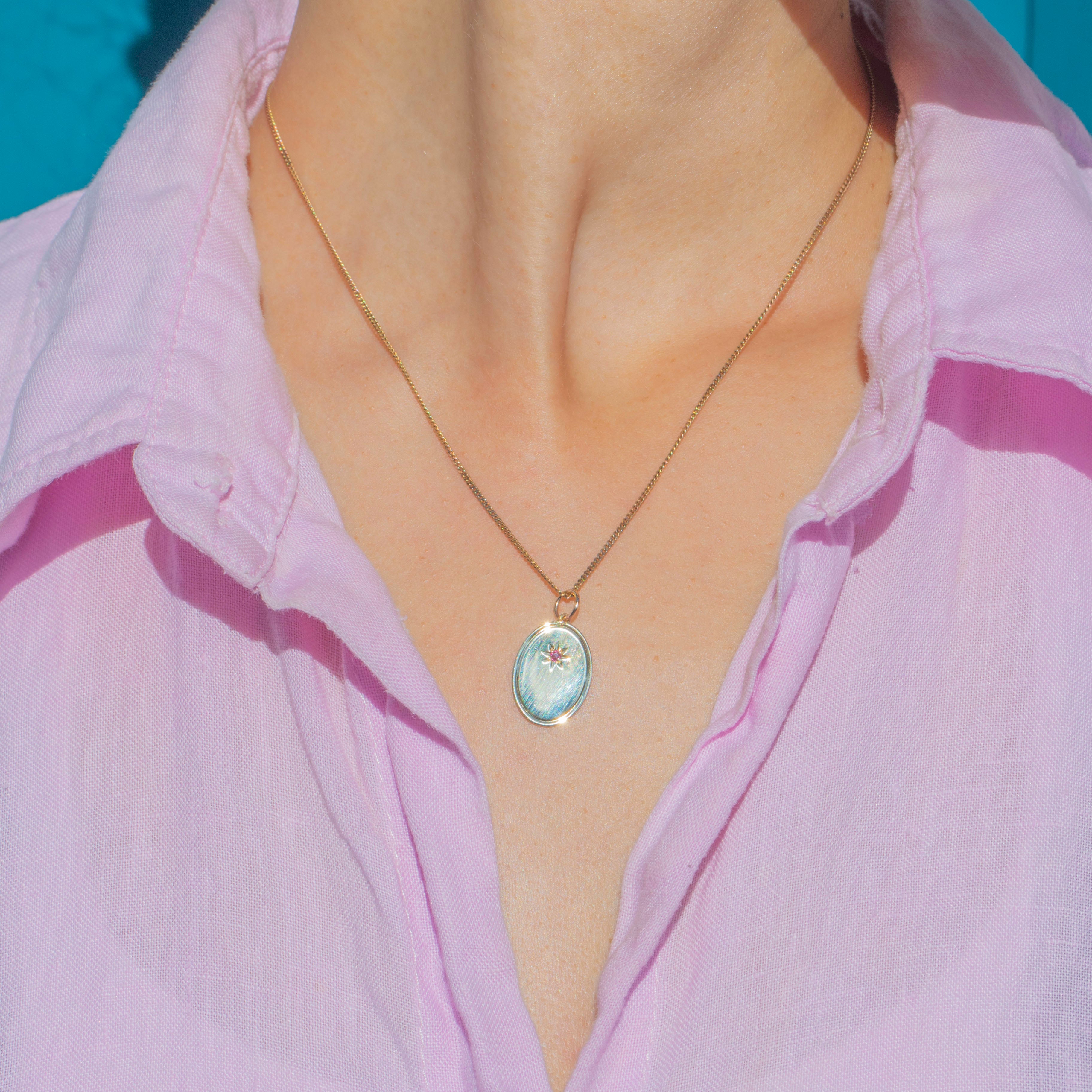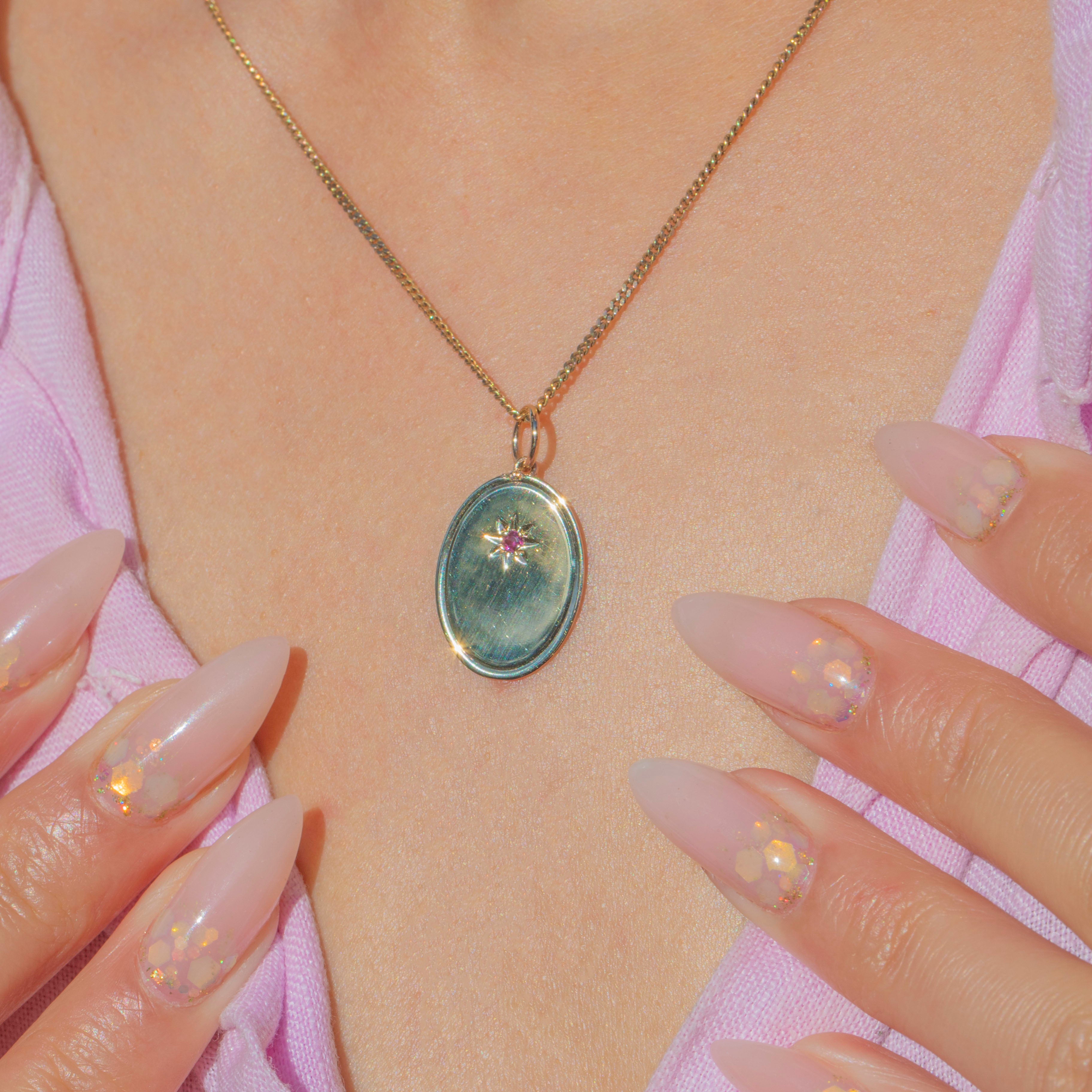 This stylish Art Deco charm is crafted in solid 9ct Gold and set with a pretty pinkish-red star-set natural Ruby! A crisp and pleasing simple disc of Yellow Gold with a subtle bevelled edge, that catches the light beautifully.