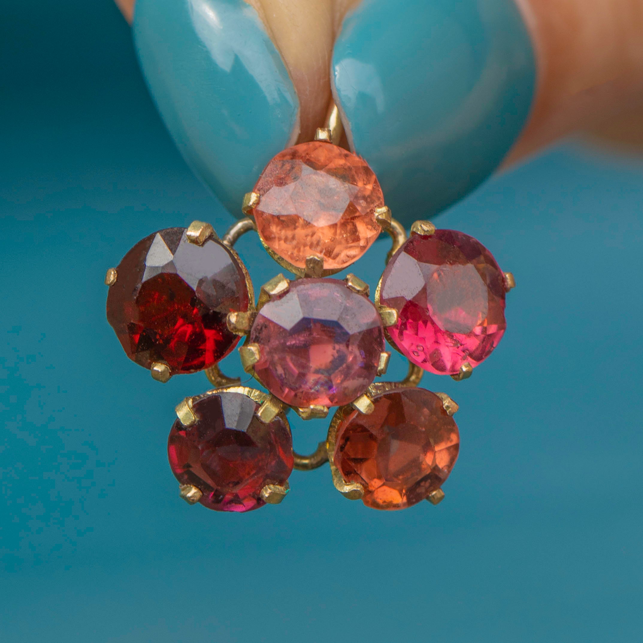 This 9ct Gold Ruby and Topaz multi-gemstone pendant showcases the most delightful Tutti-Frutti-inspired palette. This Vintage flower pendant will certainly be bringing a burst of mouthwatering colour to your antique jewellery collection.