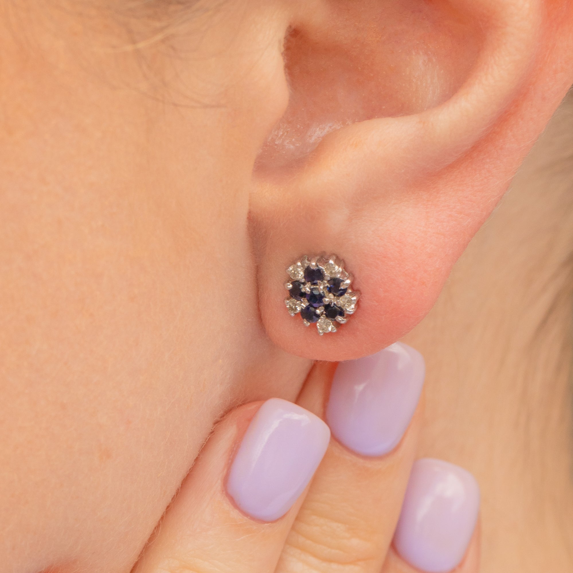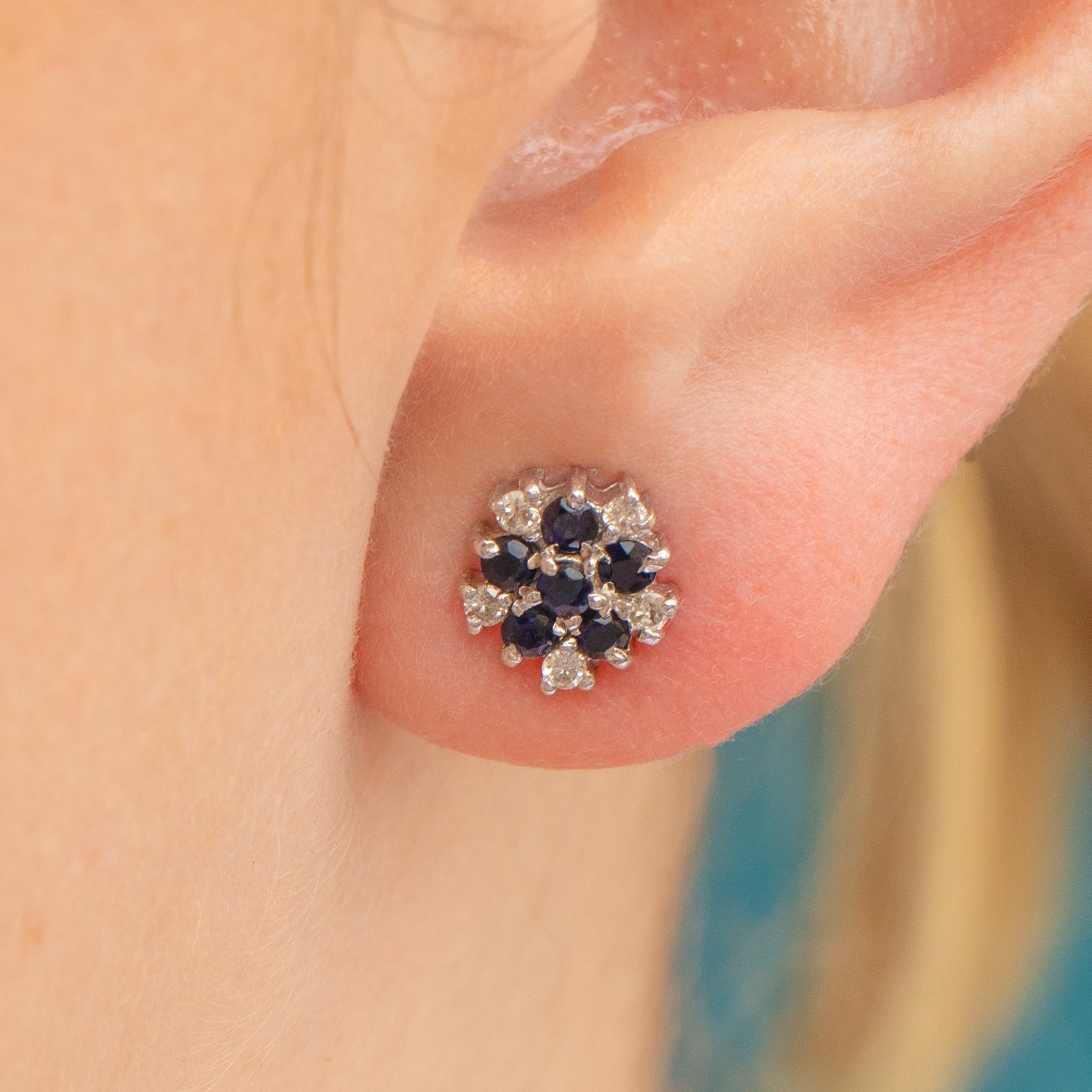 These 9ct Gold Sapphire Diamond flower cluster stud earrings provide bundles of sparkle! The midnight blue Sapphire and crisp white Diamond combination make for perfectly formed flowers that sit snug in your lobes.