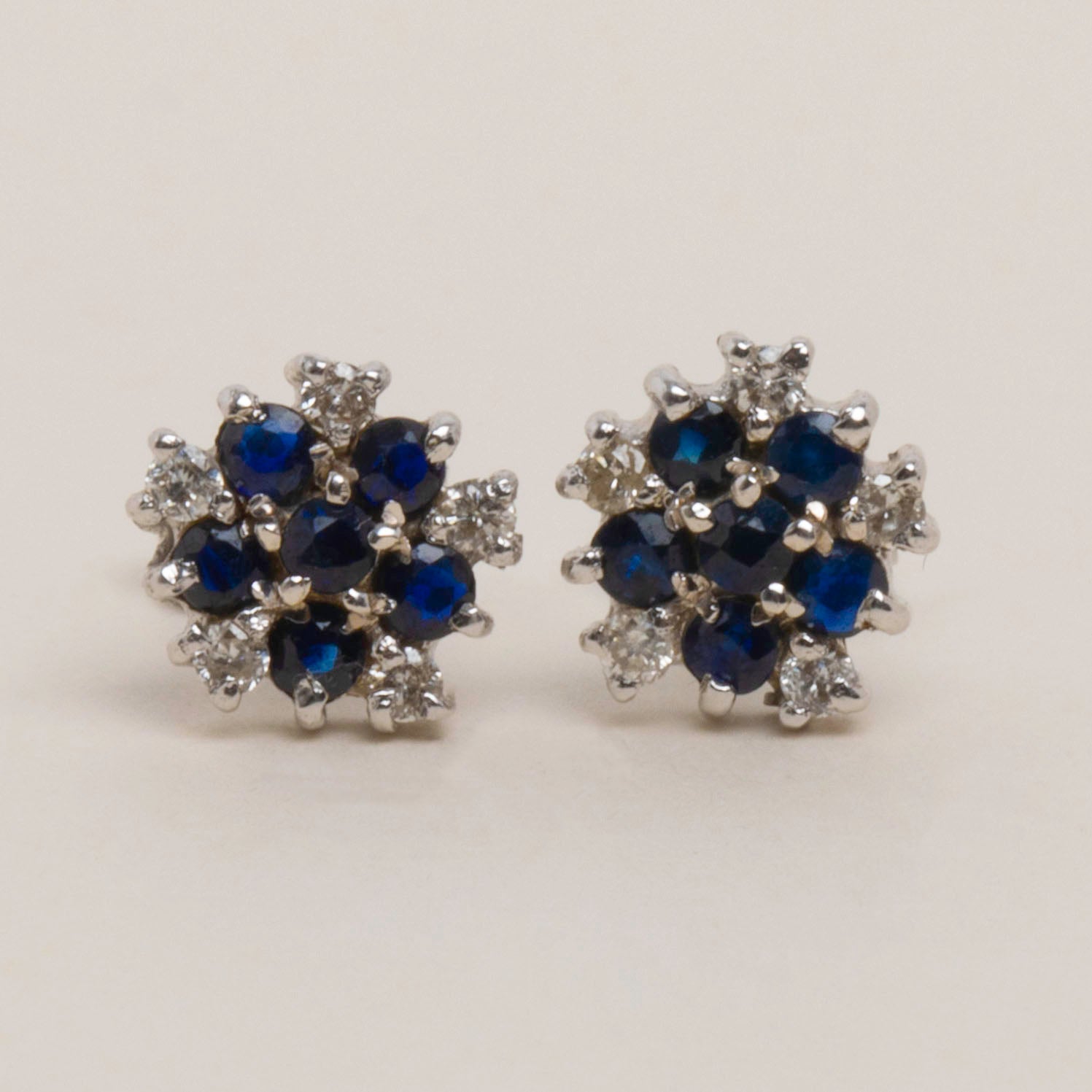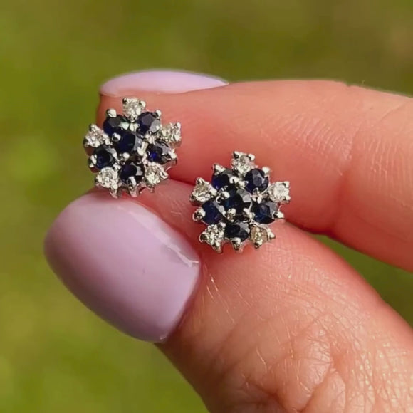9ct Gold Sapphire Diamond Flower Cluster Stud Earrings