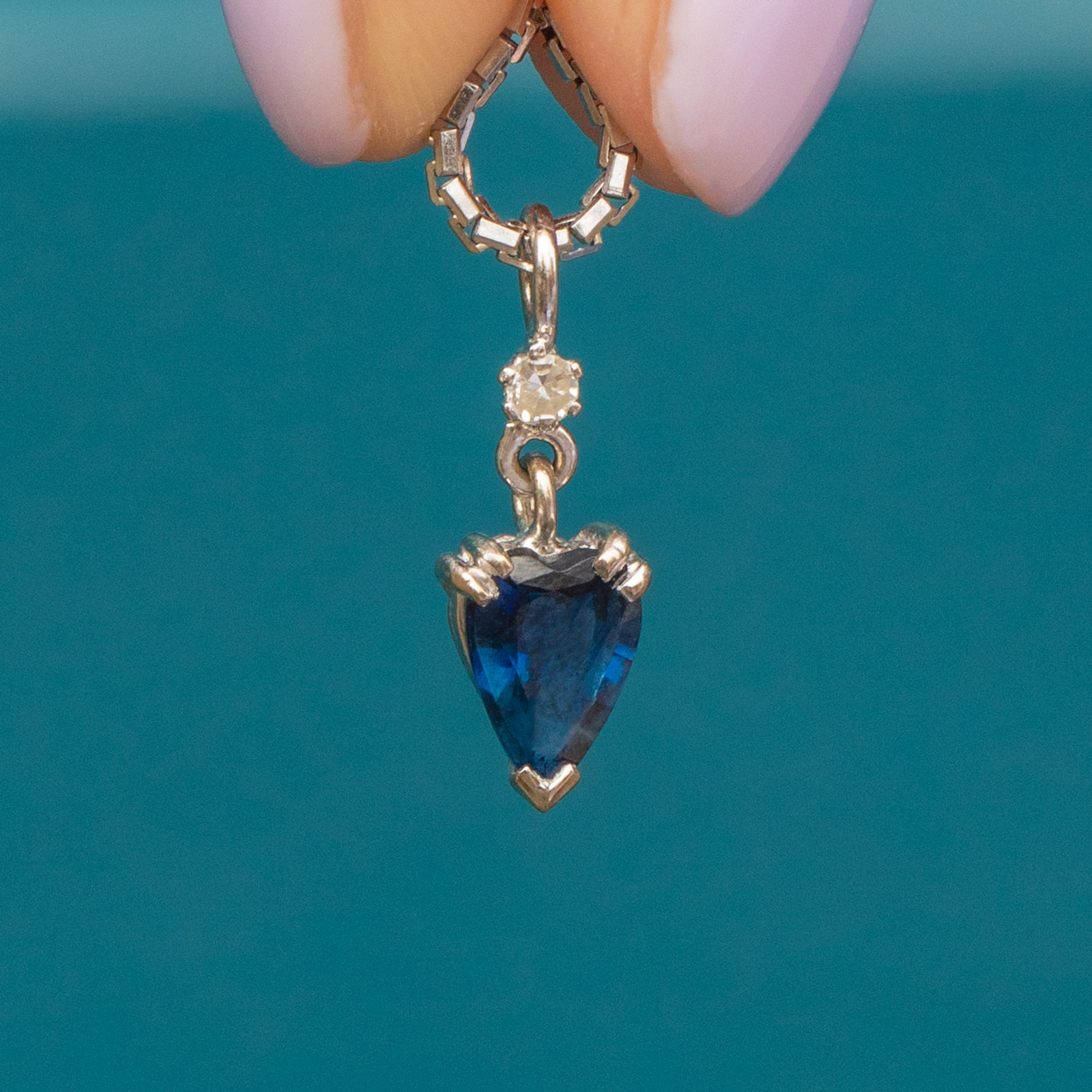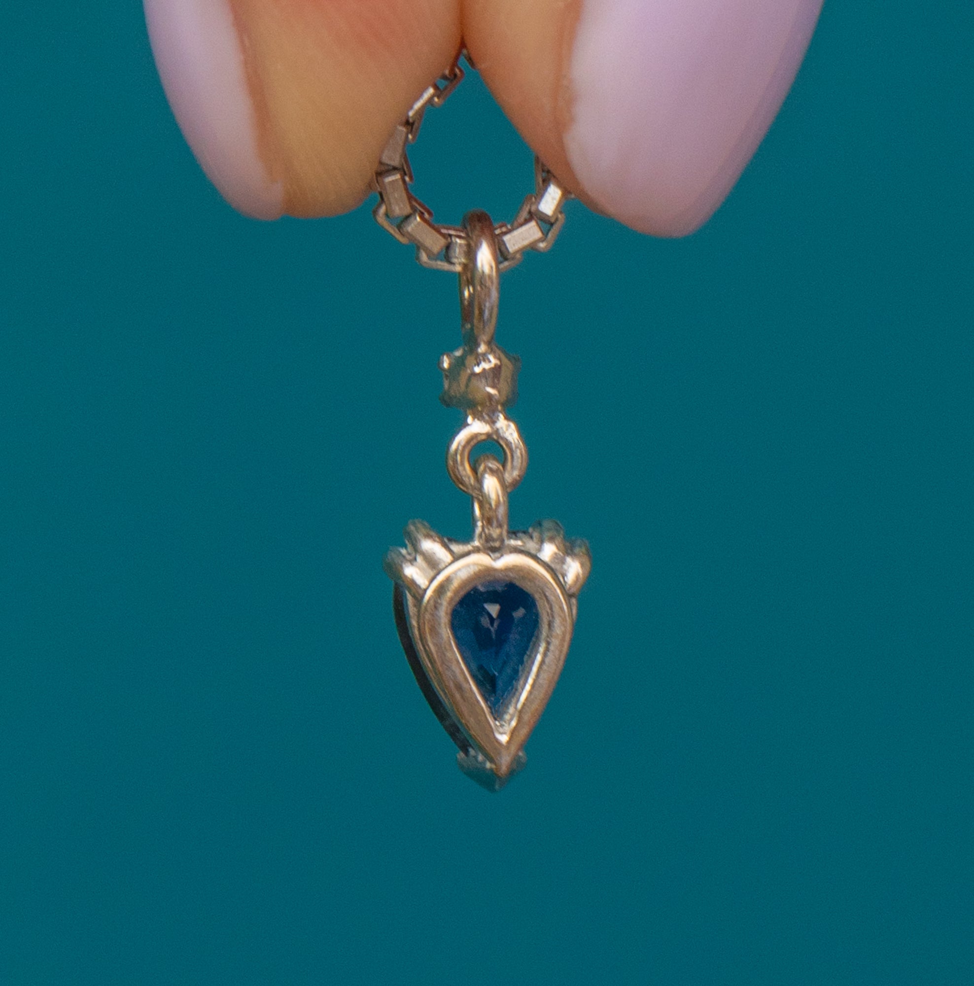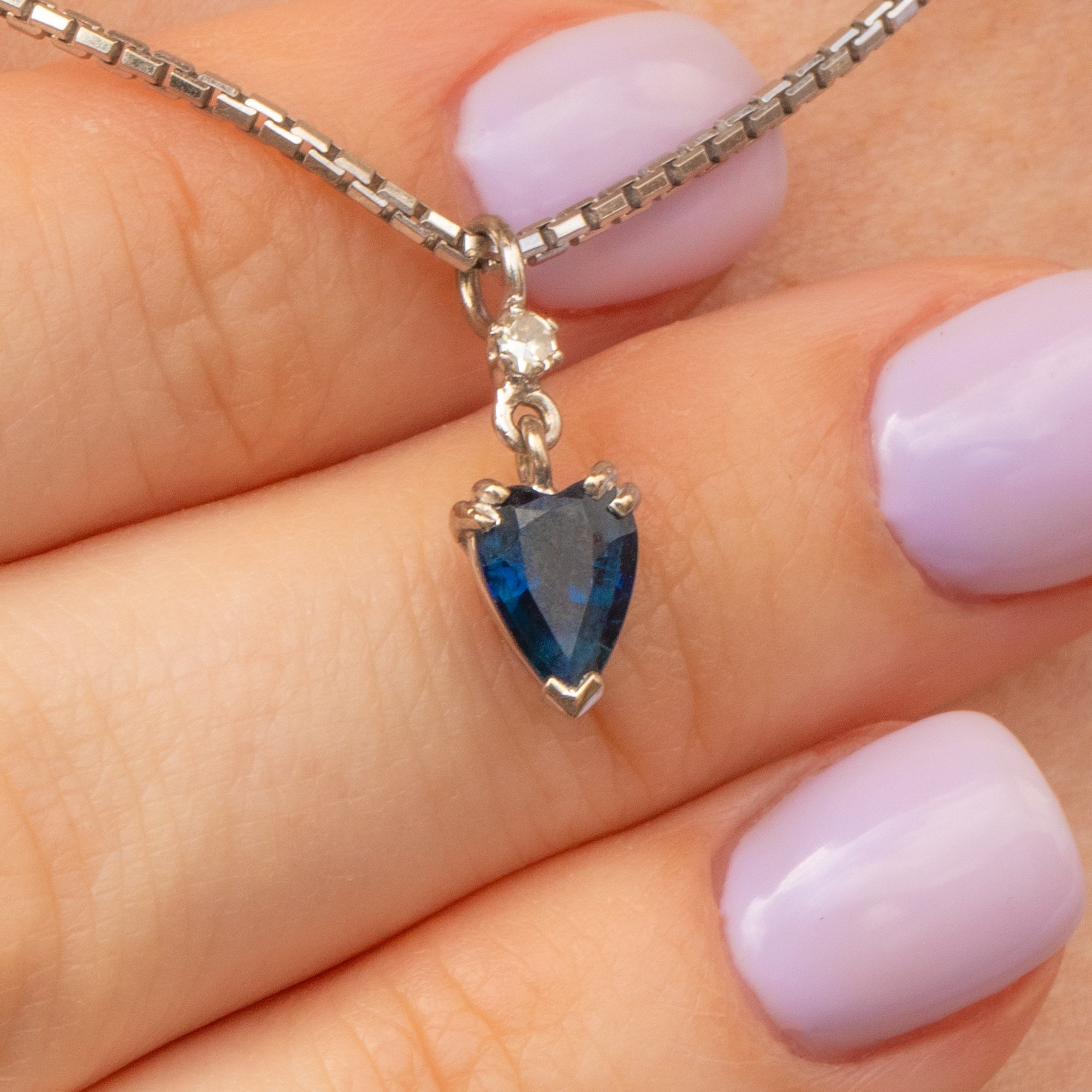 The sweet little blue Sapphire heart is topped with a dainty Diamond, making this romantic treasure something to keep close to your heart!
