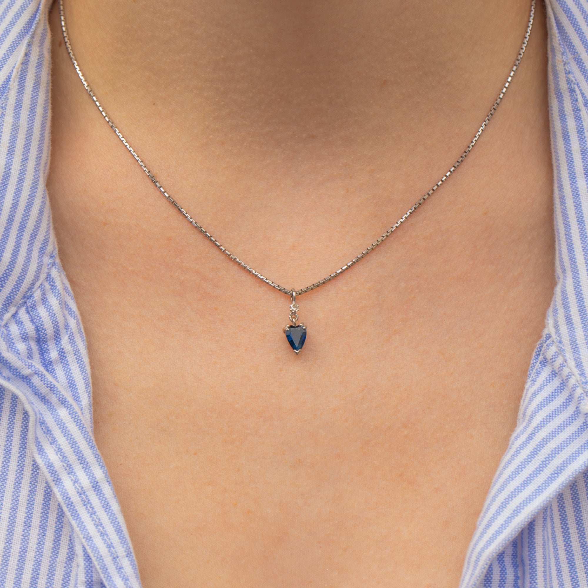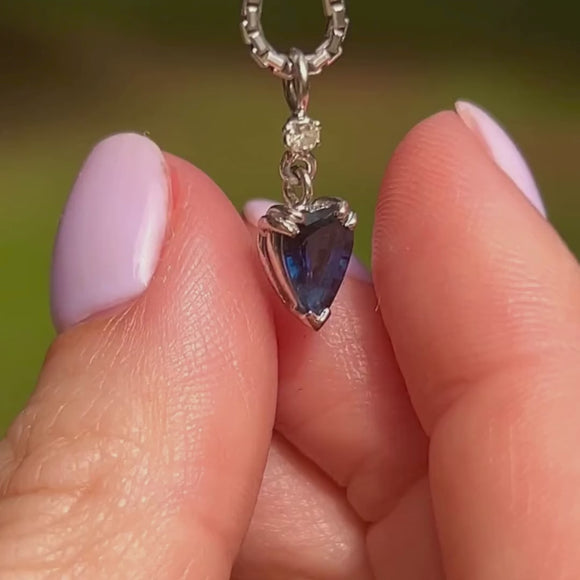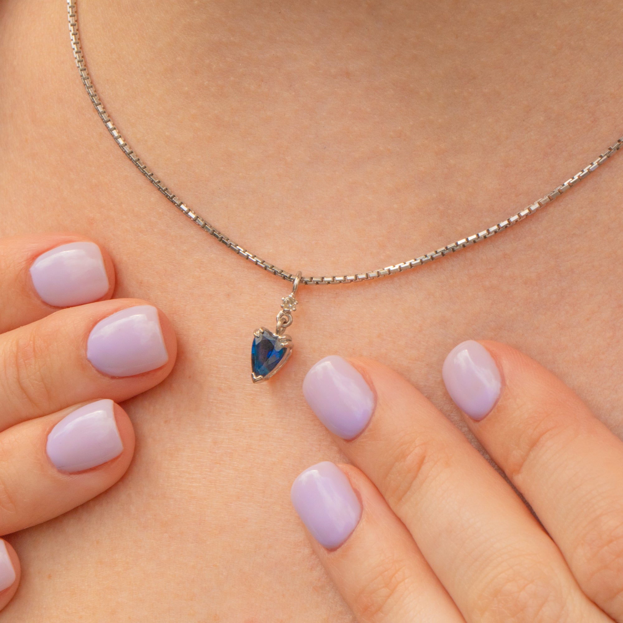 The sweet little blue Sapphire heart is topped with a dainty Diamond, making this romantic treasure something to keep close to your heart!