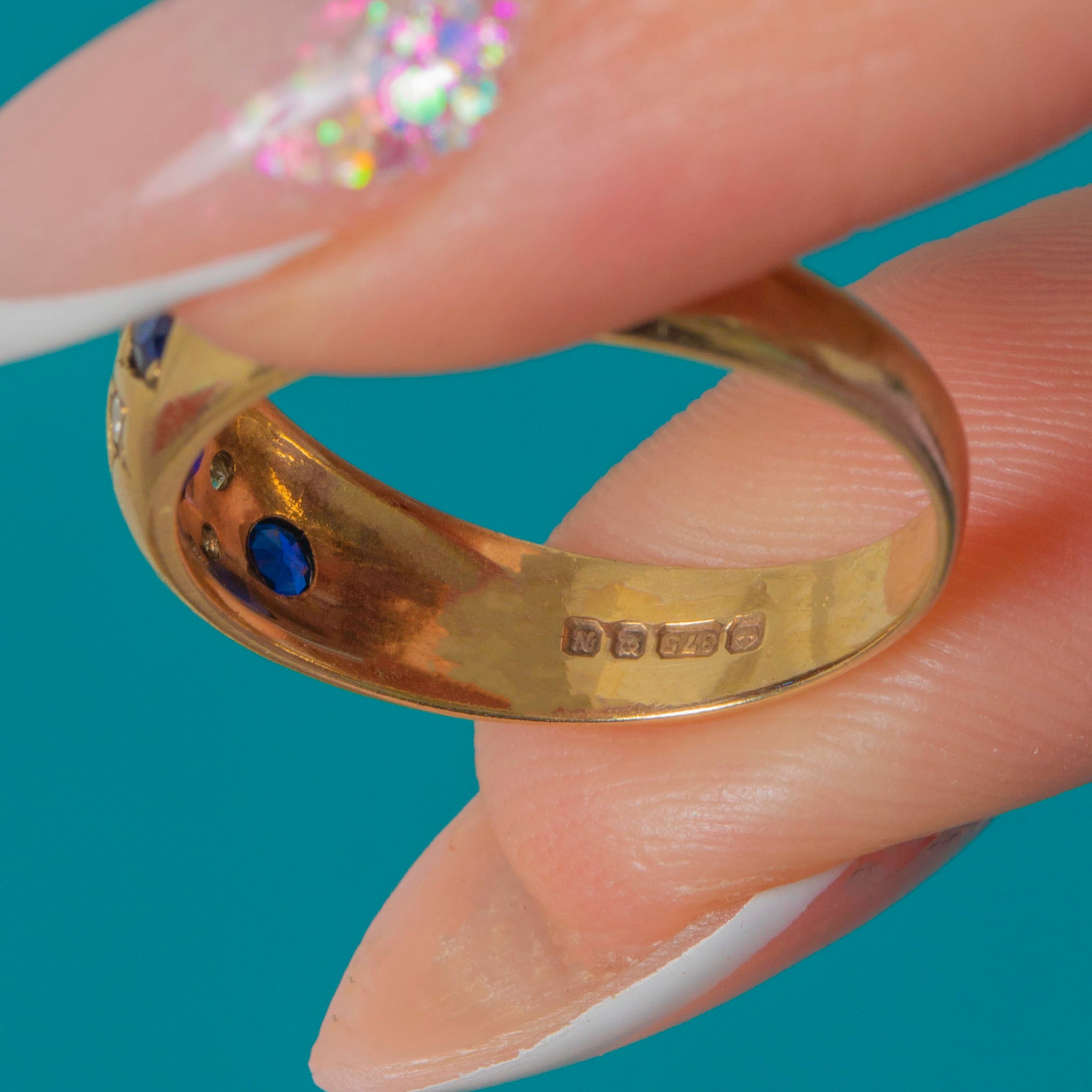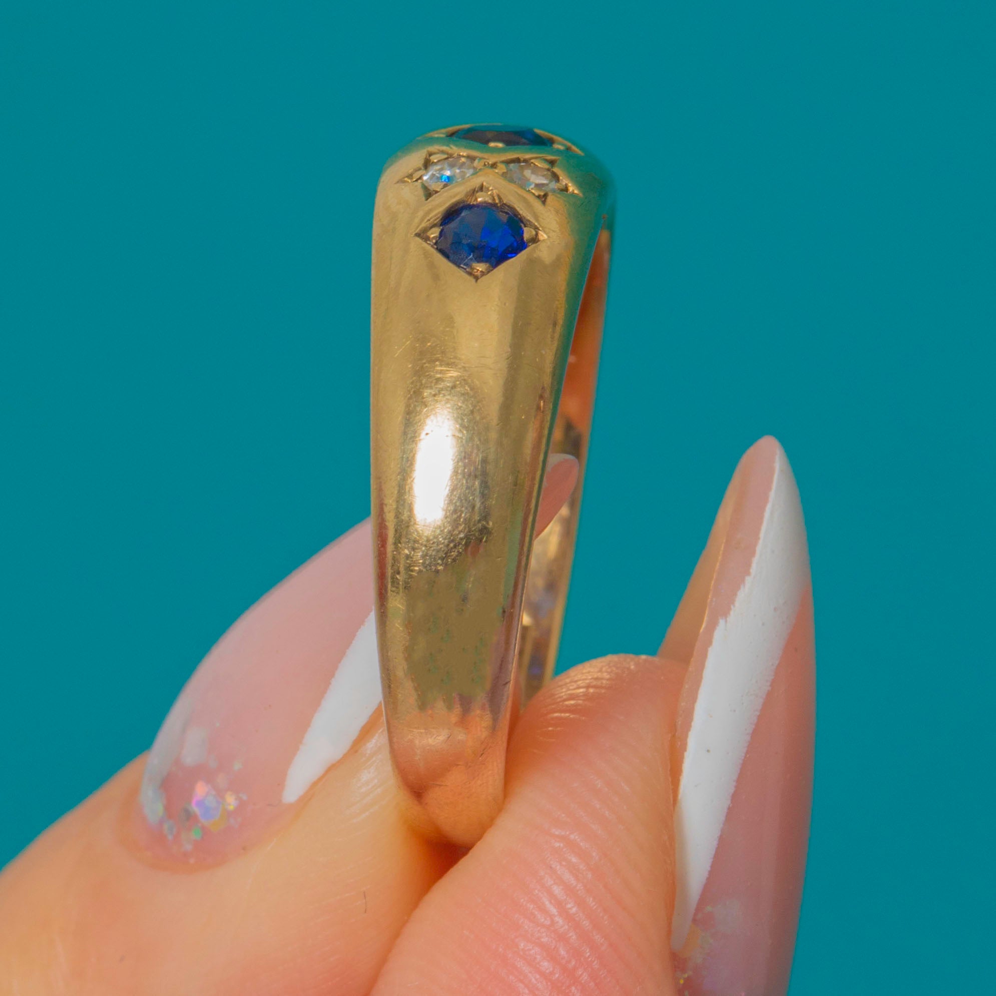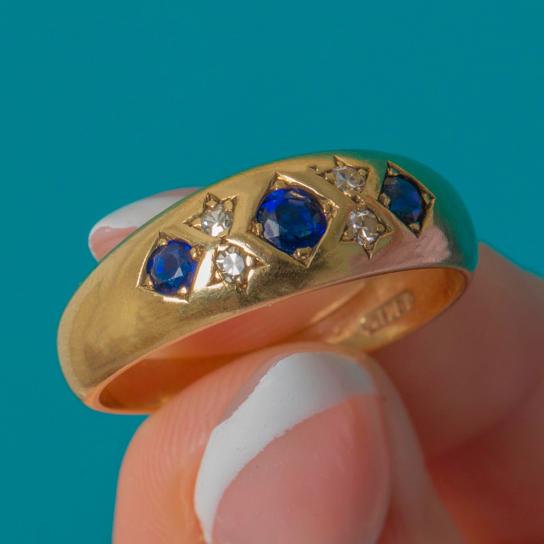EXCELLENT: The Sapphires and Diamonds are bright and securely set with no chips or visible wear. The Gold band shows only minimal surface marks in line with age and has clearly been well cared for.