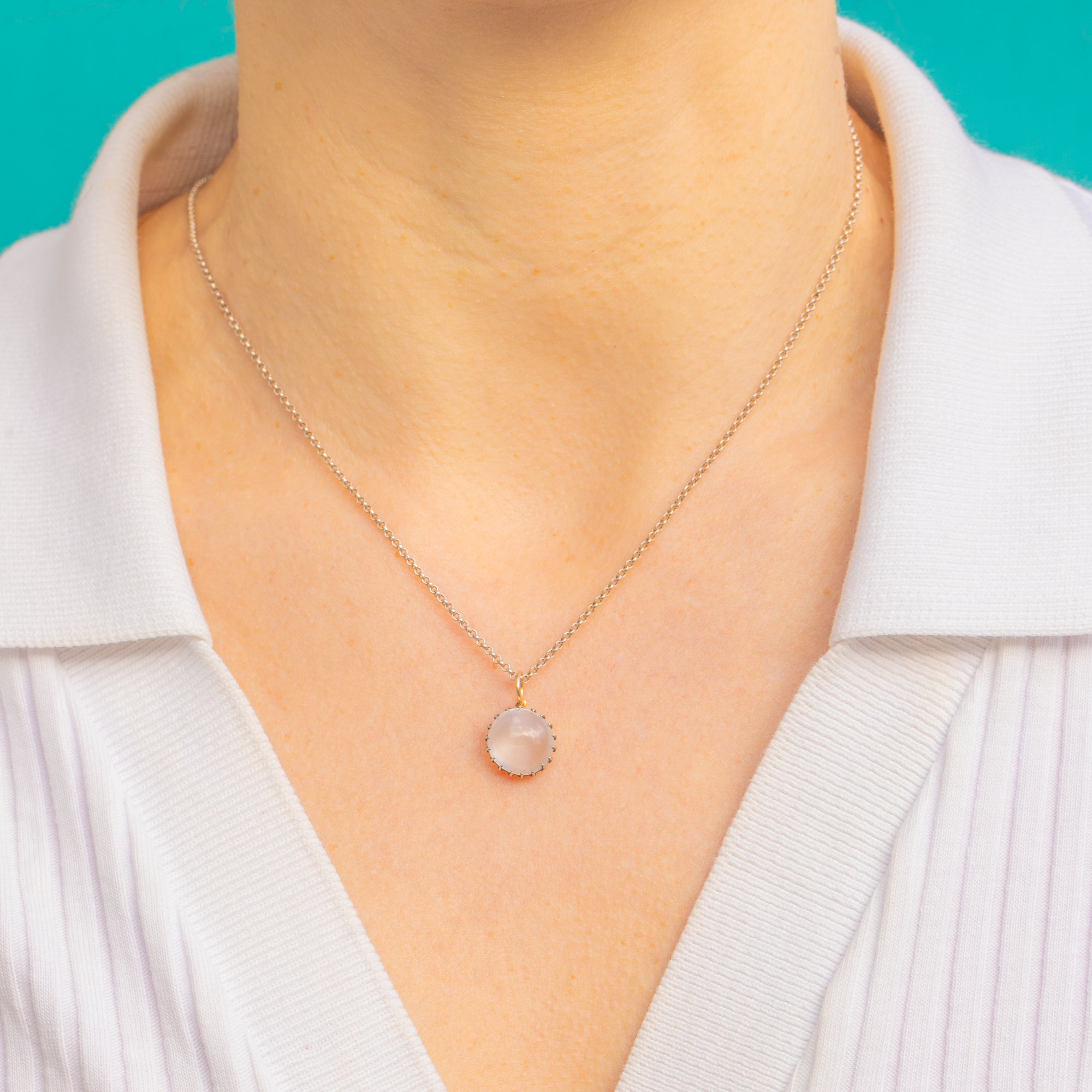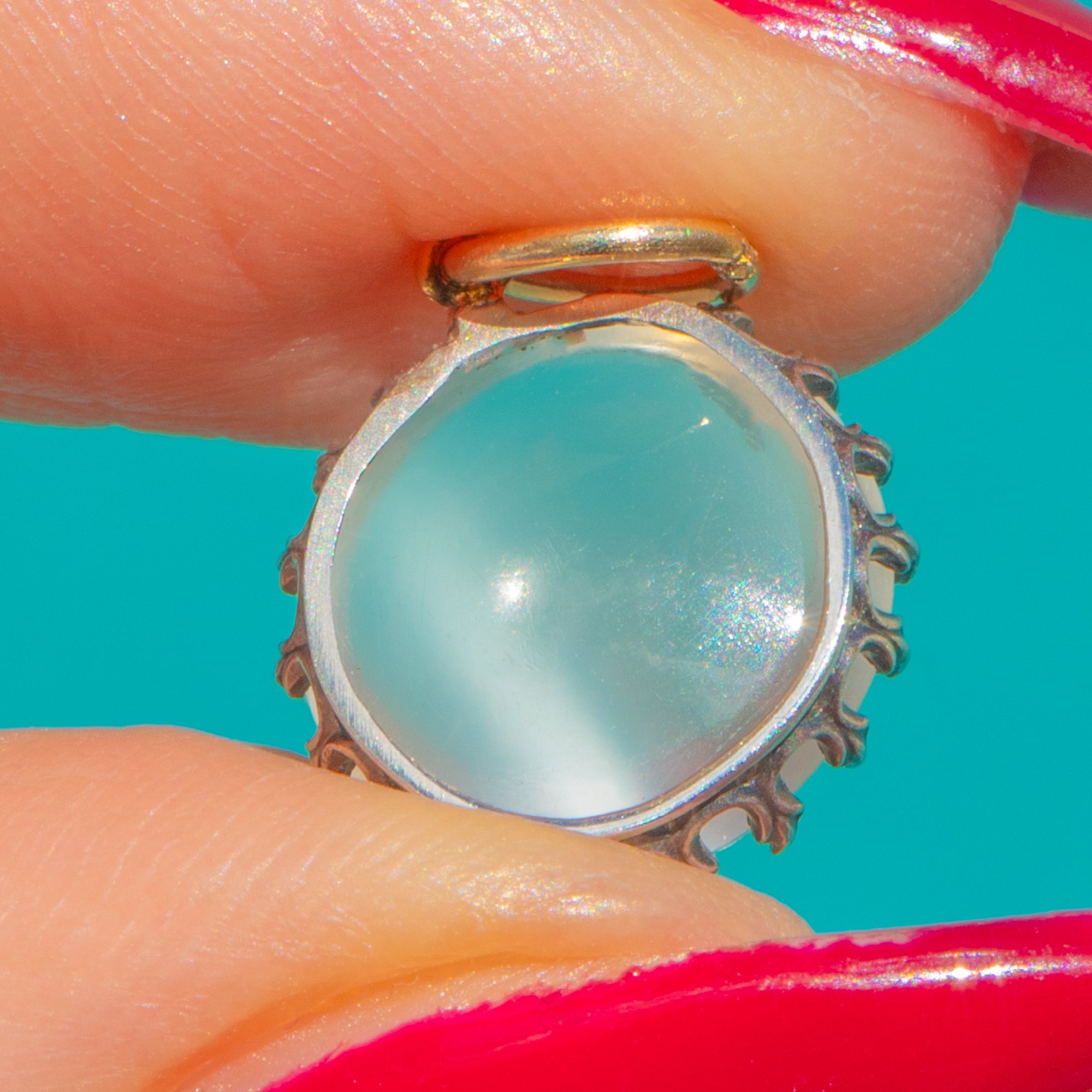A delicate Edwardian Moonstone charm with an irresistible glow. The high-domed Moonstone cabochon shimmers with soft blue-white adularescence, set in a pretty scalloped Silver claw setting for a refined, romantic silhouette. A contrasting 9ct Gold jump ring lends a subtle touch of warmth and makes this petite treasure wonderfully versatile.