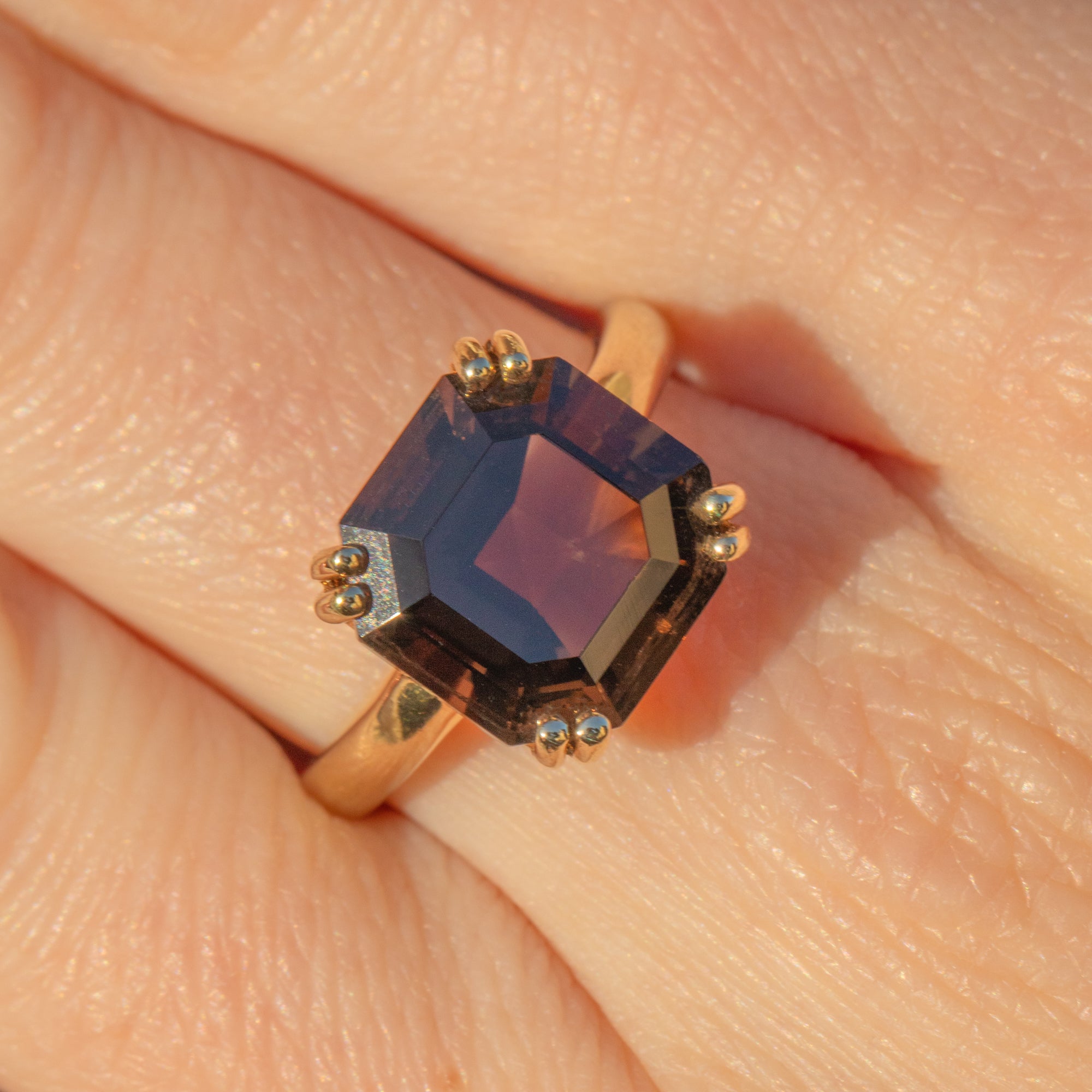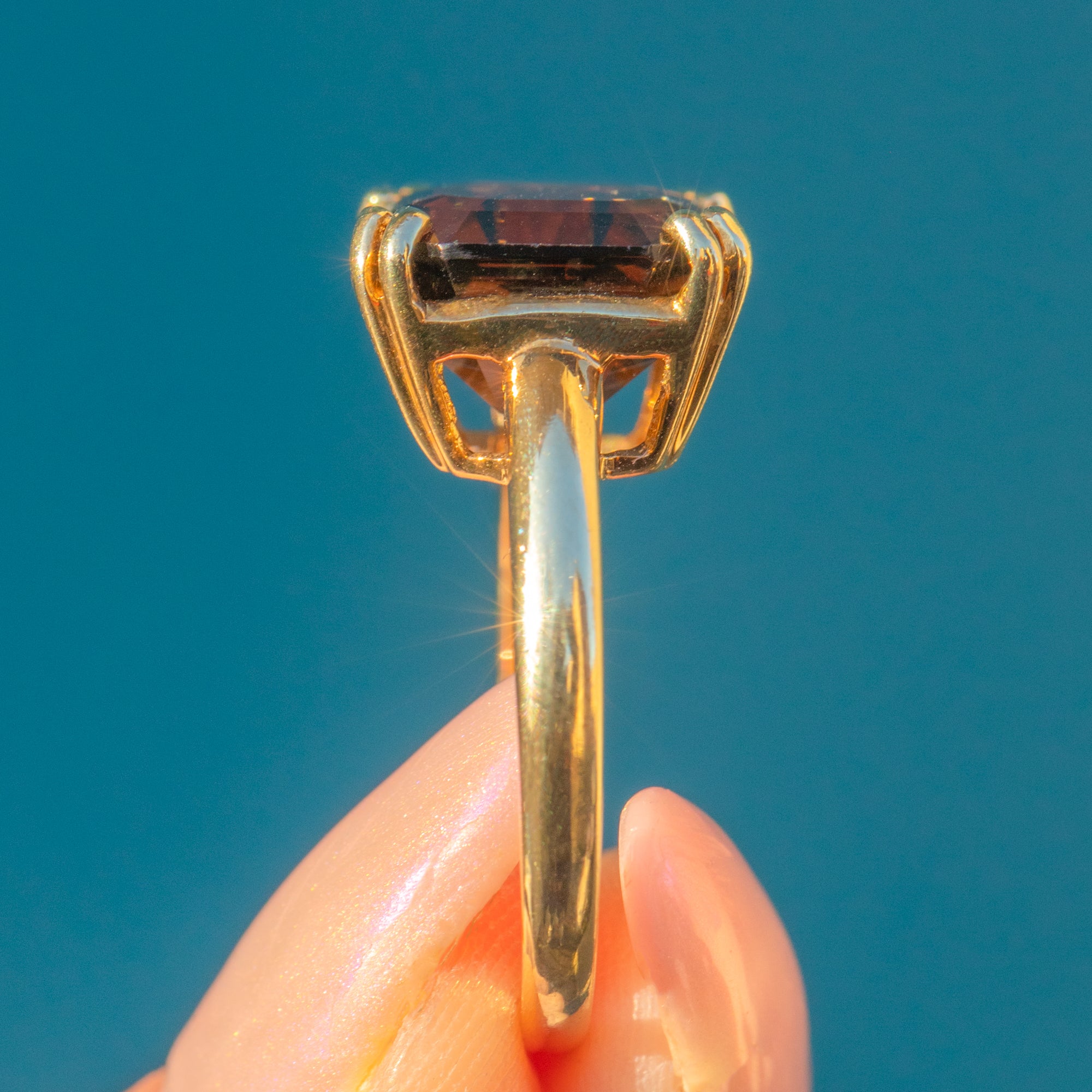 The Smokey Quartz provides wonderful finger coverage and will bestow a beautiful accent of dusky colour to any outfit. Crafted from solid 9ct Gold, the Quartz is flanked by striking tapered shoulders giving this ring an elegant finish.