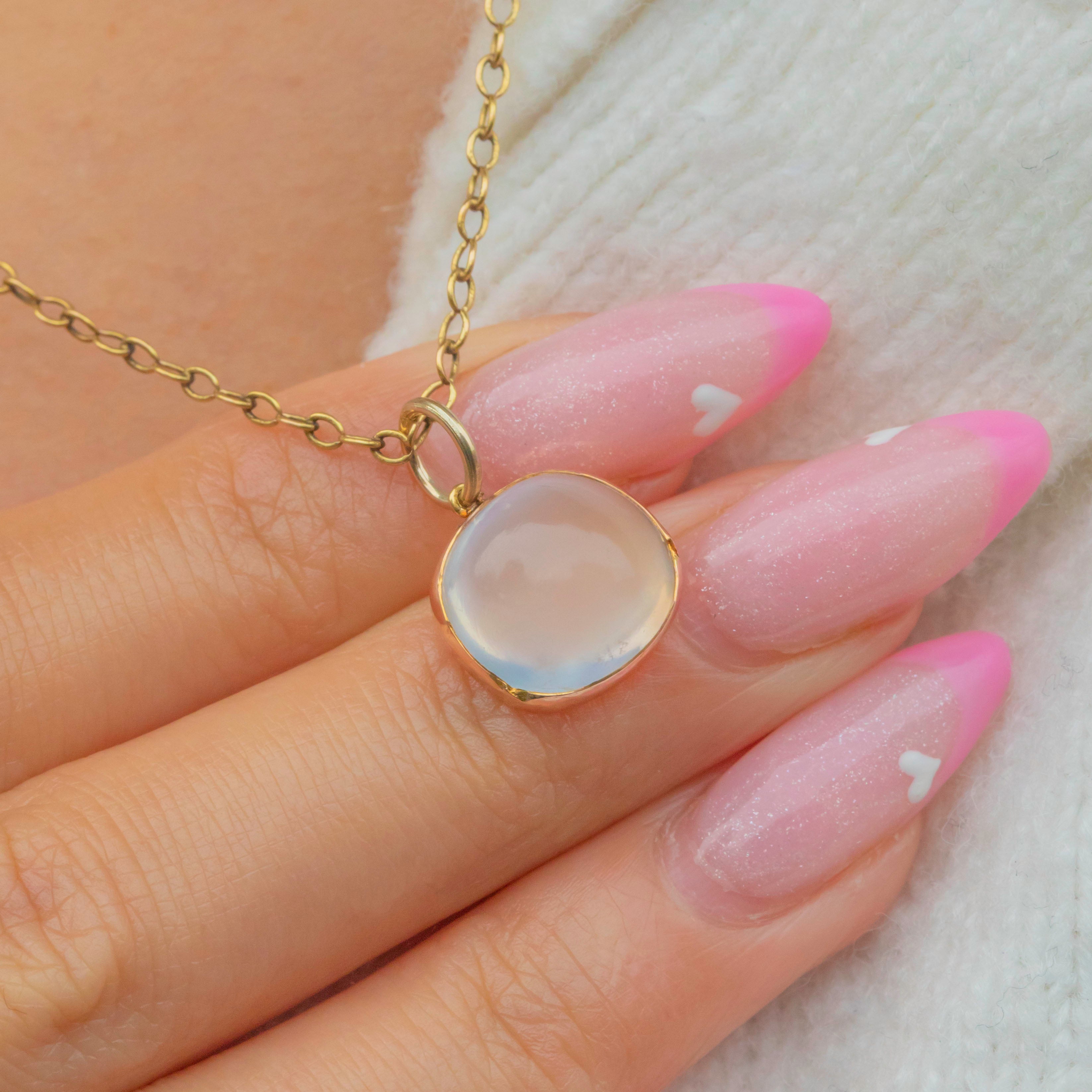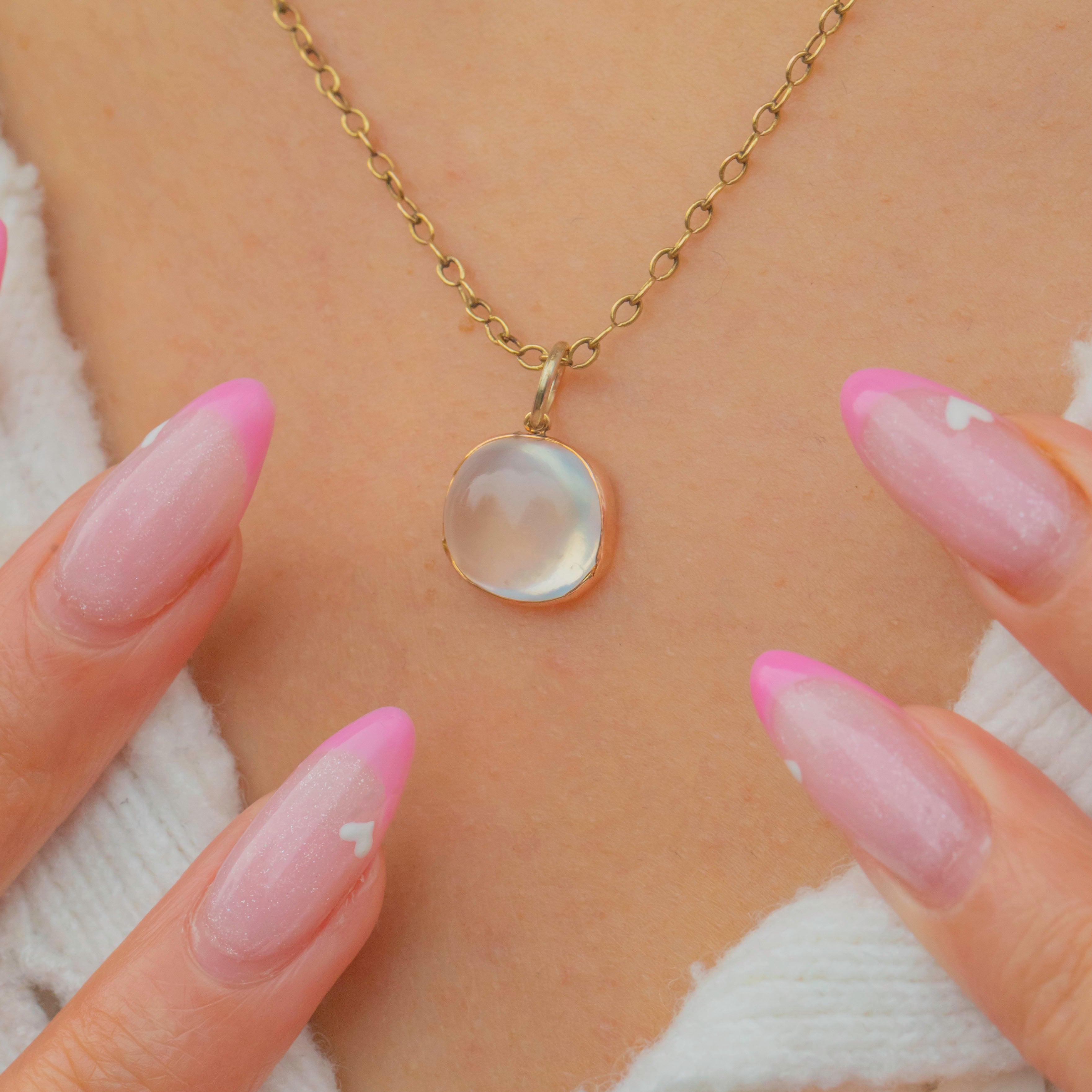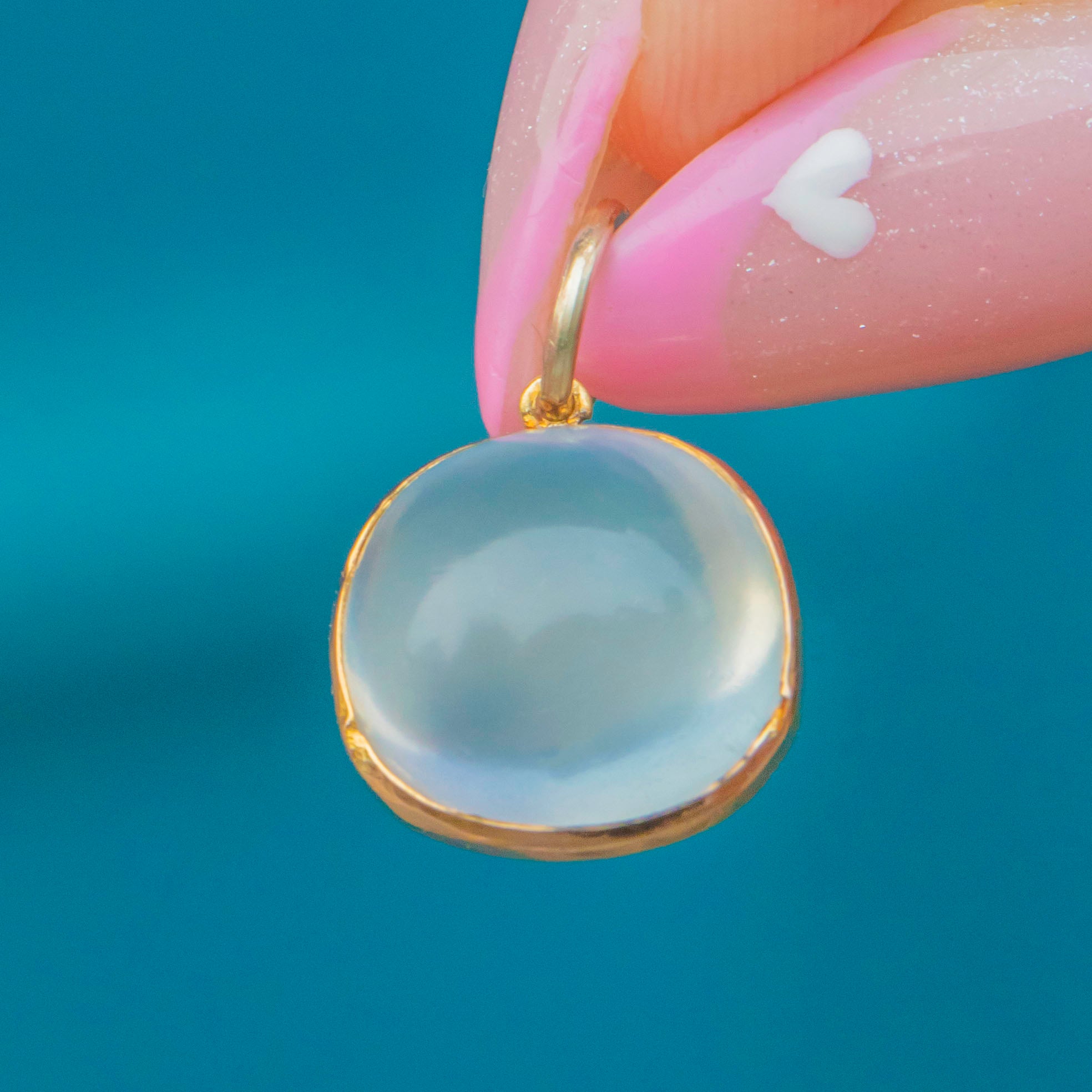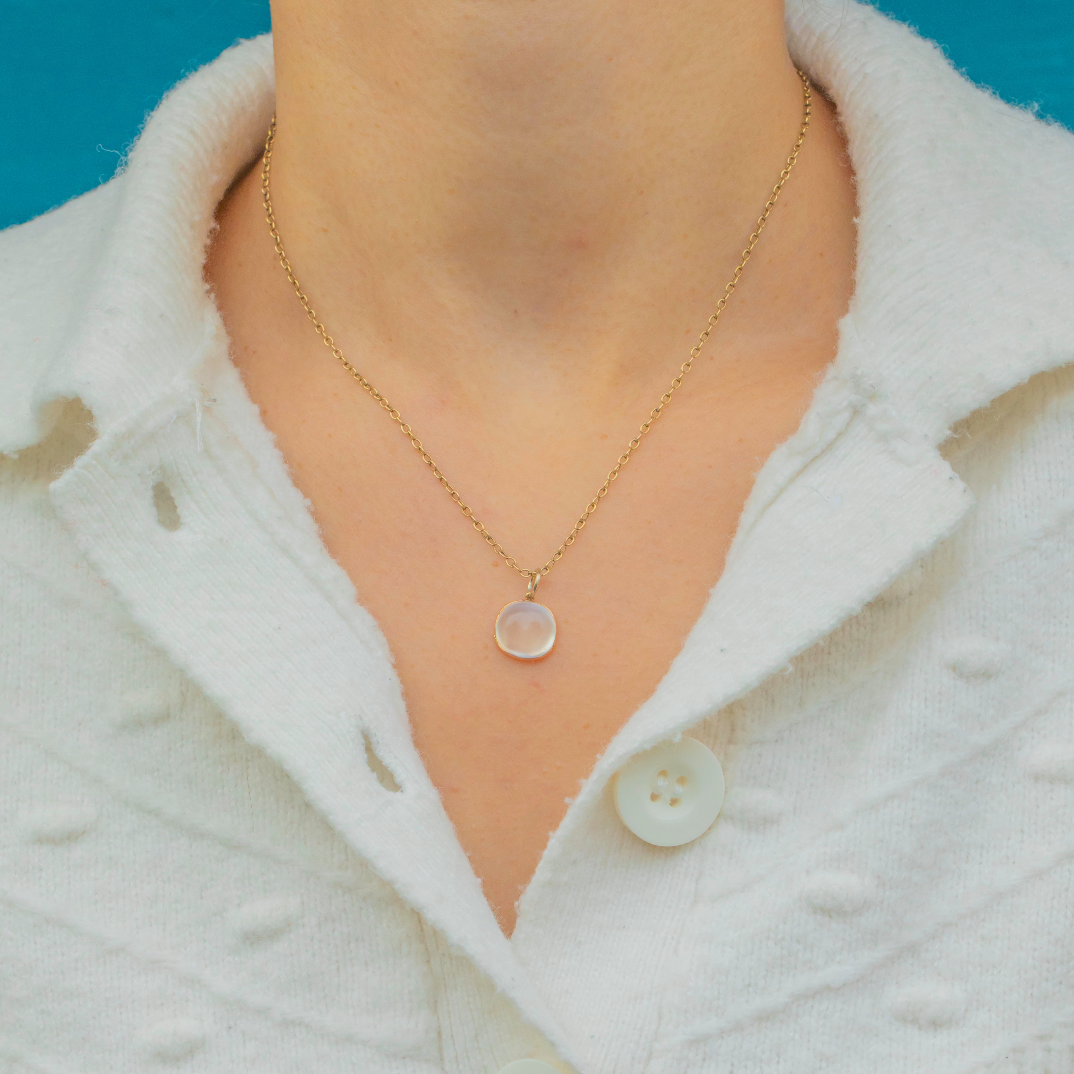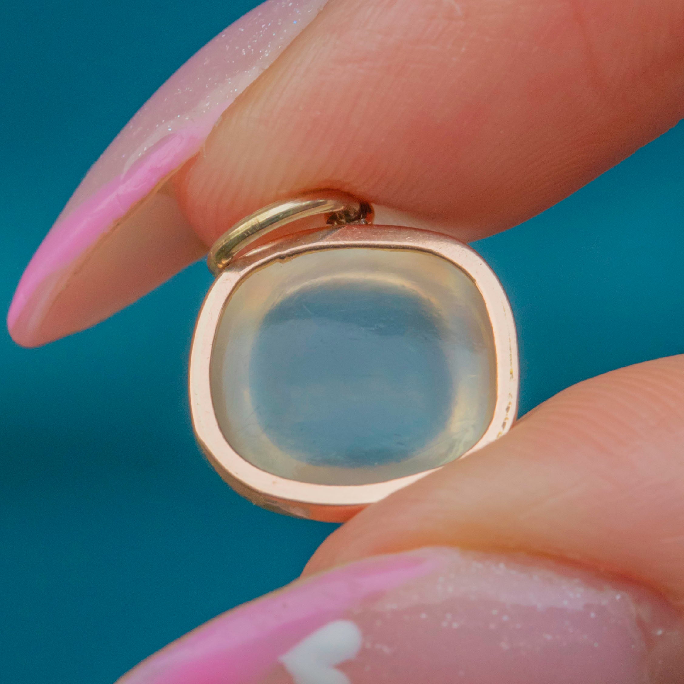 This striking antique charm showcases a glowing 1.56ct sugarloaf Moonstone in a warm 9ct Gold setting. The Moonstone’s ethereal blue sheen dances across its domed surface, radiating that unmistakable antique charm and serenity the gem is loved for.