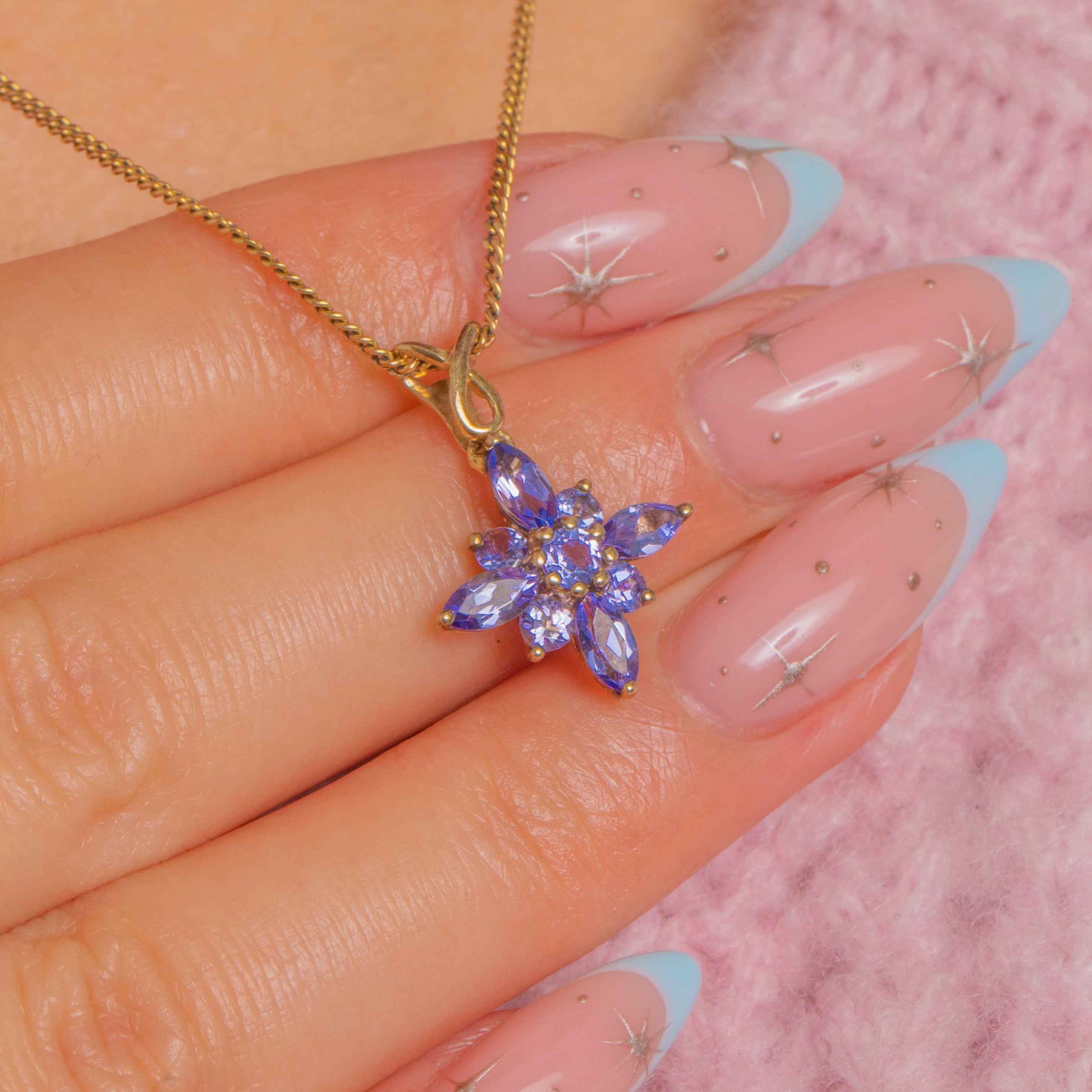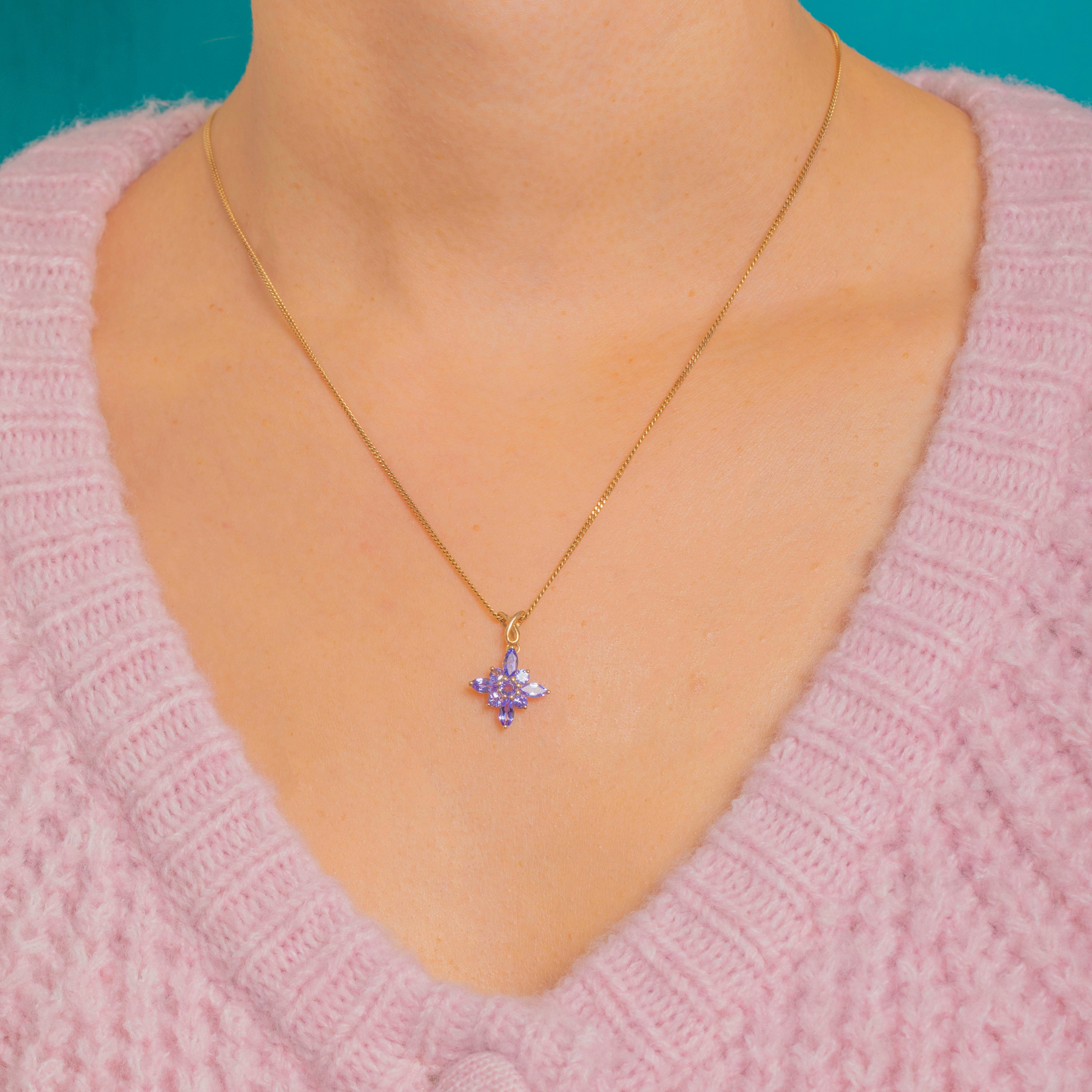 Dainty and dazzling, this 9ct Gold Tanzanite “star” charm blooms with lilac-violet sparkle. Marquise-cut “petals” radiate around a petite round centre to form a chic floral starburst, all neatly claw-set to catch the light beautifully.