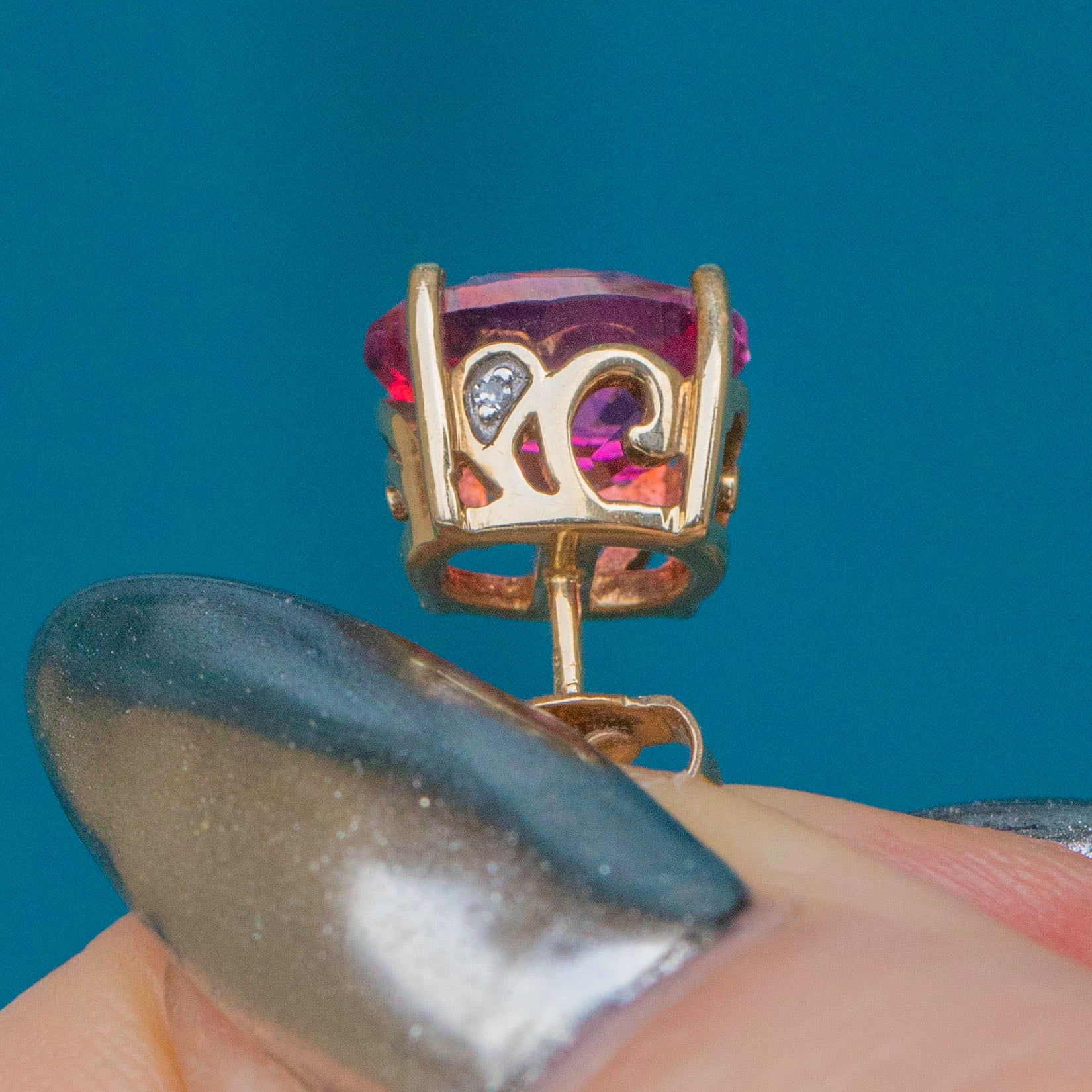 Crafted from solid 9ct Gold, each Topaz is displayed within an ornate, Diamond-studded gallery, allowing the light to stream through the crisp cut facets revealing flashes of pink as they gracefully adorn your ears.