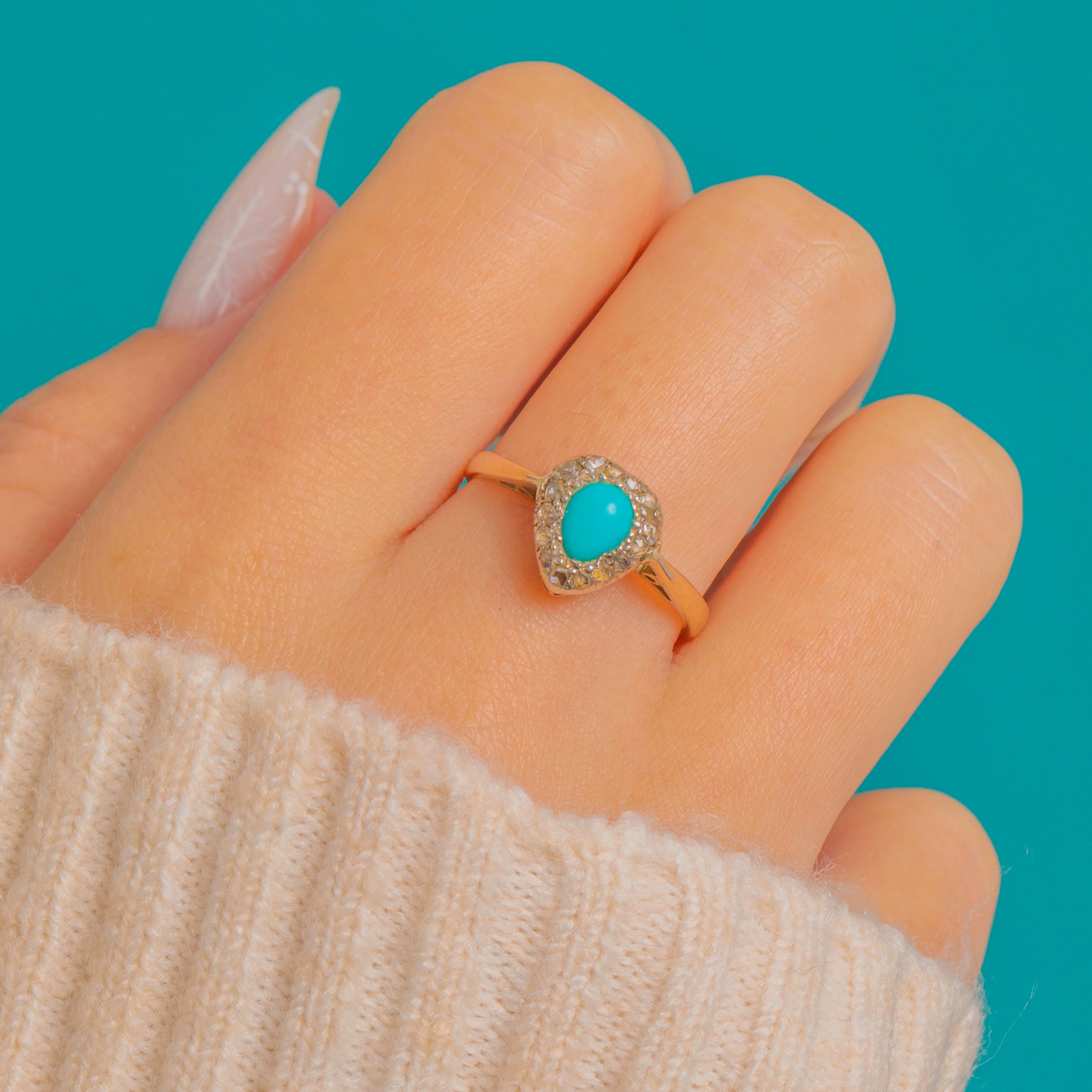 A darling heart cluster ring that marries vibrant colour with timeless sparkle. At its centre sits a bright Turquoise cabochon, framed by a scalloped halo of glinting Rose Cut Diamonds set in cool Platinum for that beautiful “white-topped” contrast against the warm 9ct Gold band.