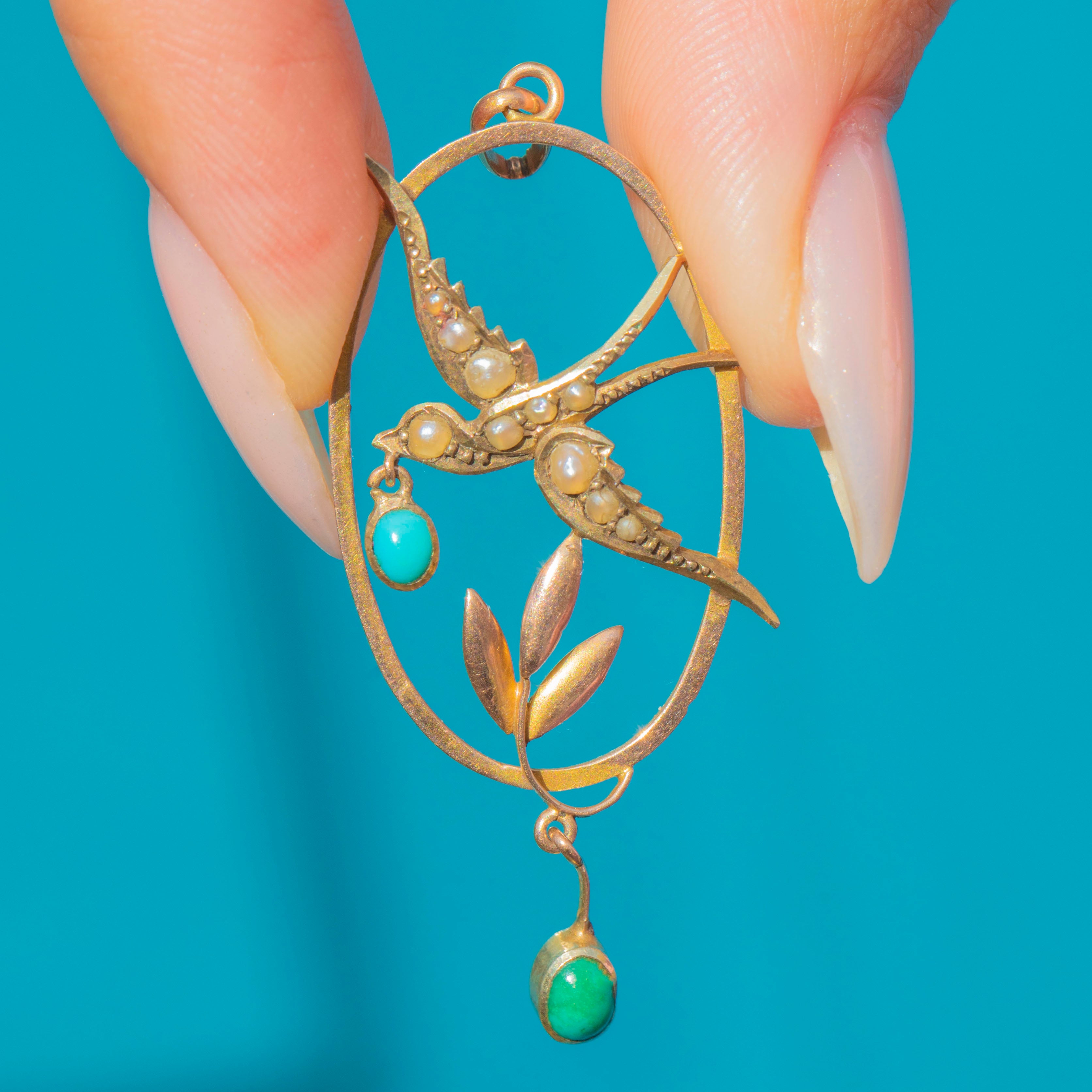 An enchanting Edwardian pendant, c.1900, crafted in 9ct Gold in the form of a charming Swallow bird. The design features delicate Pearls and a symbolic "Olive Branch" in Turquoise, one suspended from the bird's beak and another as a drop below.