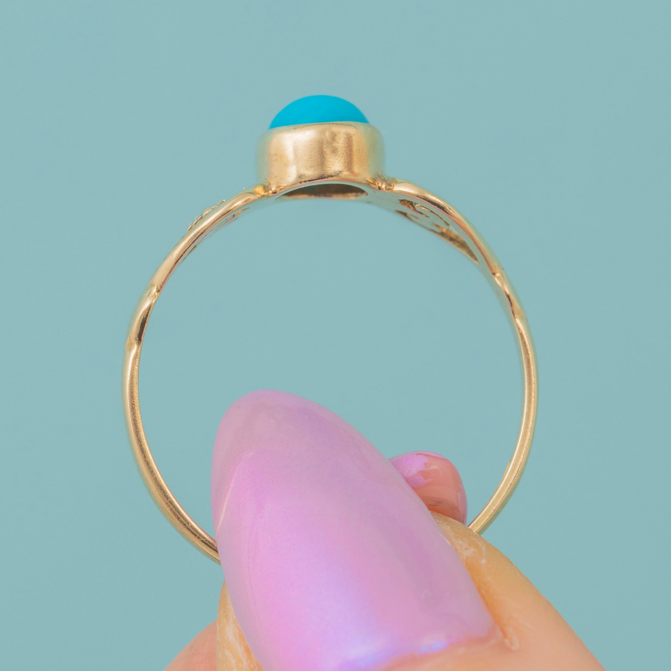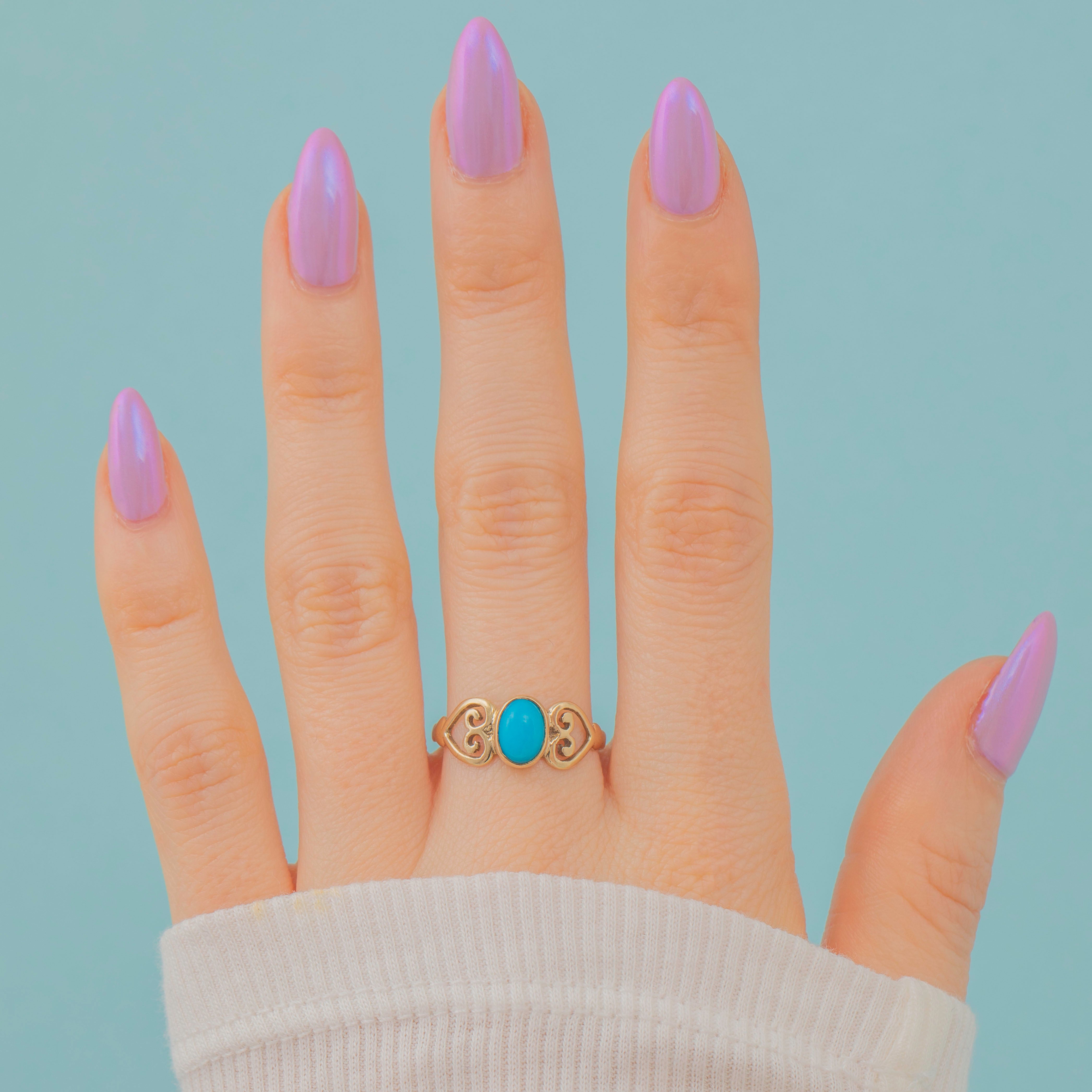 This beautiful 9ct Gold Turquoise ring will bring a pop of colour to your repertoire! This vintage treasure features a striking Turquoise gemstone at her centre with a vibrant blue-green hue.