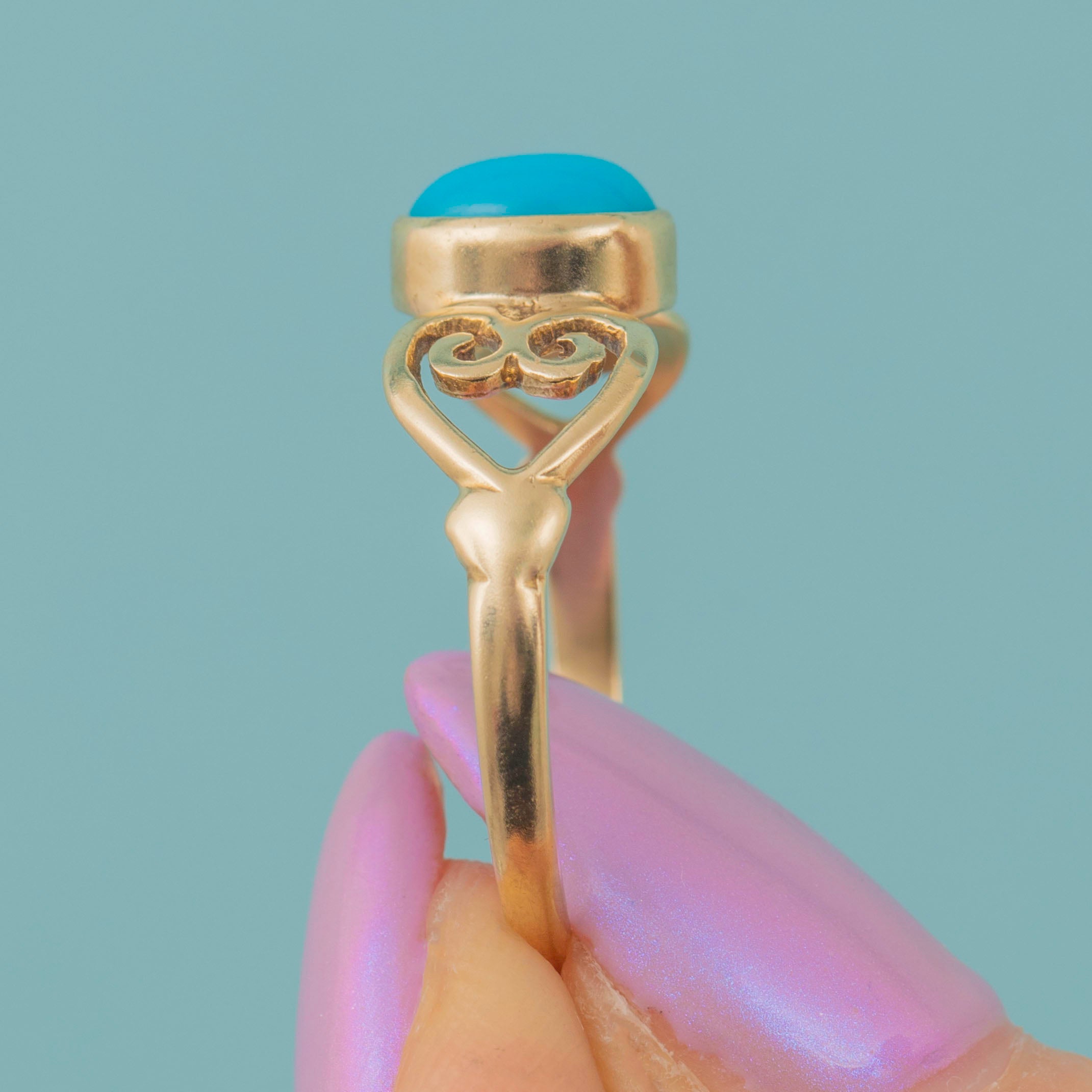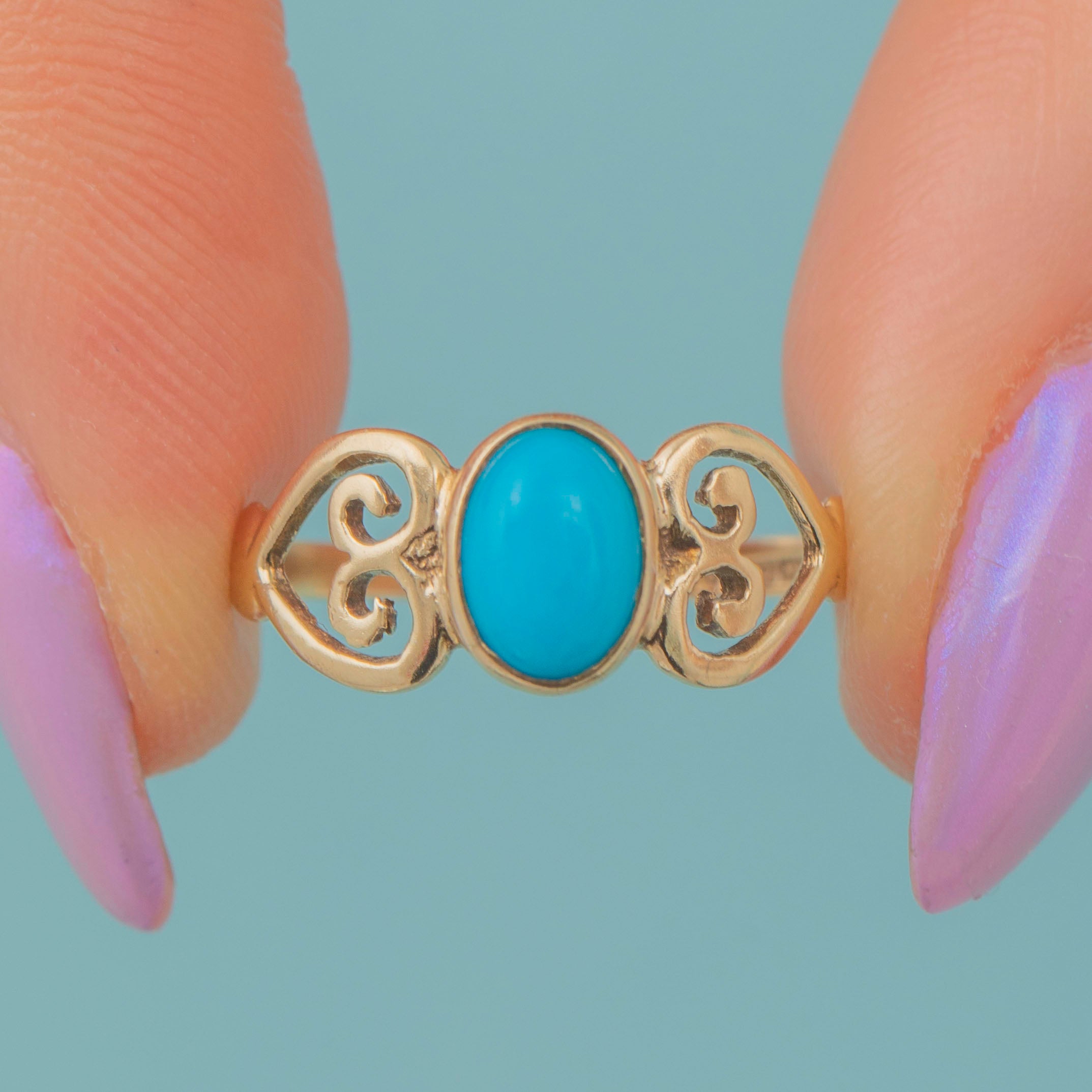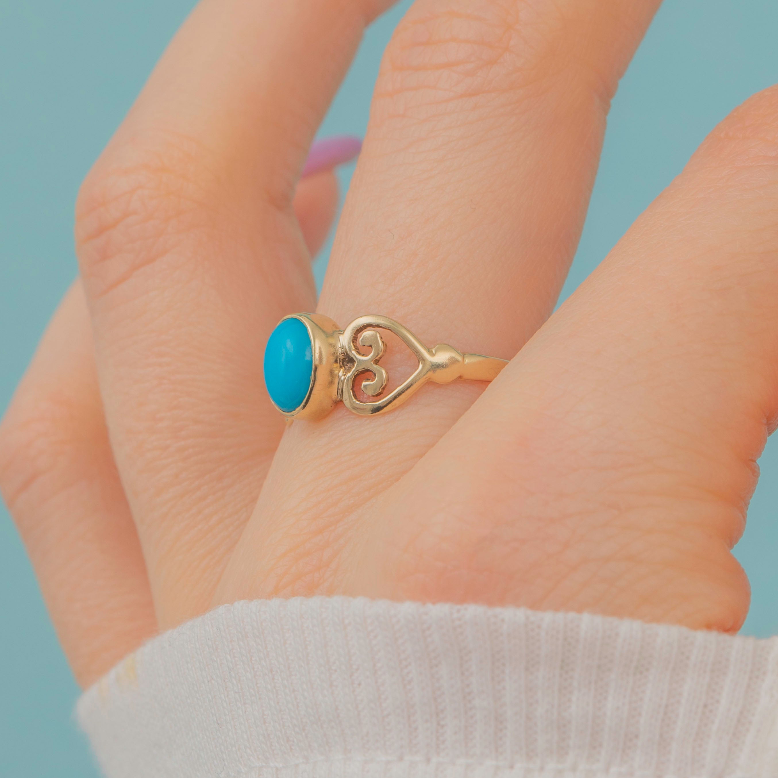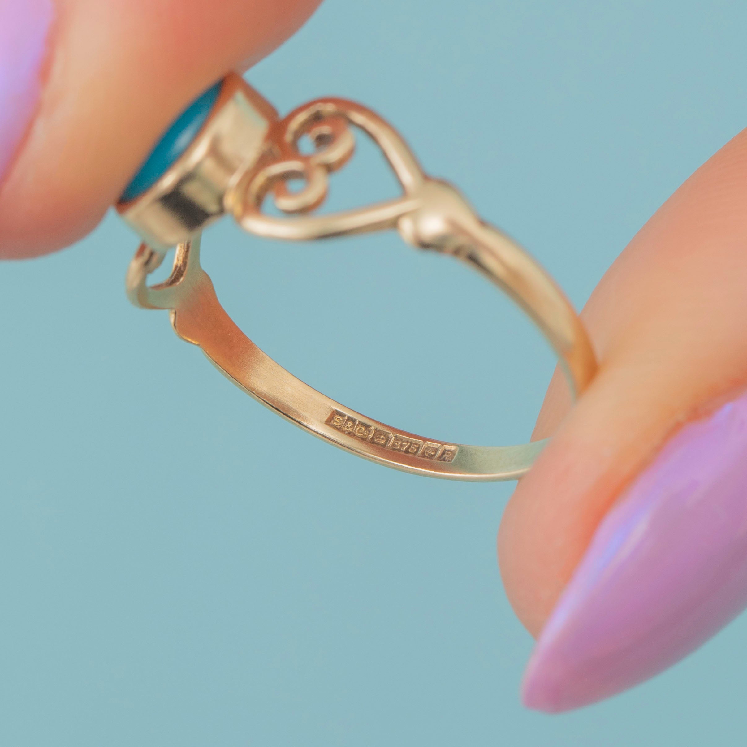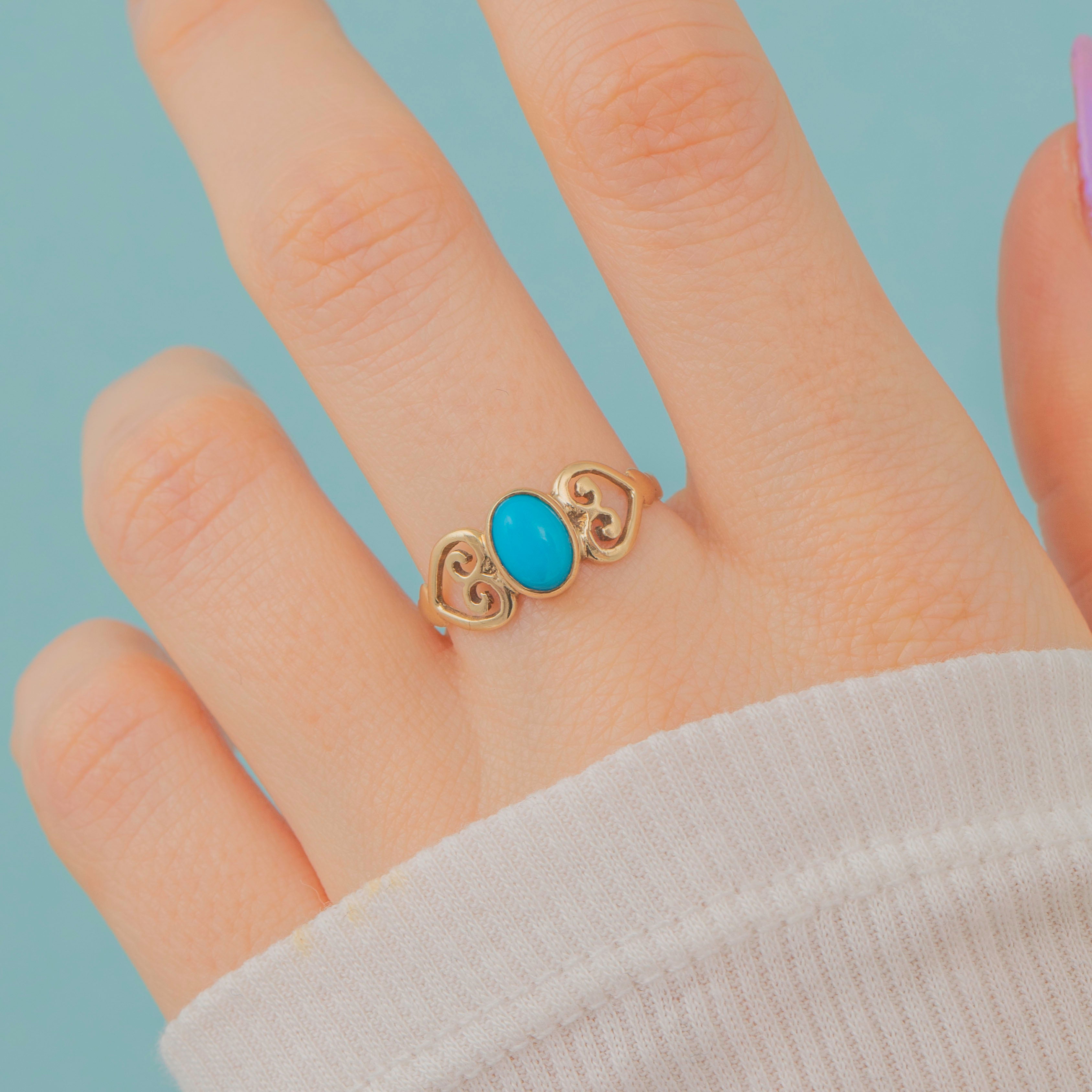 9ct Gold Turquoise Ring with Heart Openwork Shoulders