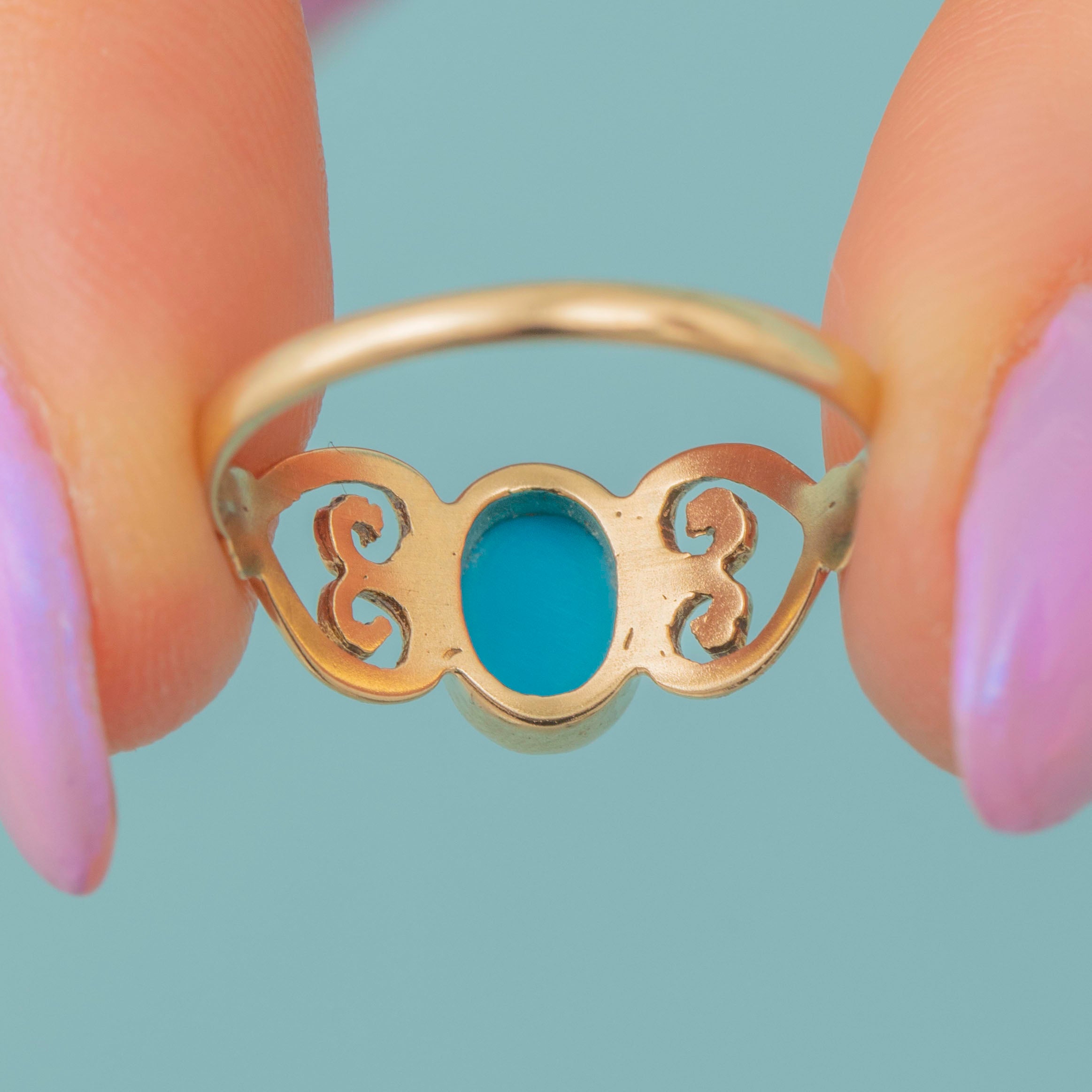 EXCELLENT. With very little to report, this 9ct Gold Turquoise ring is in excellent condition. Her Turquoise is perfectly smooth with the most gorgeous bright blue tone. Her Gold is glossy and gleaming, perfectly bright! She is such a wonder!