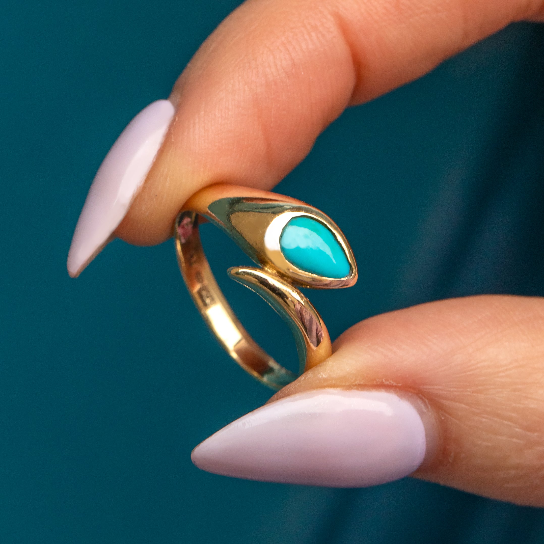 This striking 9ct Gold Turquoise snake ring will make a unique addition to your curated ring stack! Buttery 9ct Gold forms the snake's body, wrapping around your finger with undeniable luxury.