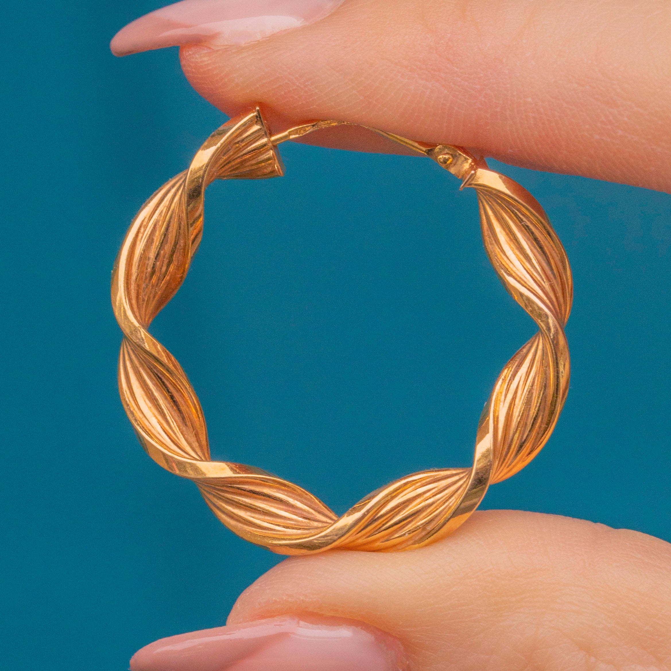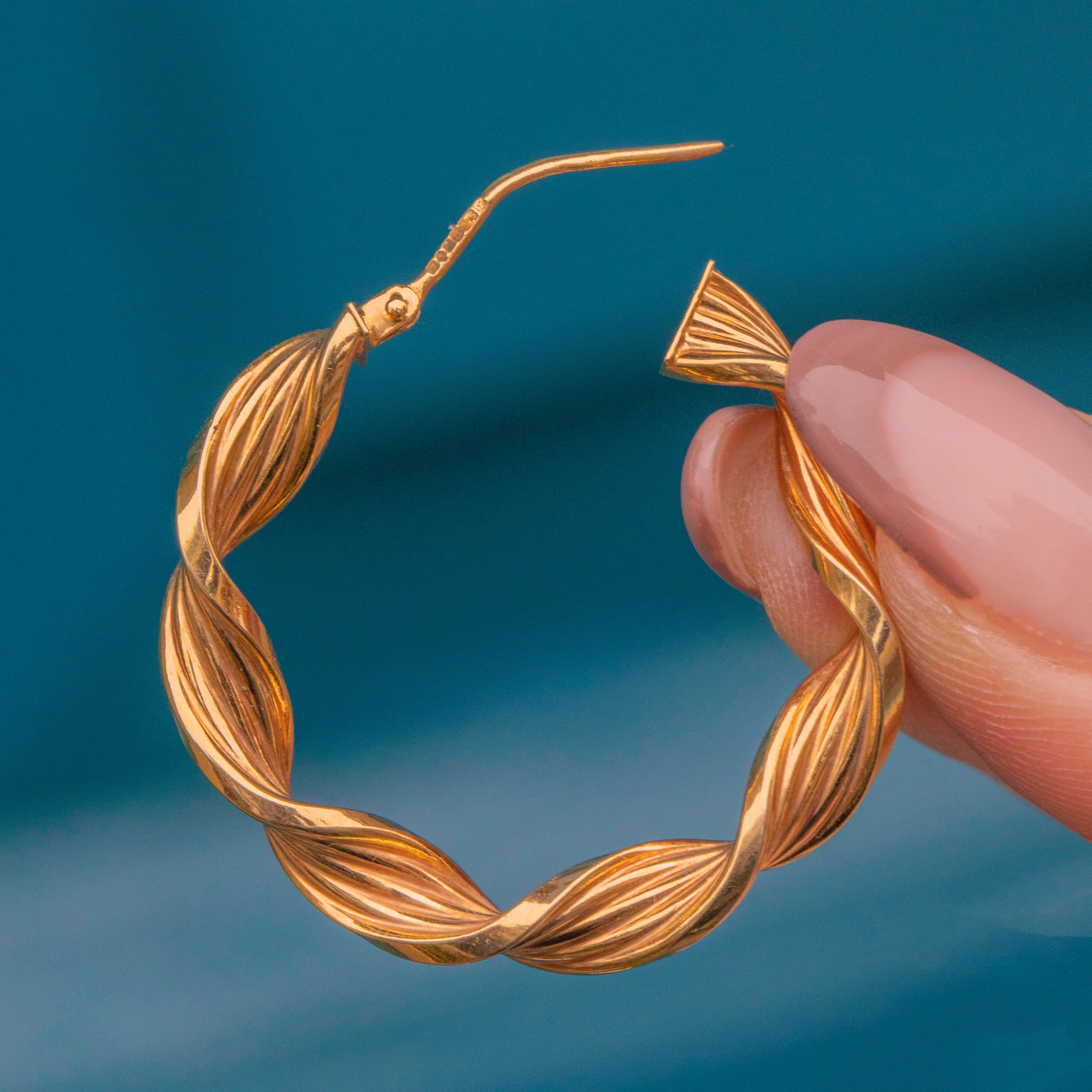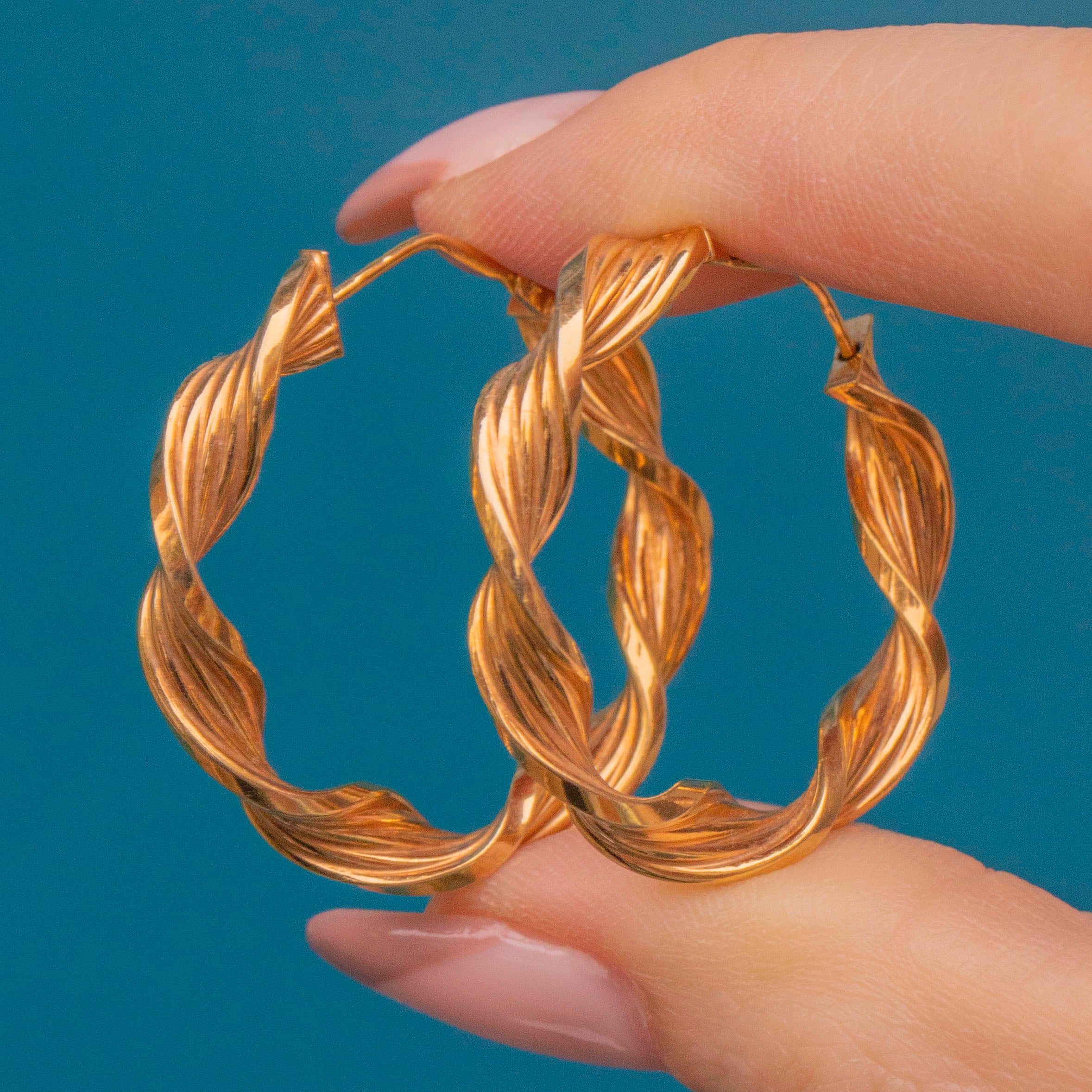 If you're looking for a pair of statement Gold hoops for everyday wear, these 9ct Gold twisted hoop earrings are a must-have! Crafted from solid 9ct Gold, these vintage hoop earrings have been formed into a striking twist design with engraved details that catch the light magnificently.